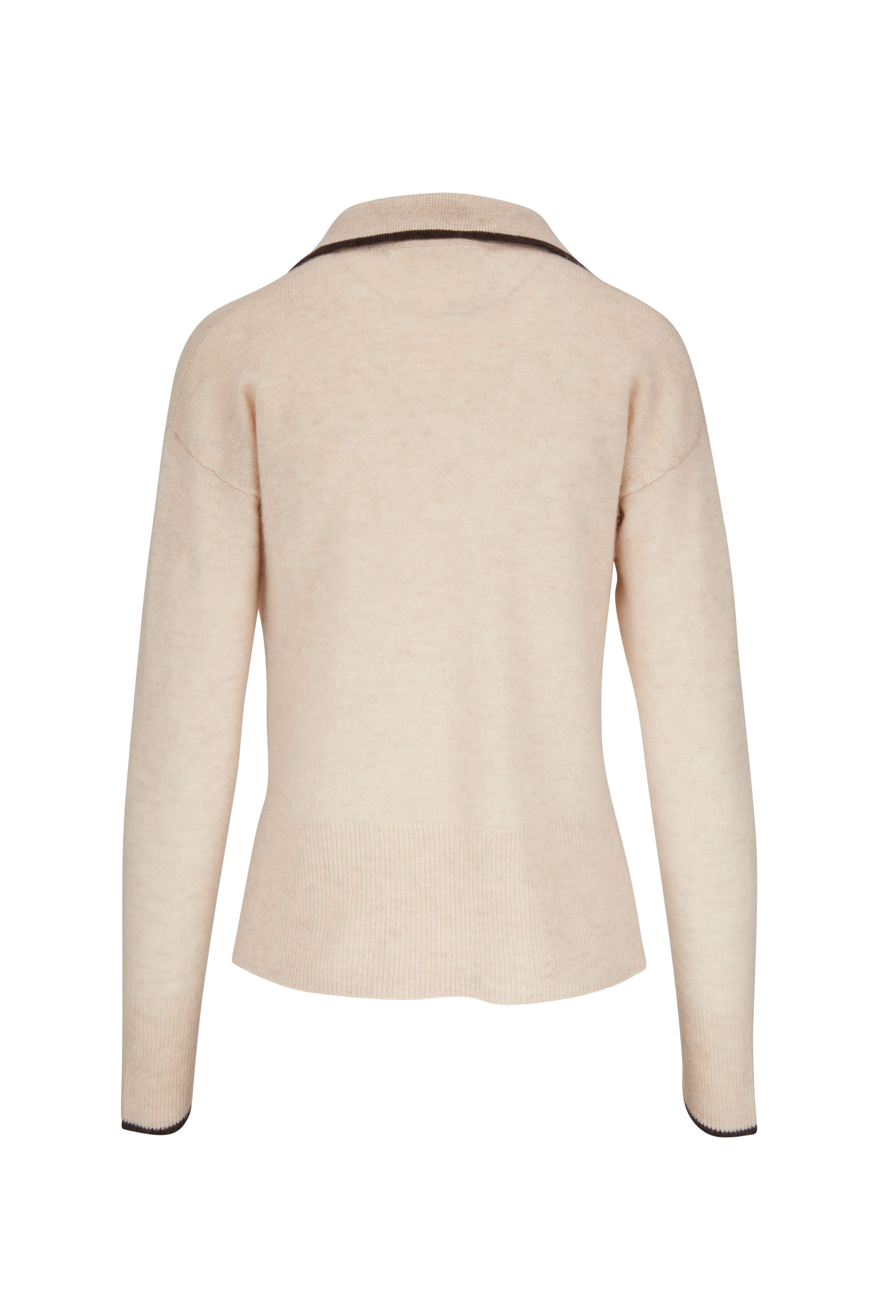 Johnny collar. Ribbed trims. Imported. 100% cashmere. Dry clean.