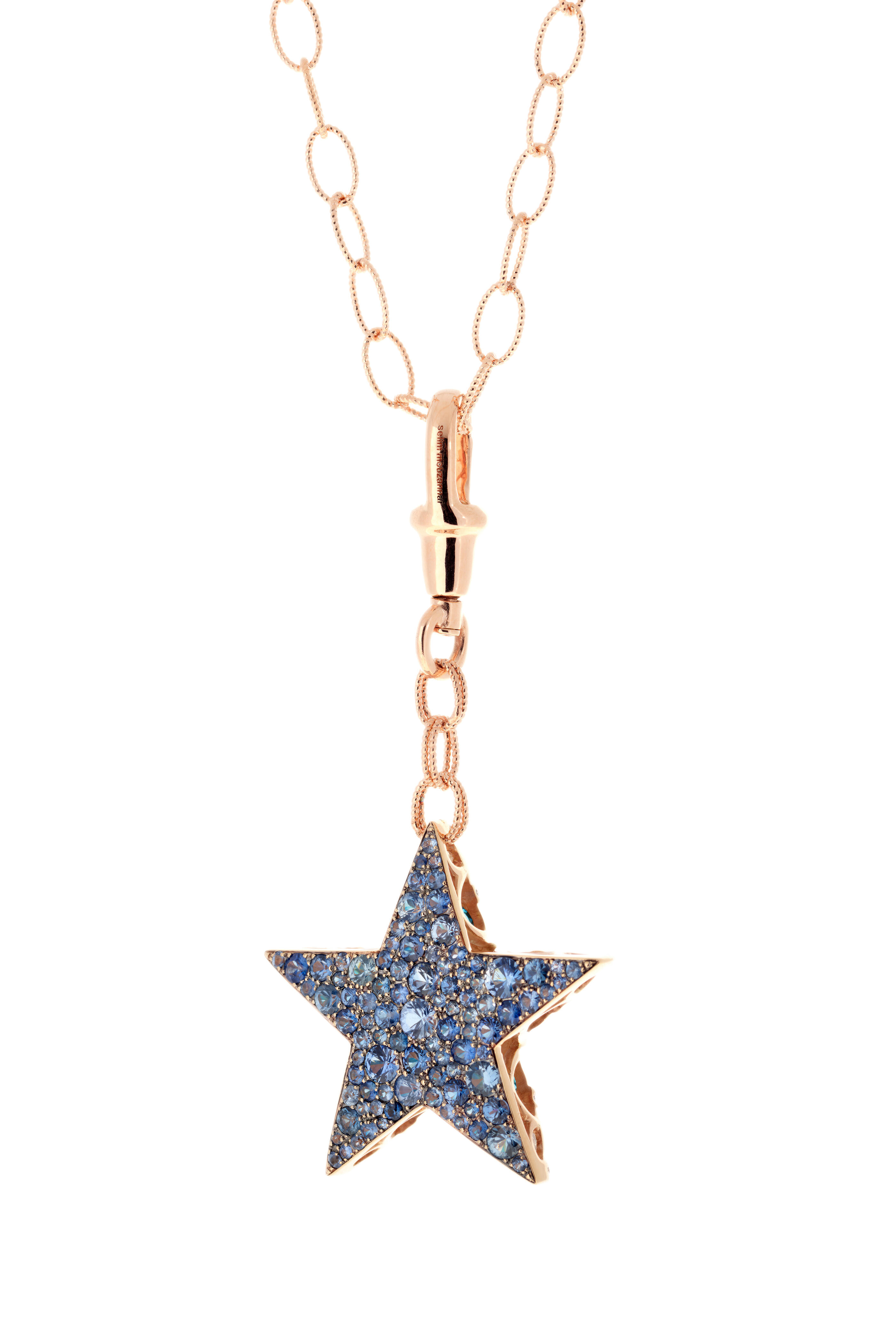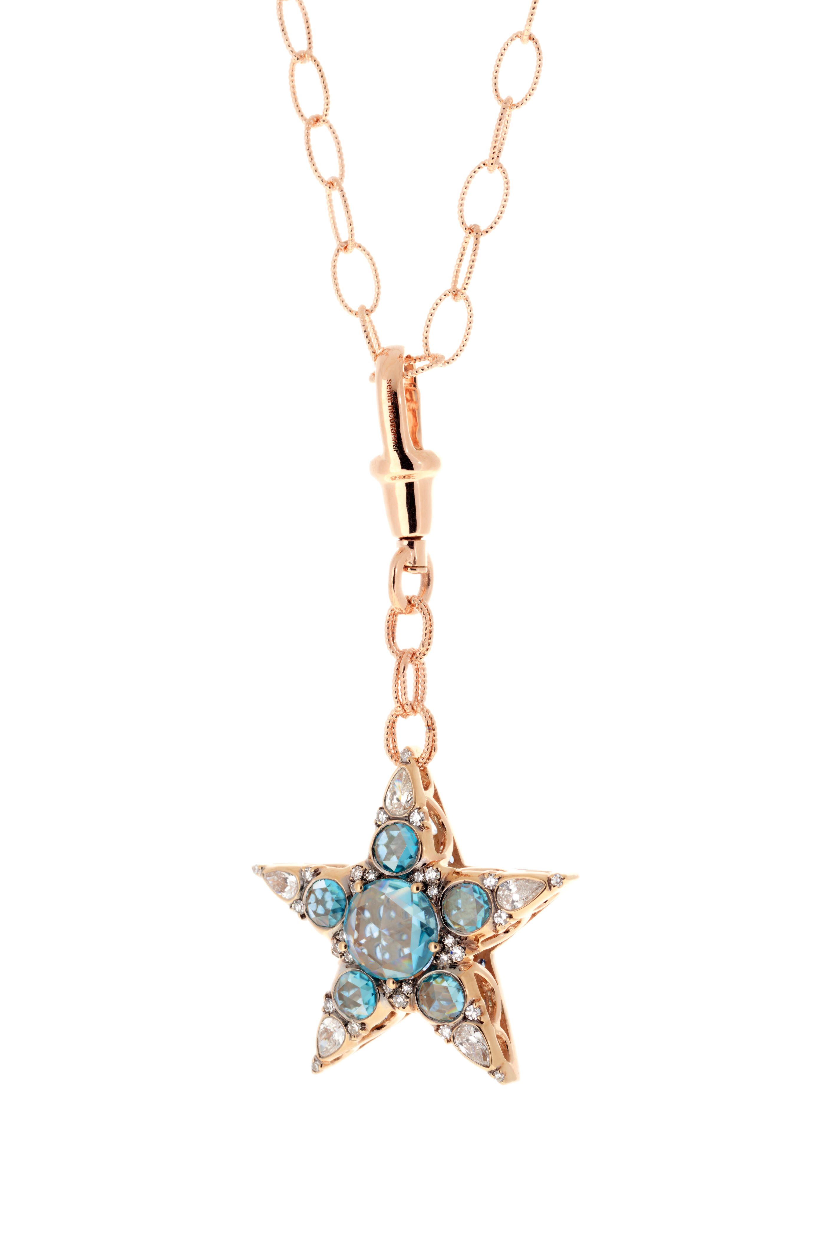 Rose gold. .61 carat diamonds. 2.26 carat blue sapphires. 4.03 carat hyacinth.