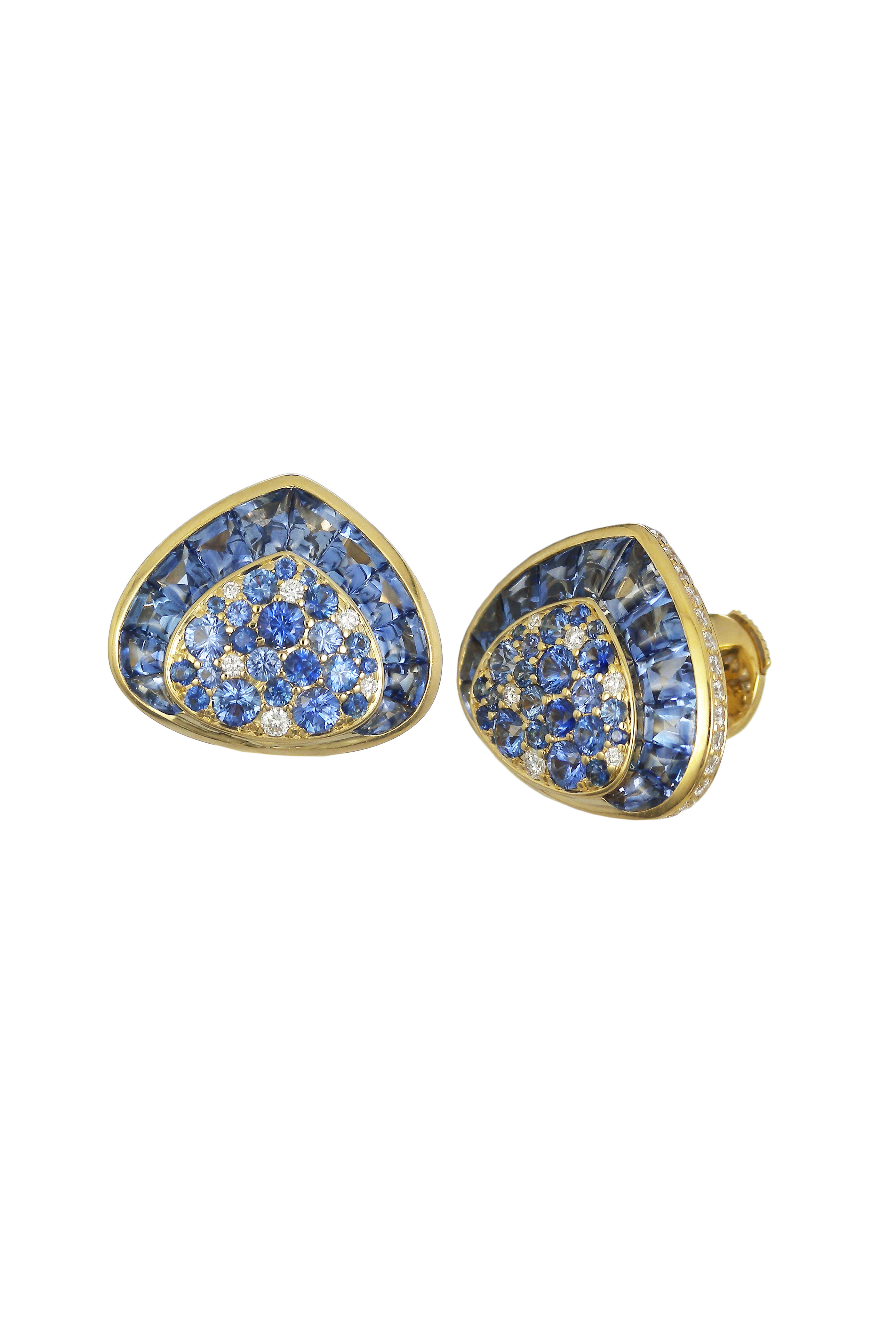 18k yellow gold. 4.30 carat blue sapphires. .64 carat white diamonds.