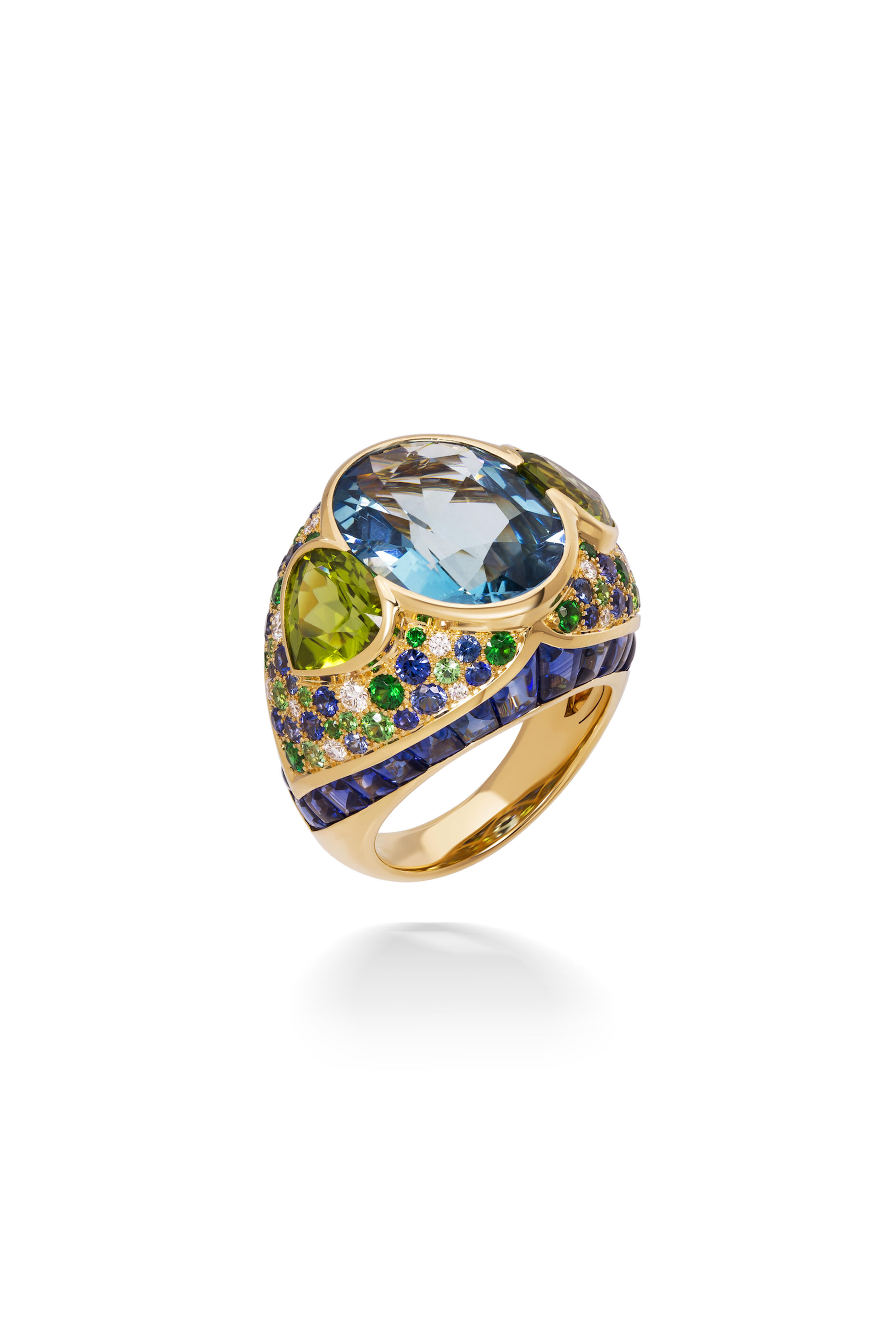 18k yellow gold. 8.41 carat aquamarine. 3.94 carat peridot. Size 6.
