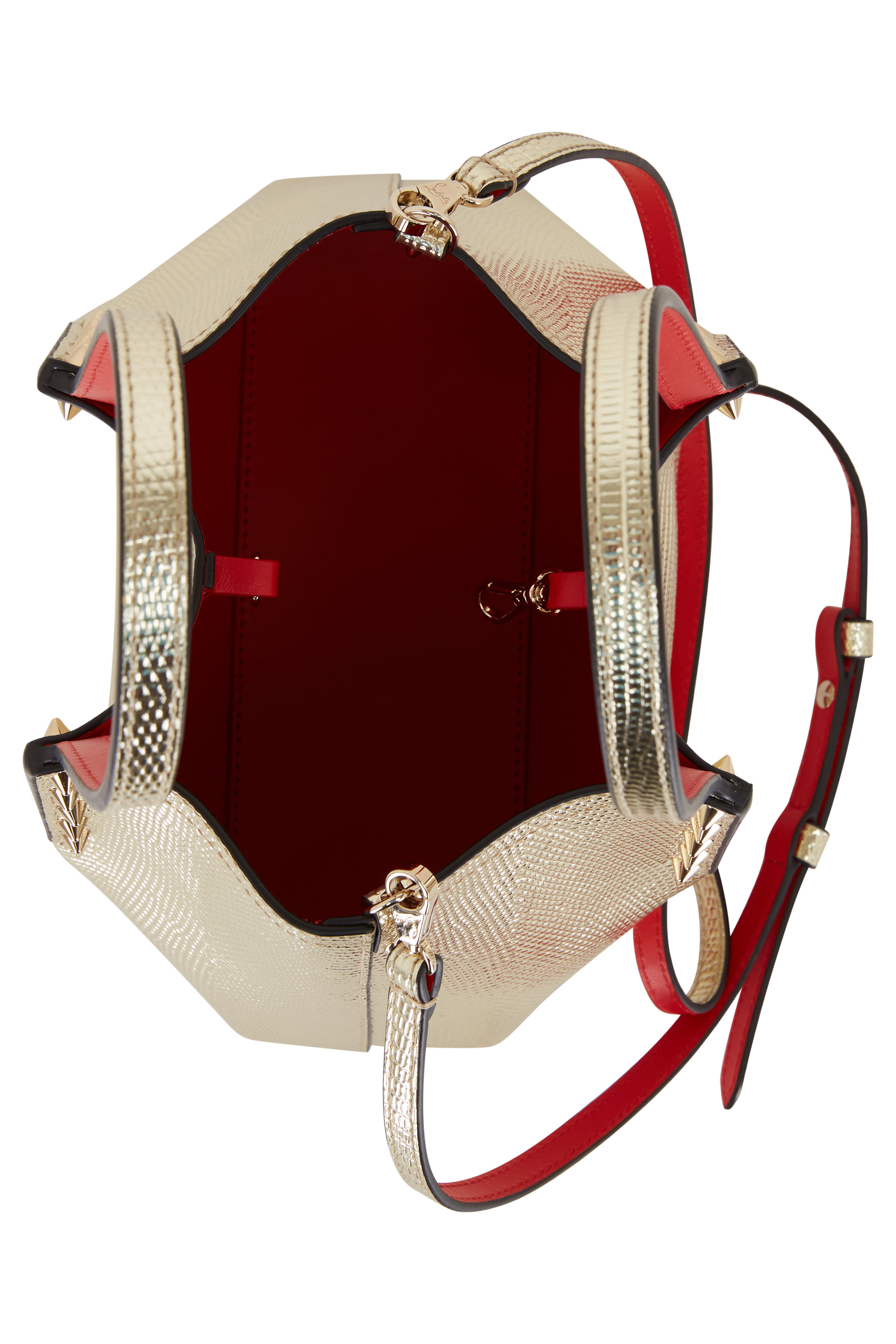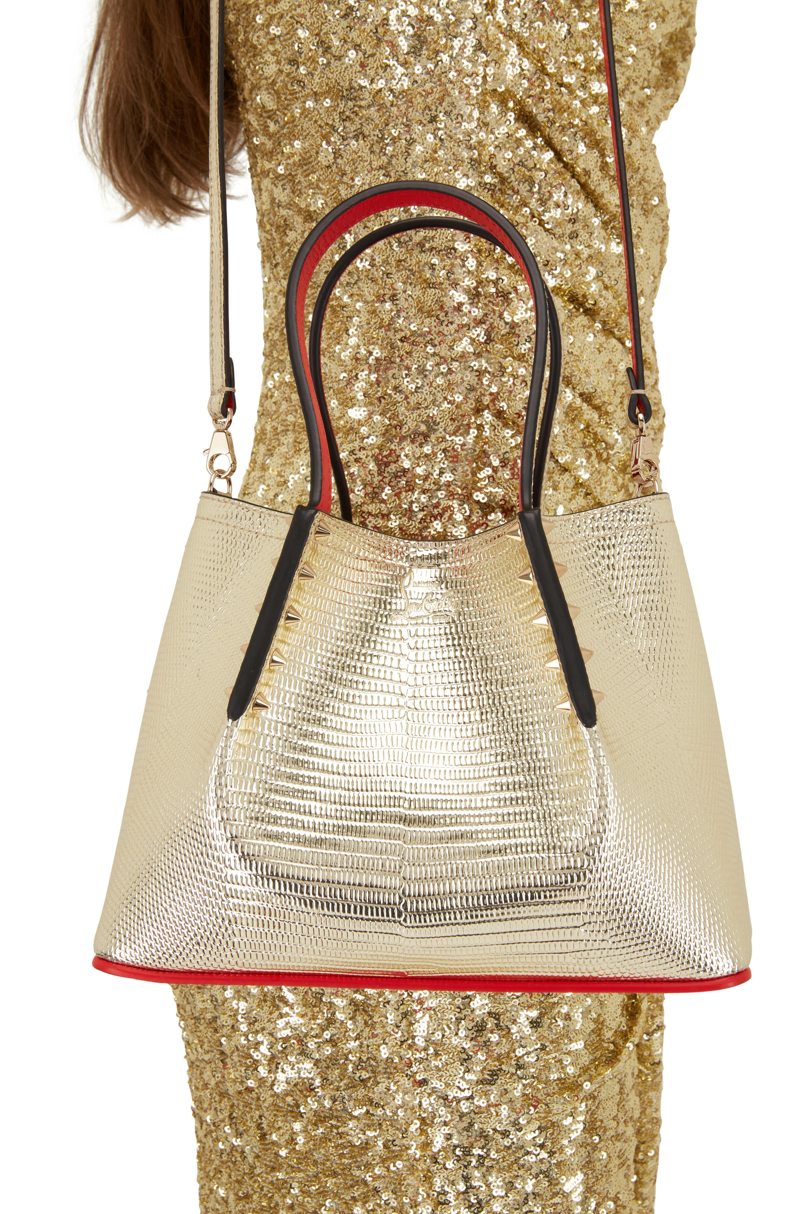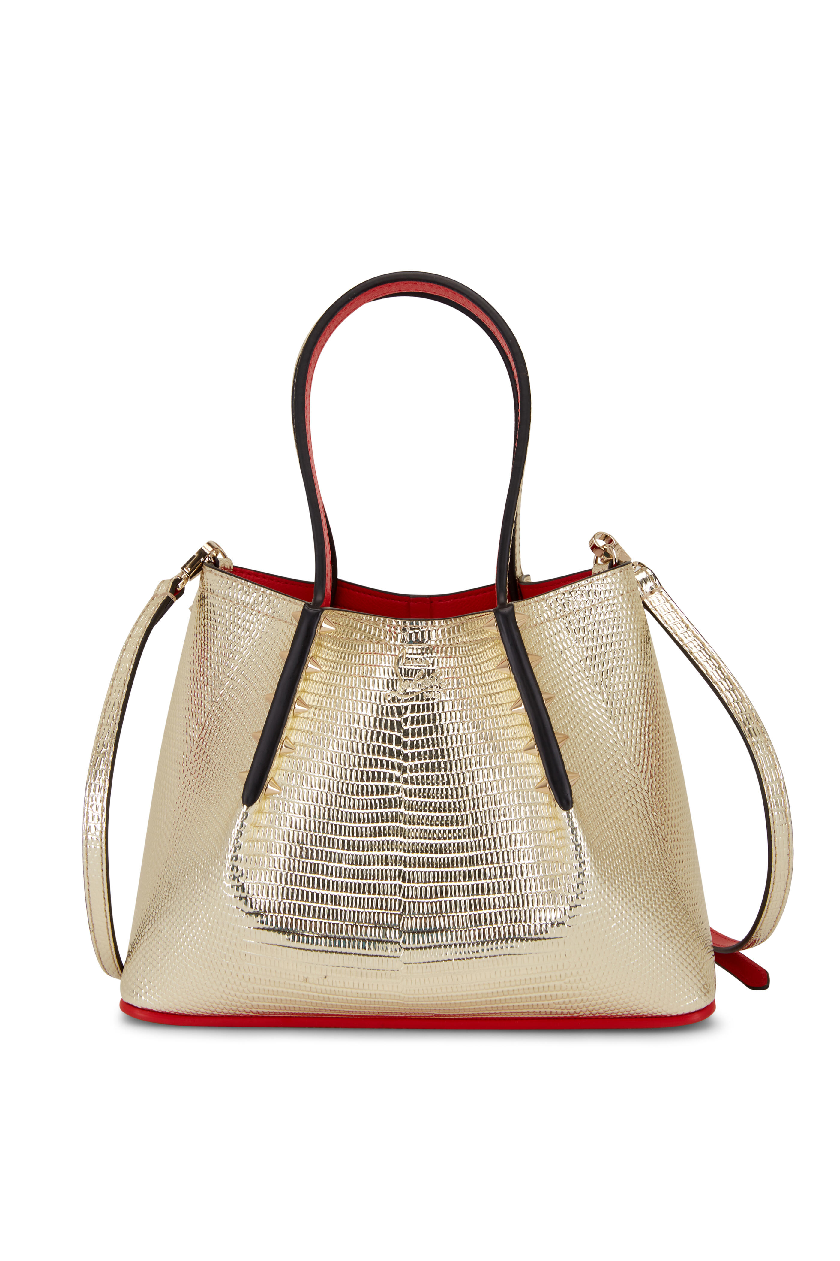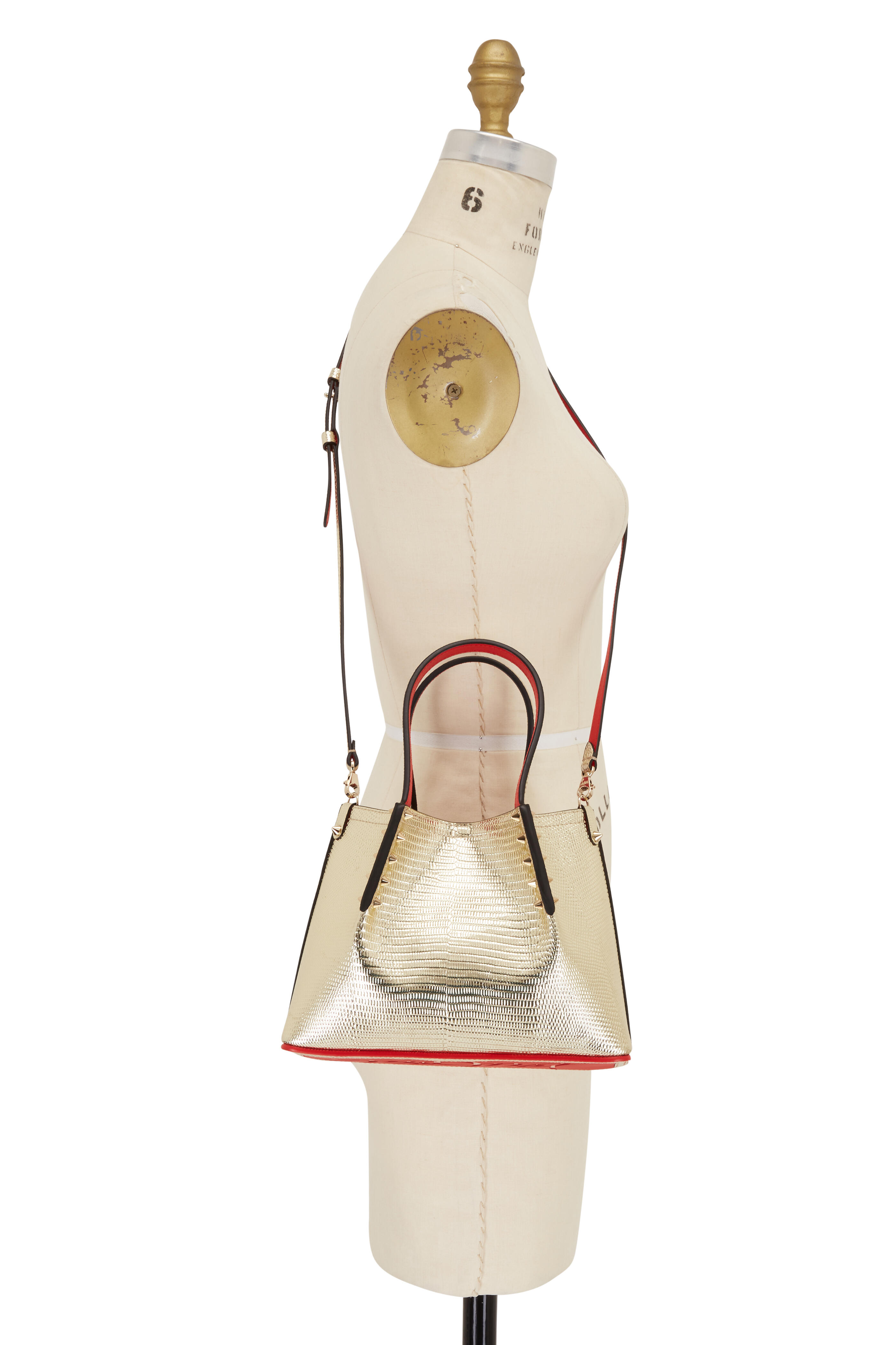 Lizard embossed leather. Top hook closure. Dual top handles; removable and adjustable shoulder strap. Spike detailing. Red leather lining. Signature red rubber bottom. Made in Italy. 7" height. 9" width. 3" depth. 5½" handle drop. 20" adjustable shoulder strap.