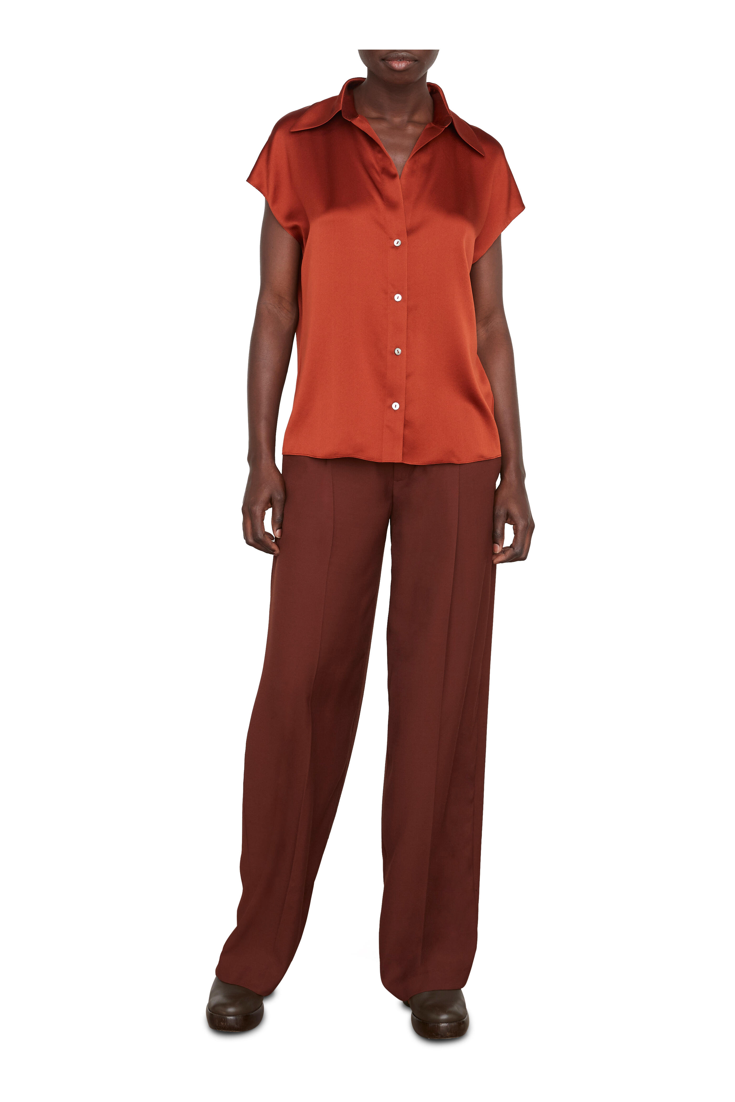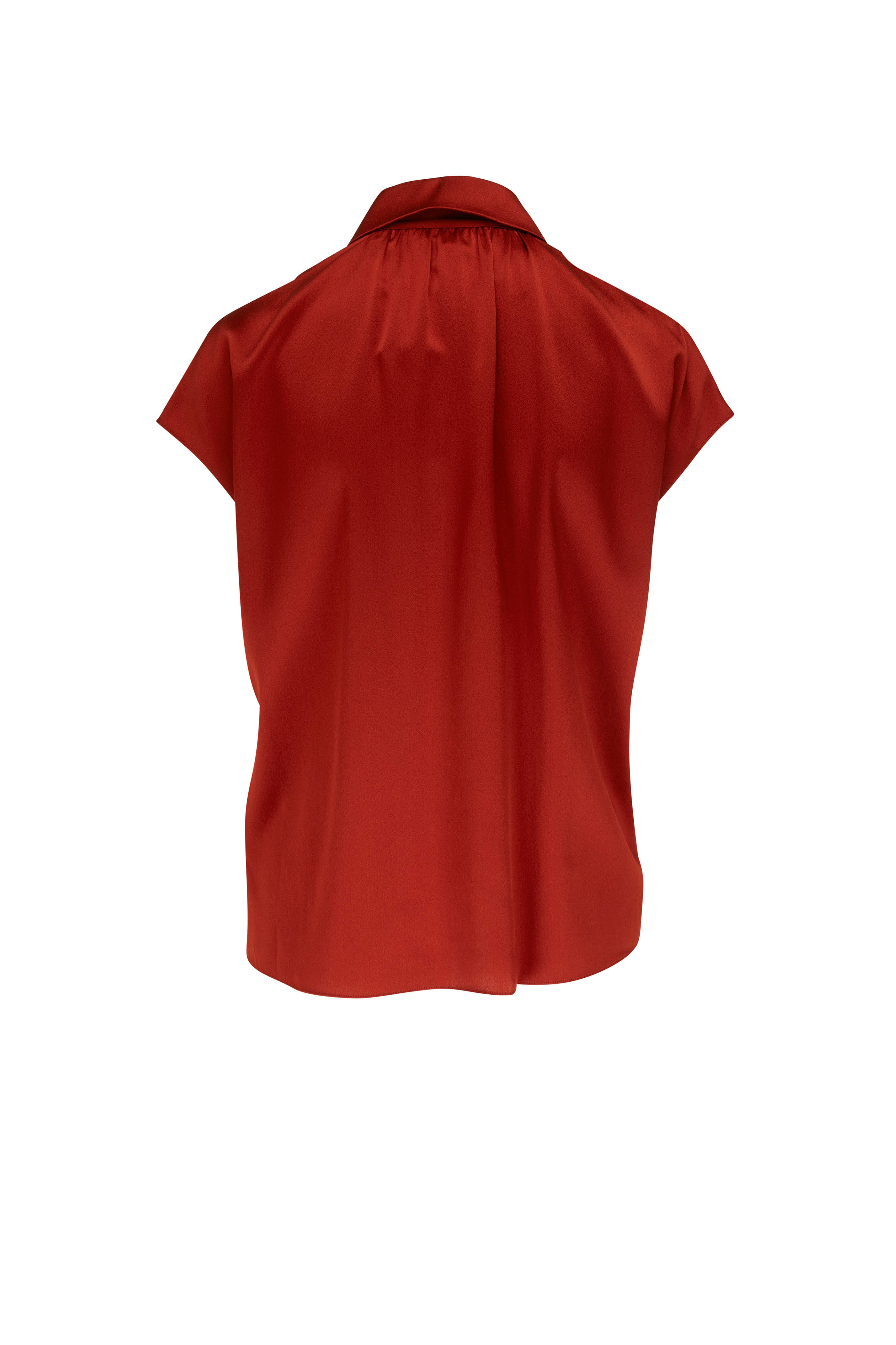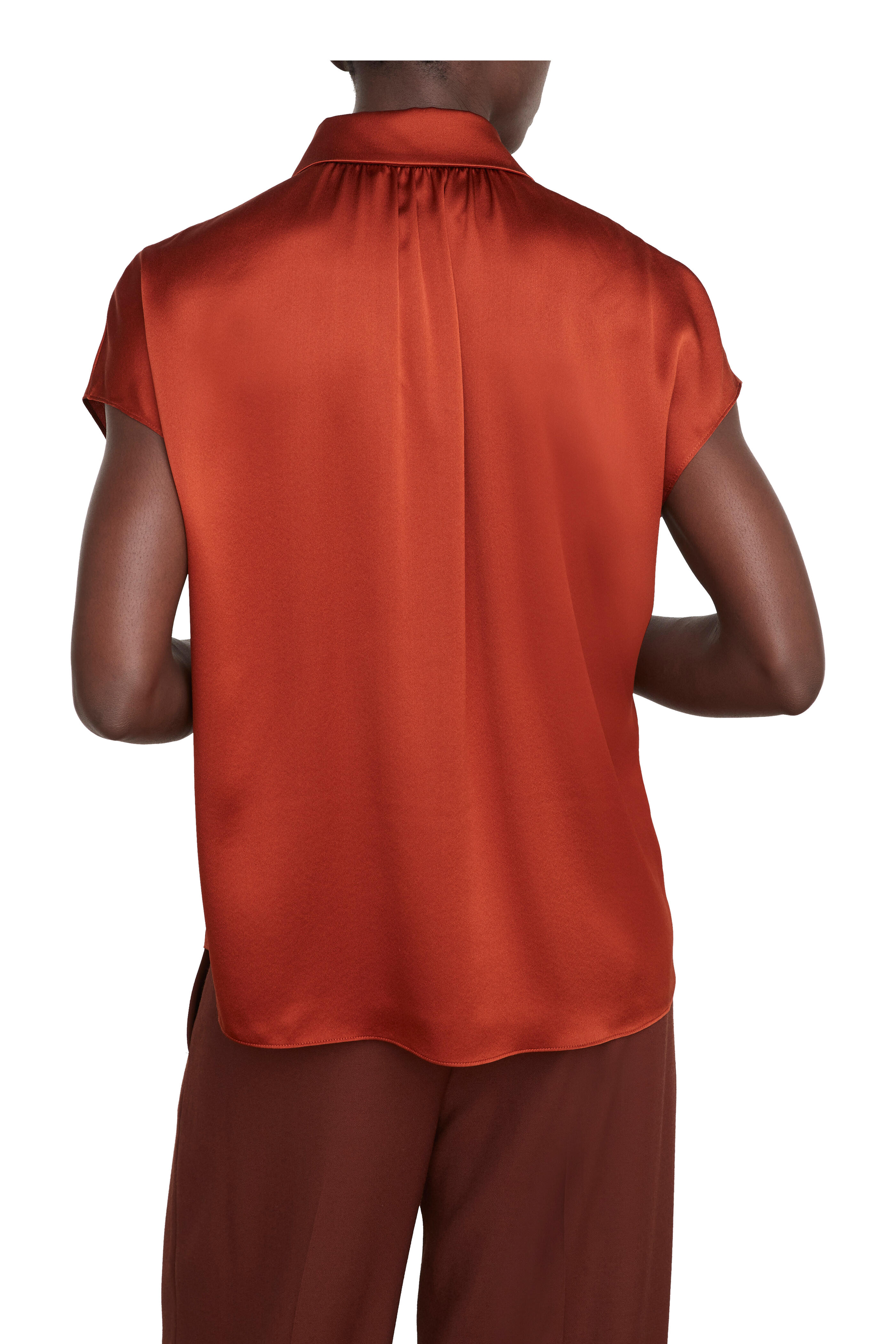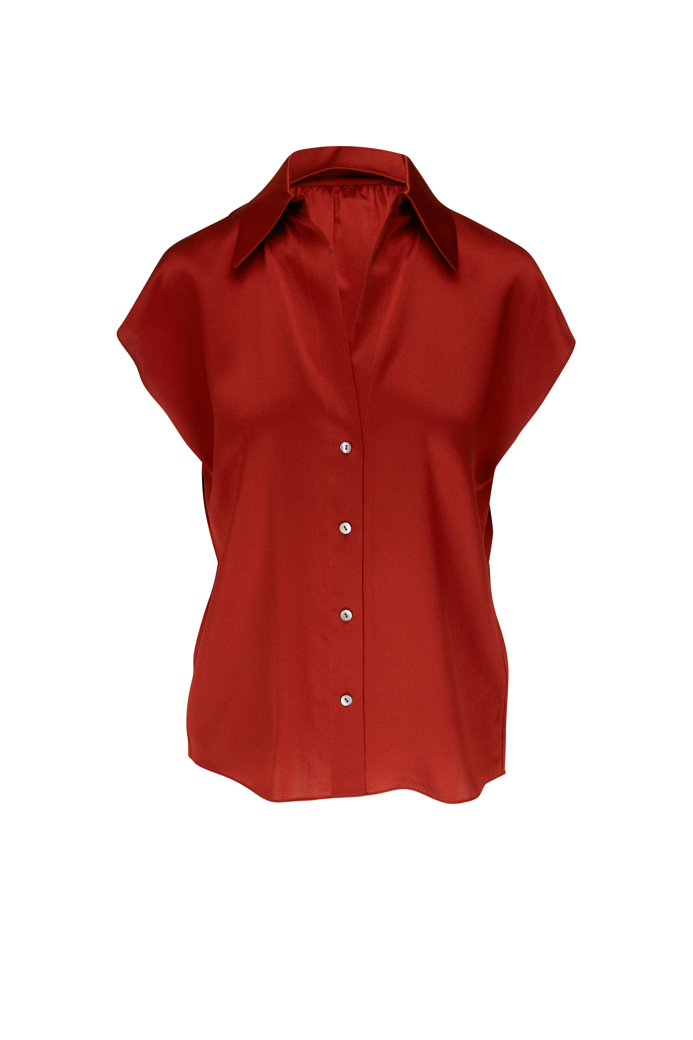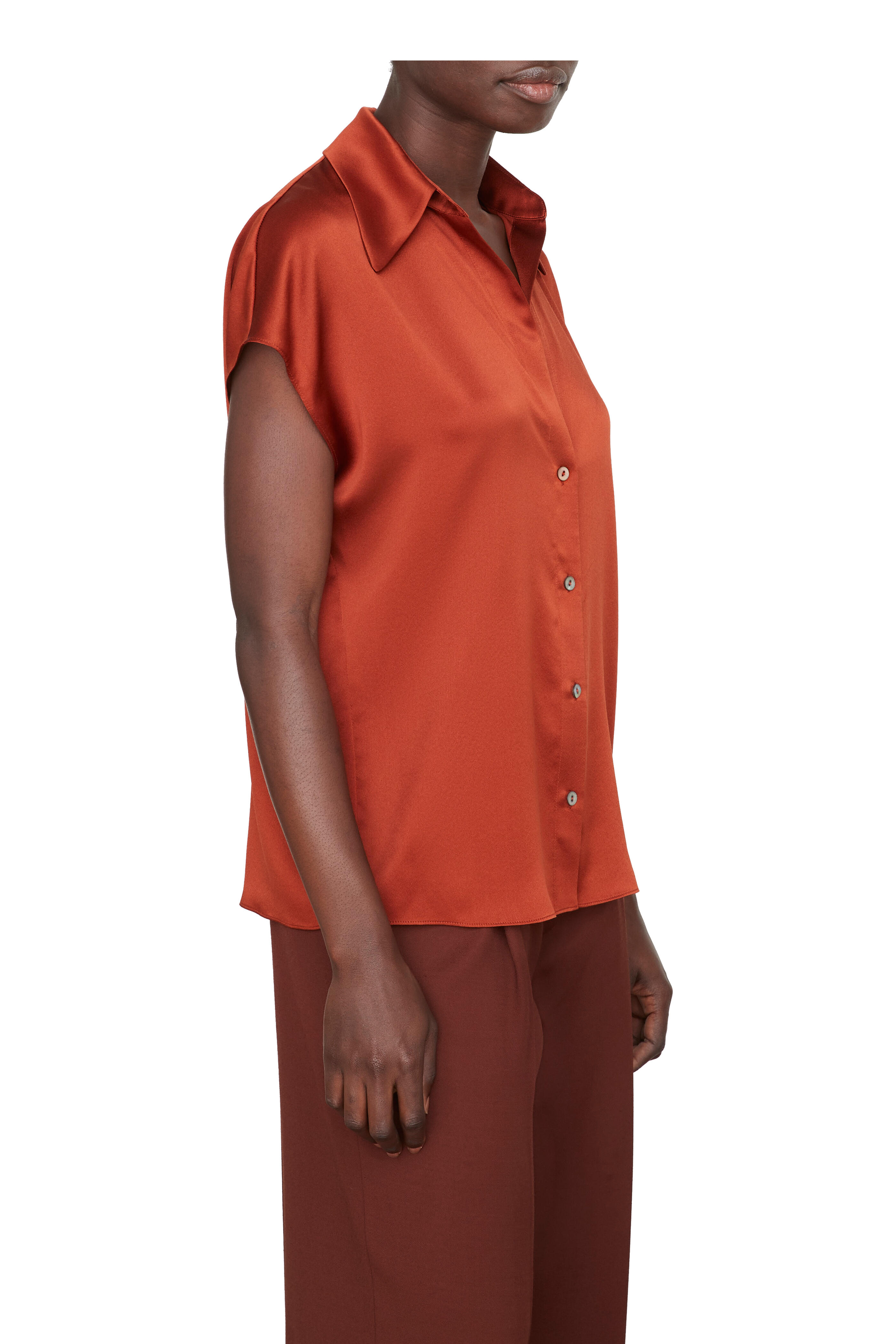 Spread collar. Front button placket. Cap sleeves. Imported. 100% silk. Hand wash.