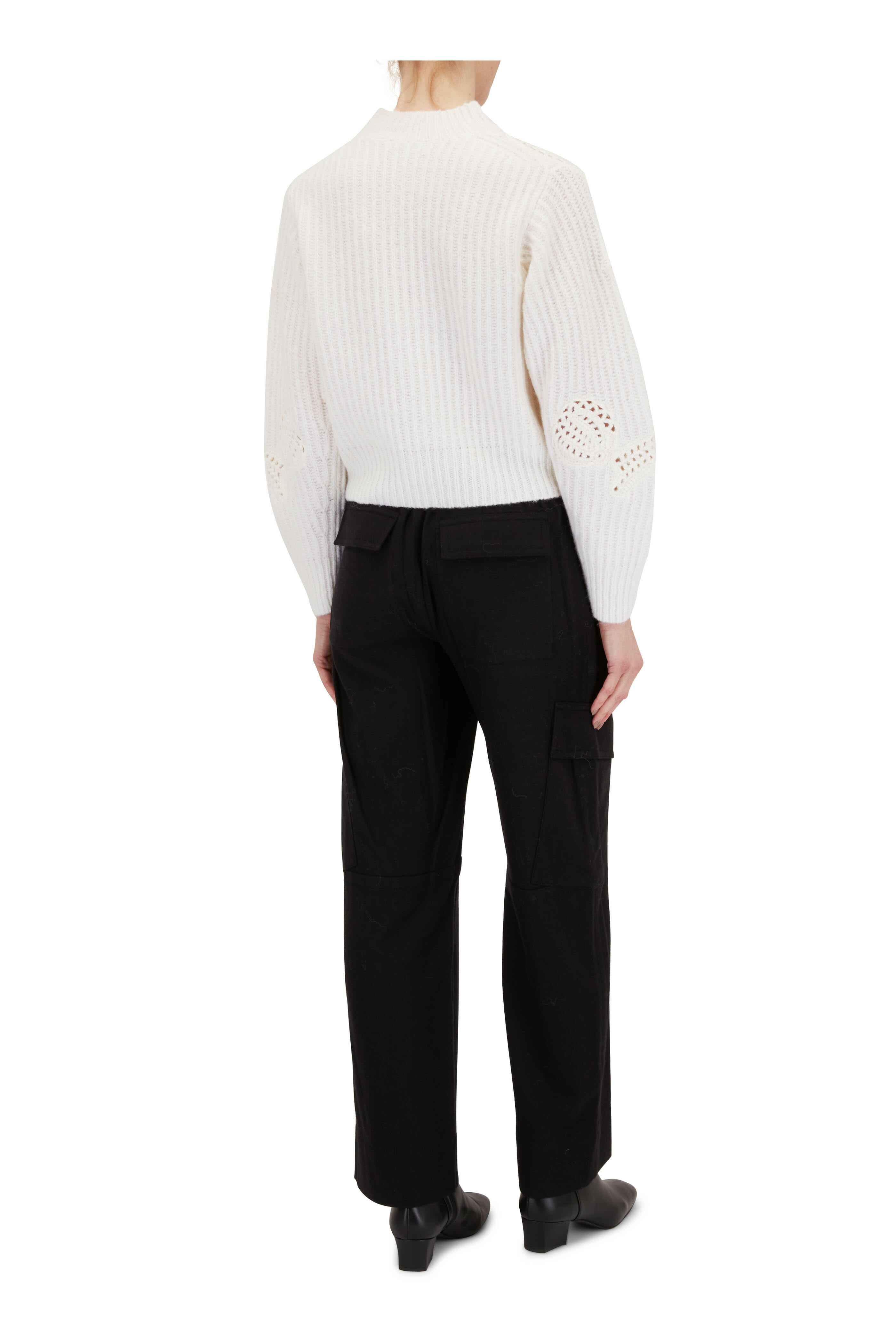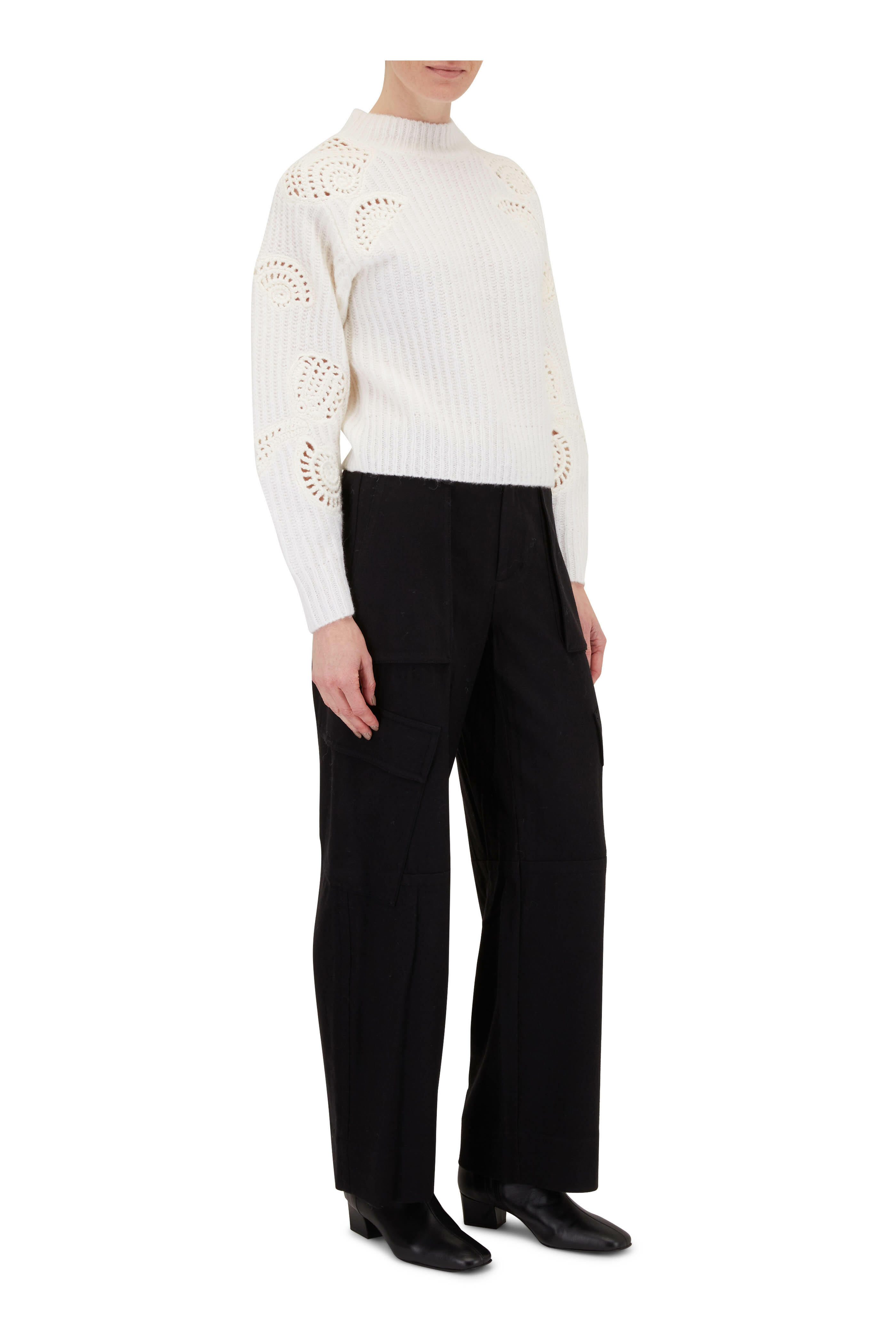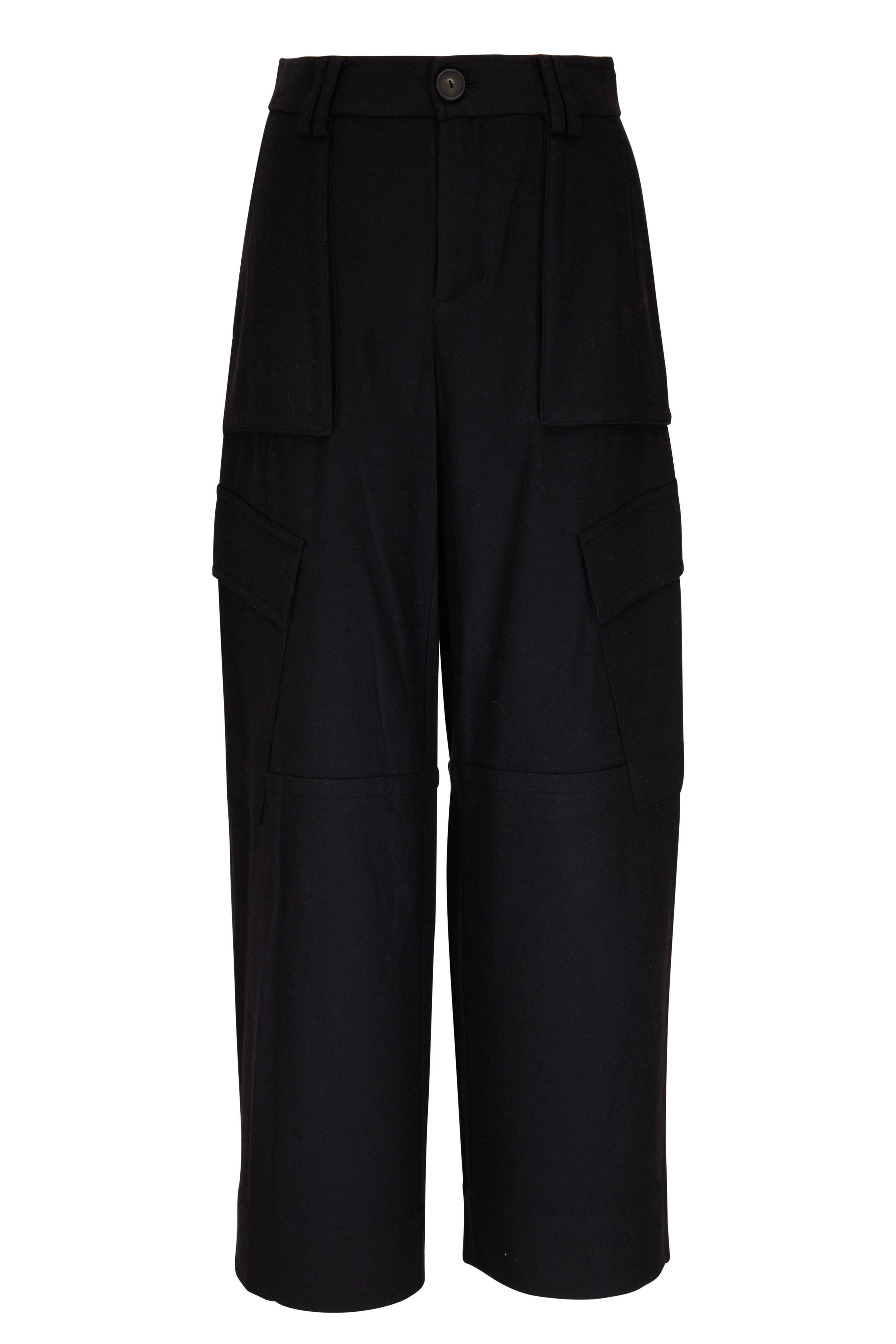 Hook and bar closure with zip fly.. Slant pockets; lower cargo pockets. Imported. 34% polyester, 33% viscose, 32% wool, 1% elastane. Machine wash.