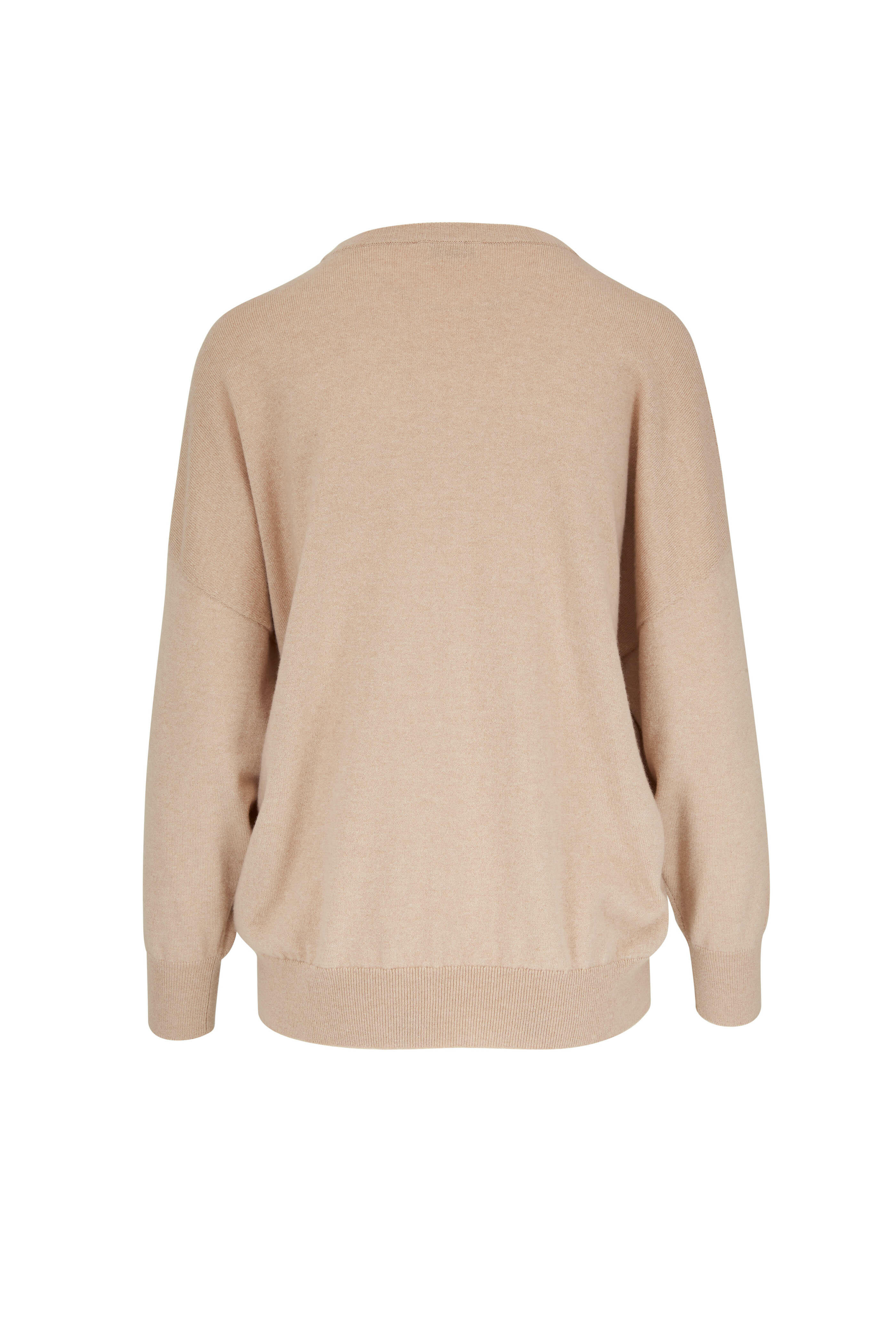 Crewneck; monili detailing at back of neck. Ribbed trims. Made in Italy. 100% cashmere. Hand wash.