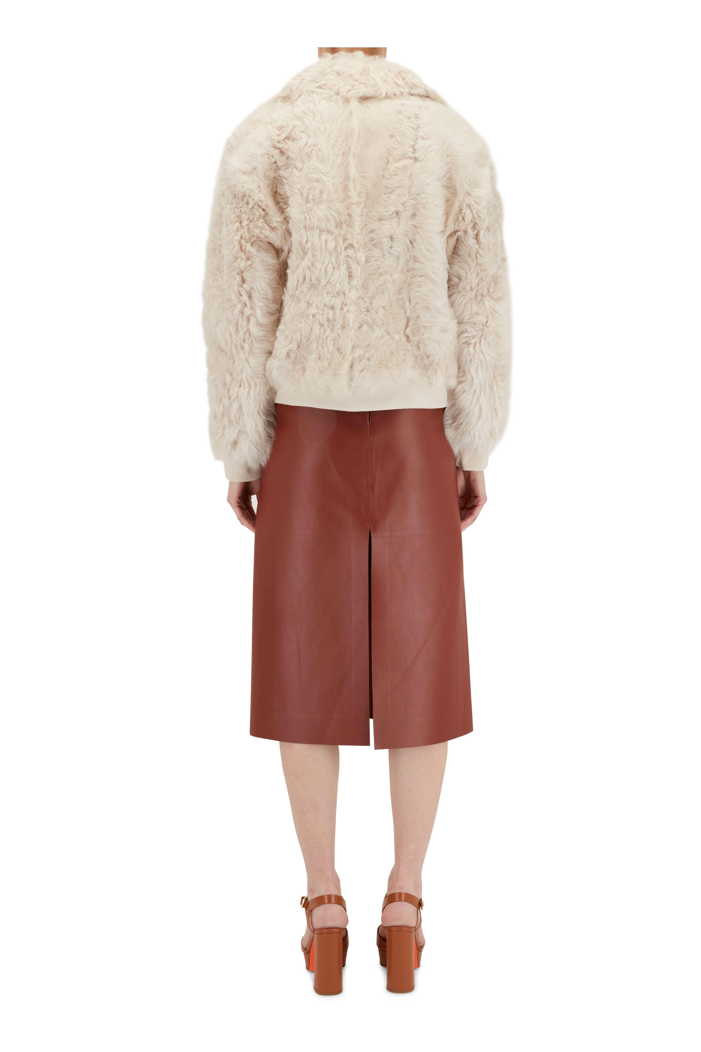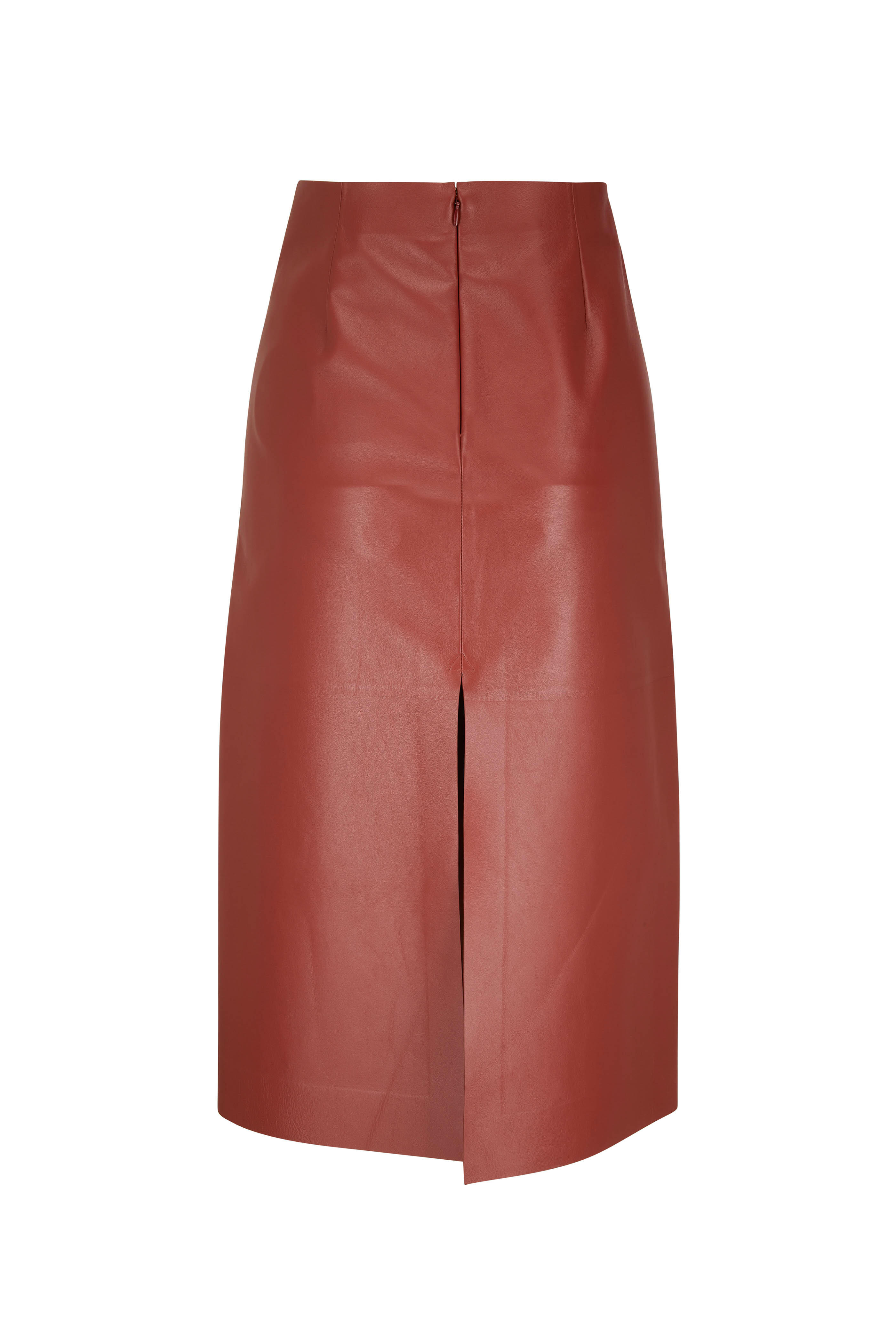 Lamb leather. Specialist clean. Concealed back zip. Front and back slit. Made in Italy. 29.5" length.