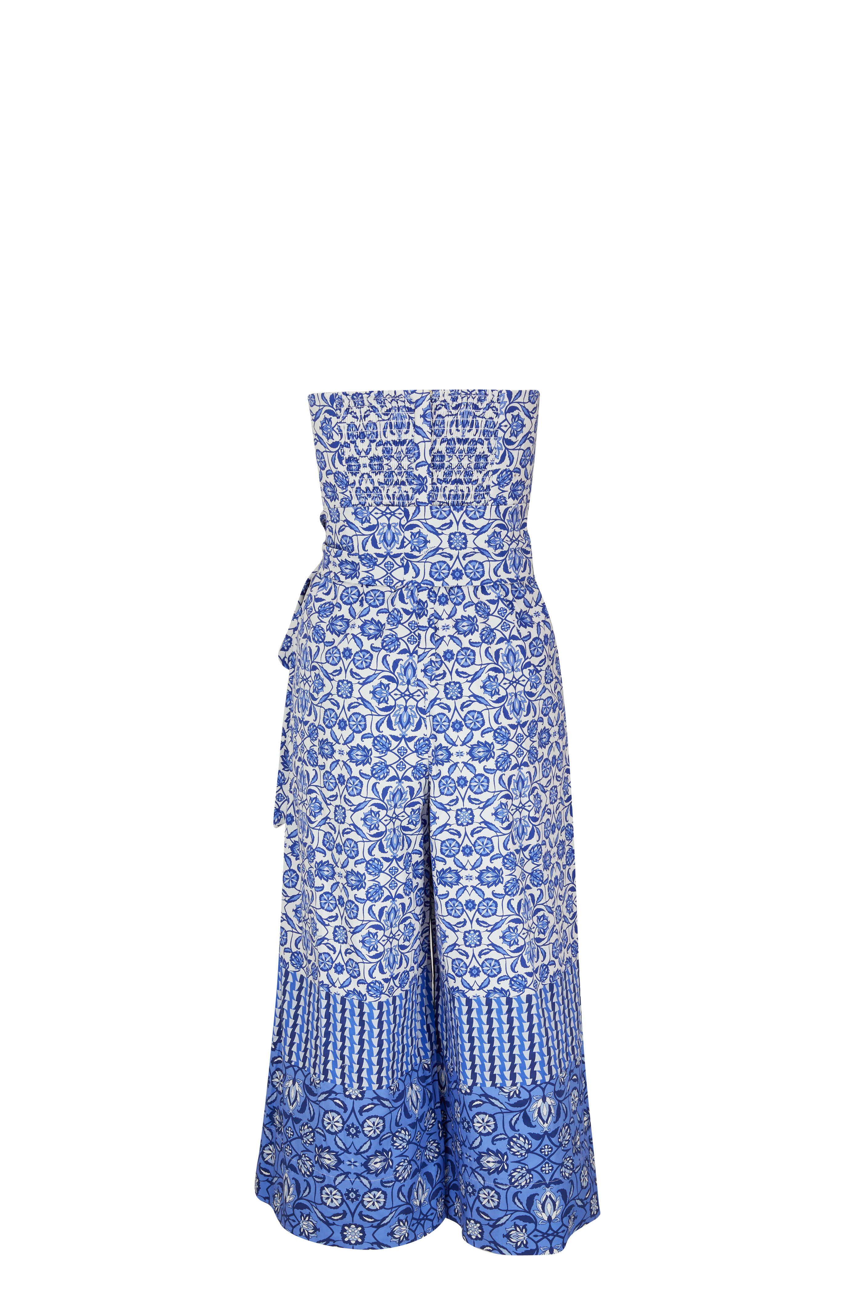 Strapless neckline. Concealed back zip; self tie belt. Belt loops. Concealed side slash pockets. Imported. Approximately 43" shoulder to hem. 100% cotton. Hand wash.