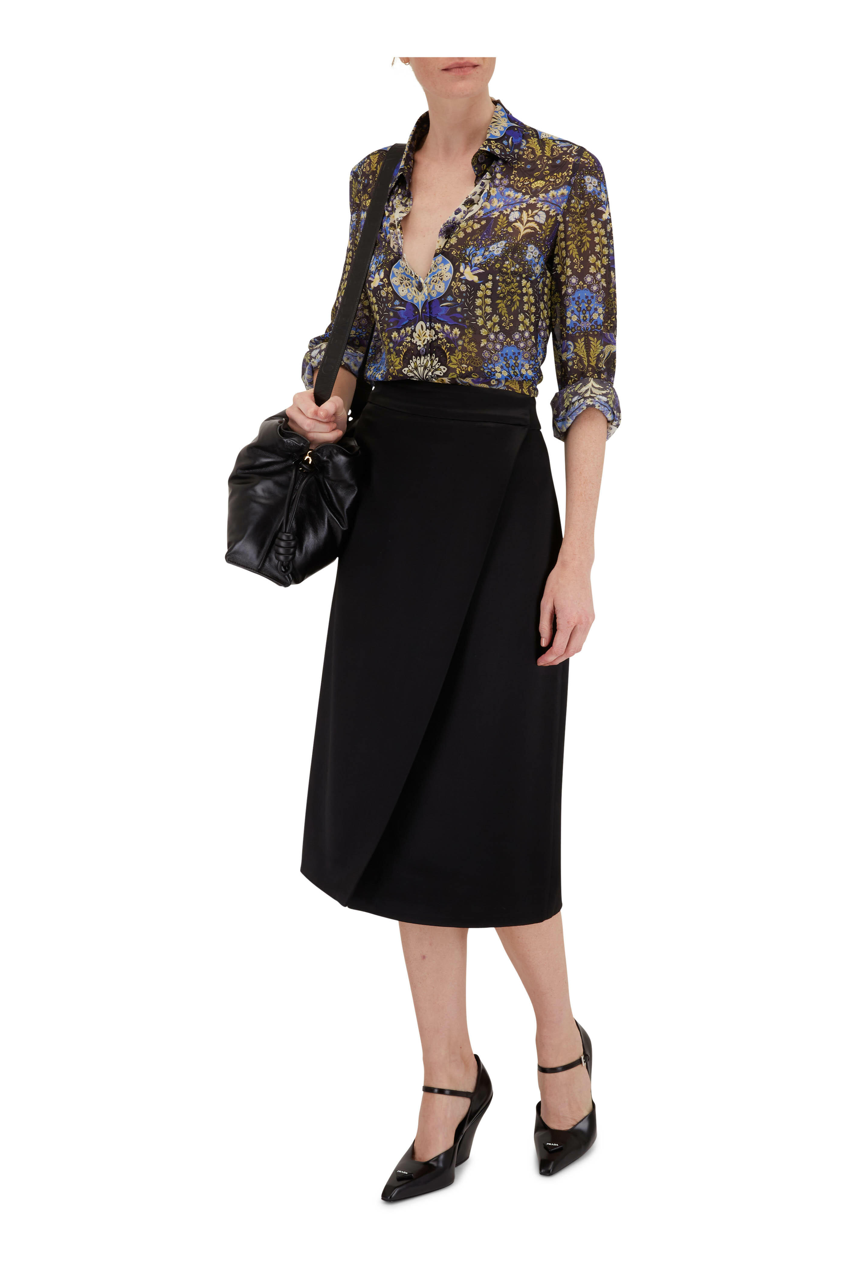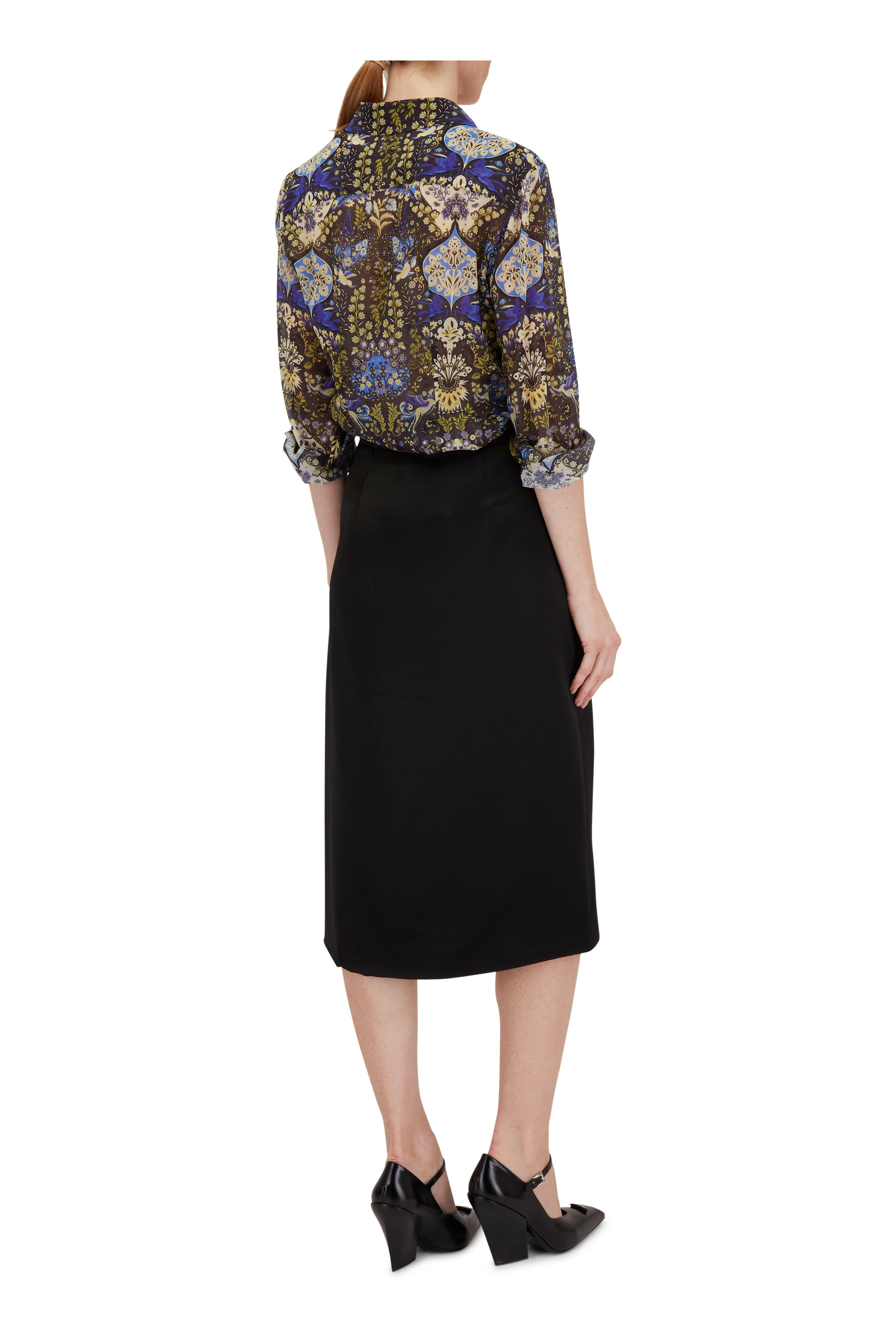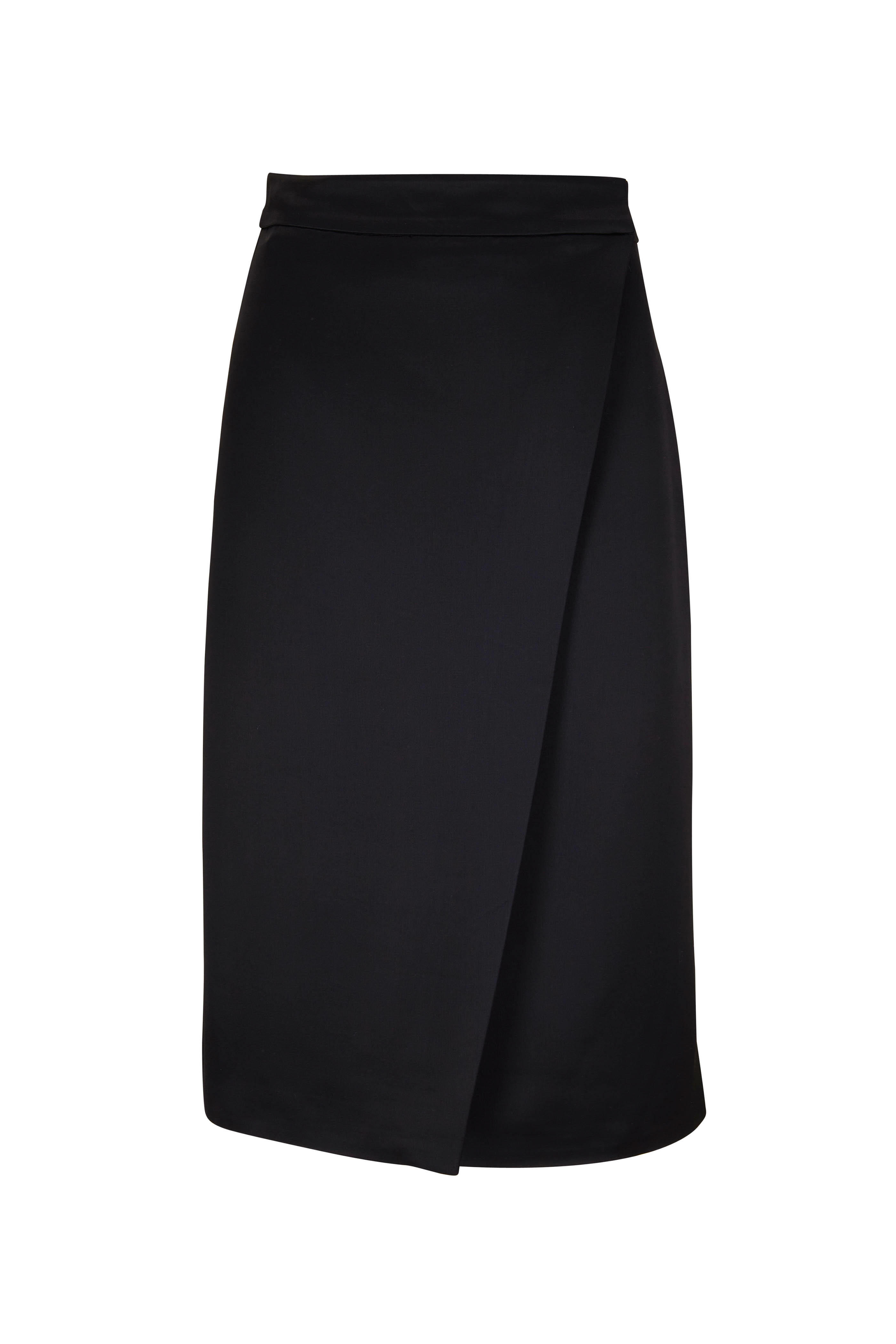 Banded waist; hook & eye closure. Imported. About 30" long. 82% viscose 18% wool. Dry clean.