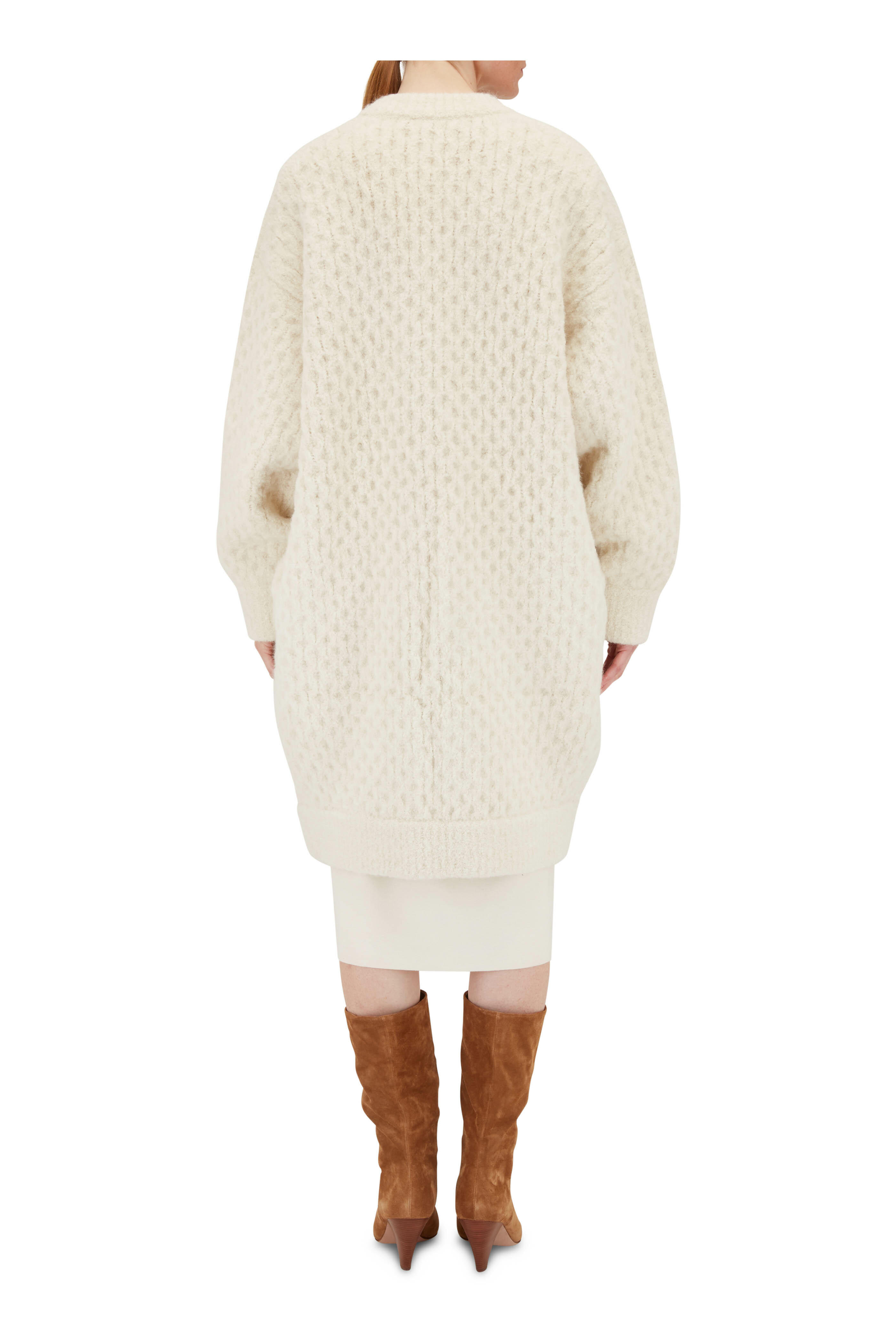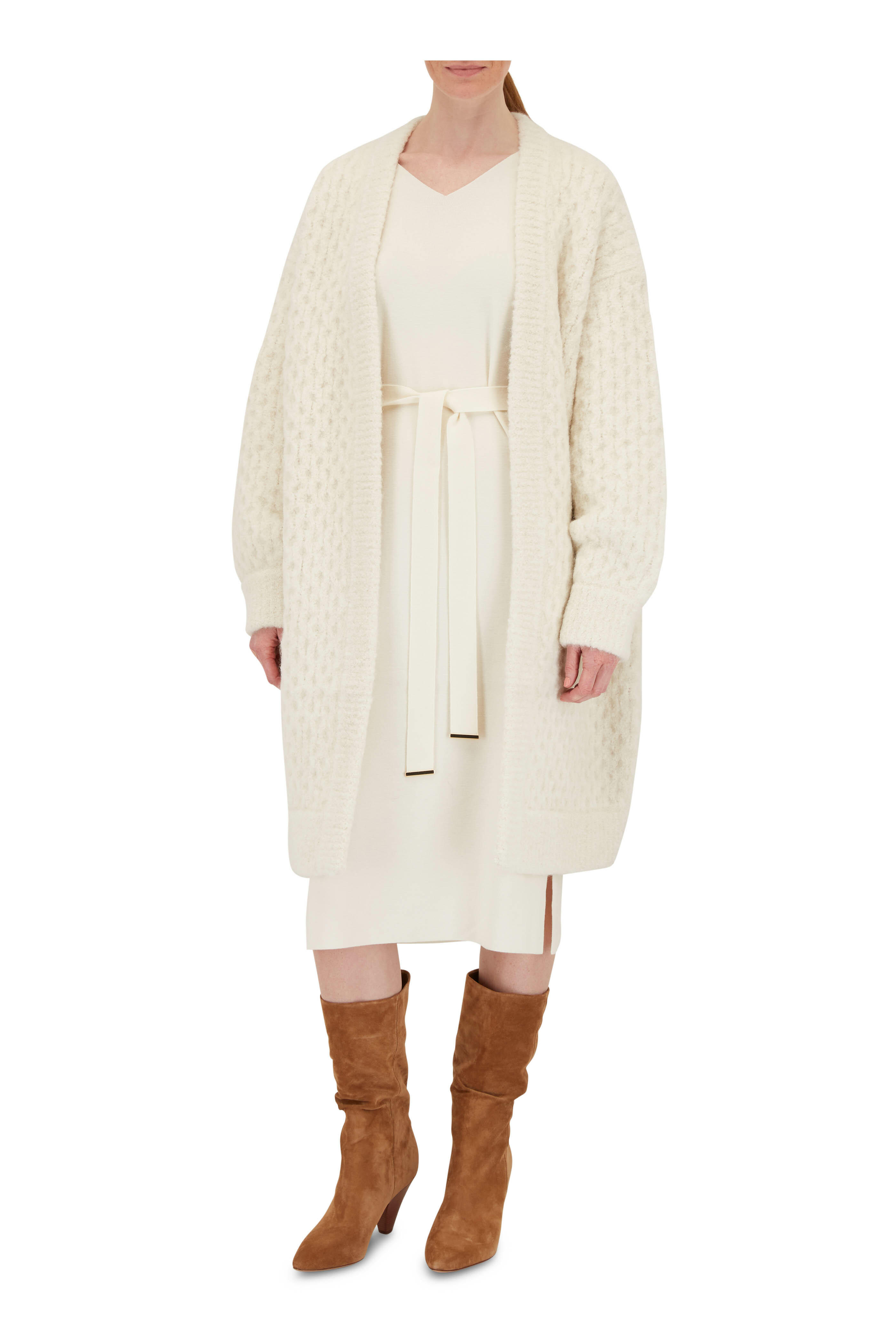 Open front. Drop shoulders. Imported. 86% alpaca, 13% nylon, 1% elastane. Dry clean.