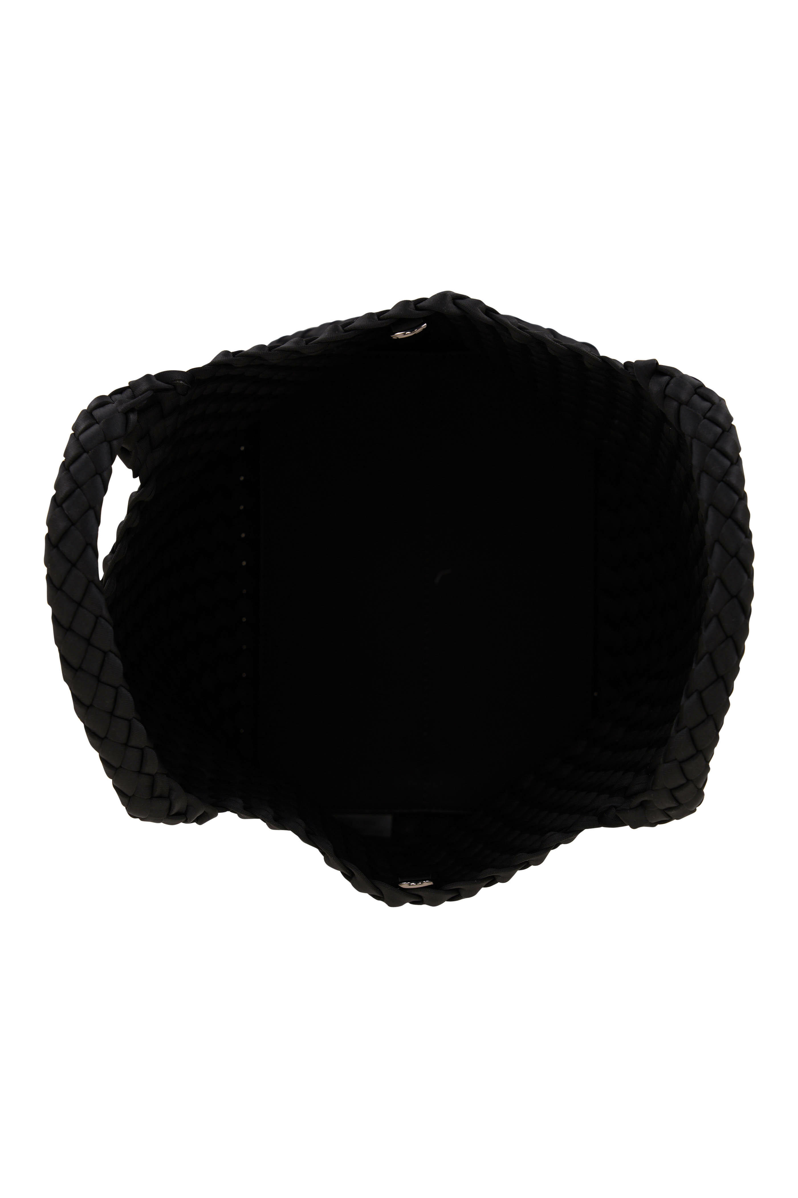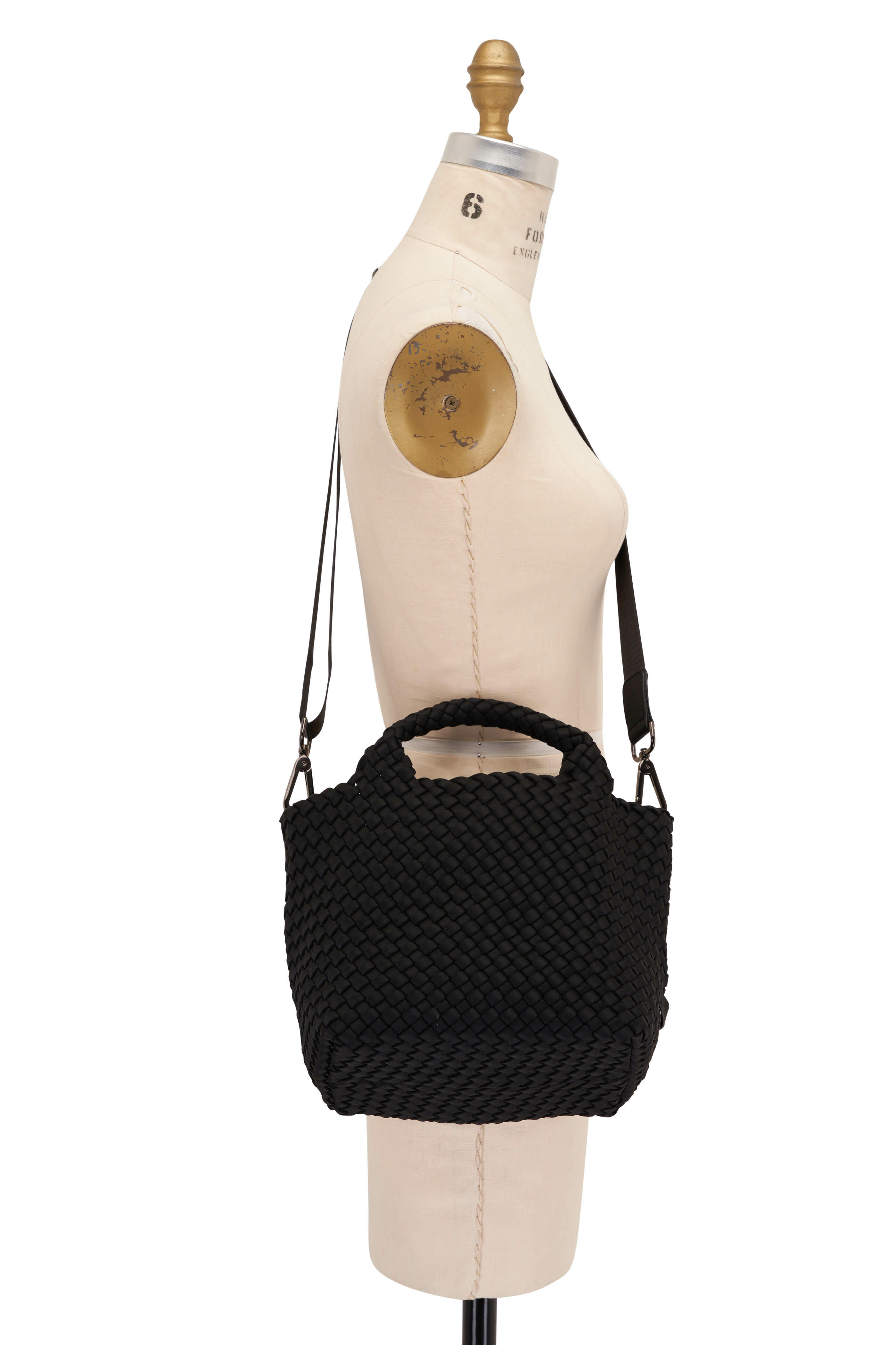 Hand woven neoprene. Dual top handles; removable, adjustable woven shoulder strap. Open top; one main compartment. Unlined. Imported. Width: 8 ½". Height: 8". Depth: 6 ½". Handle drop: 2 ½". Strap drop: 14-25".