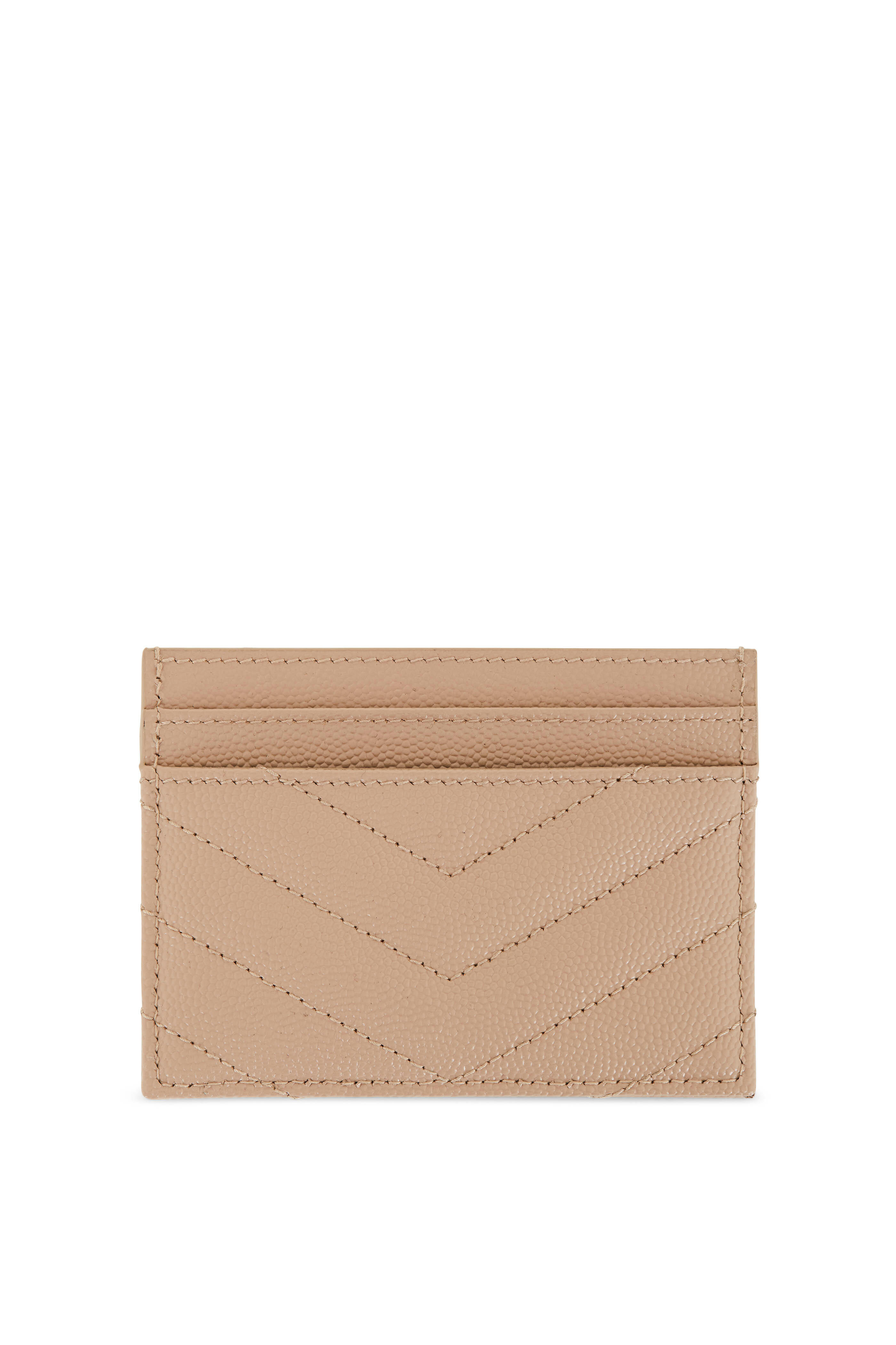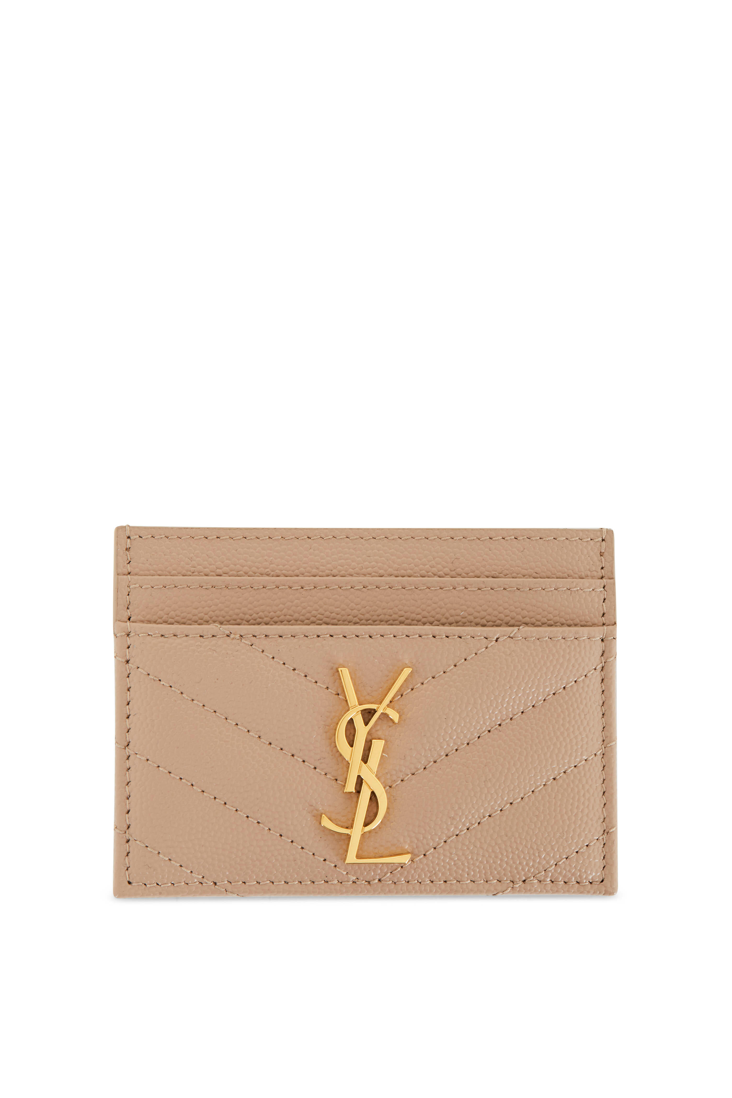 Quilted grained leather. Four card slots. Center top compartment. Gold-tone logo detail. Made in Italy. 4.25" width. approx. 3" height.
