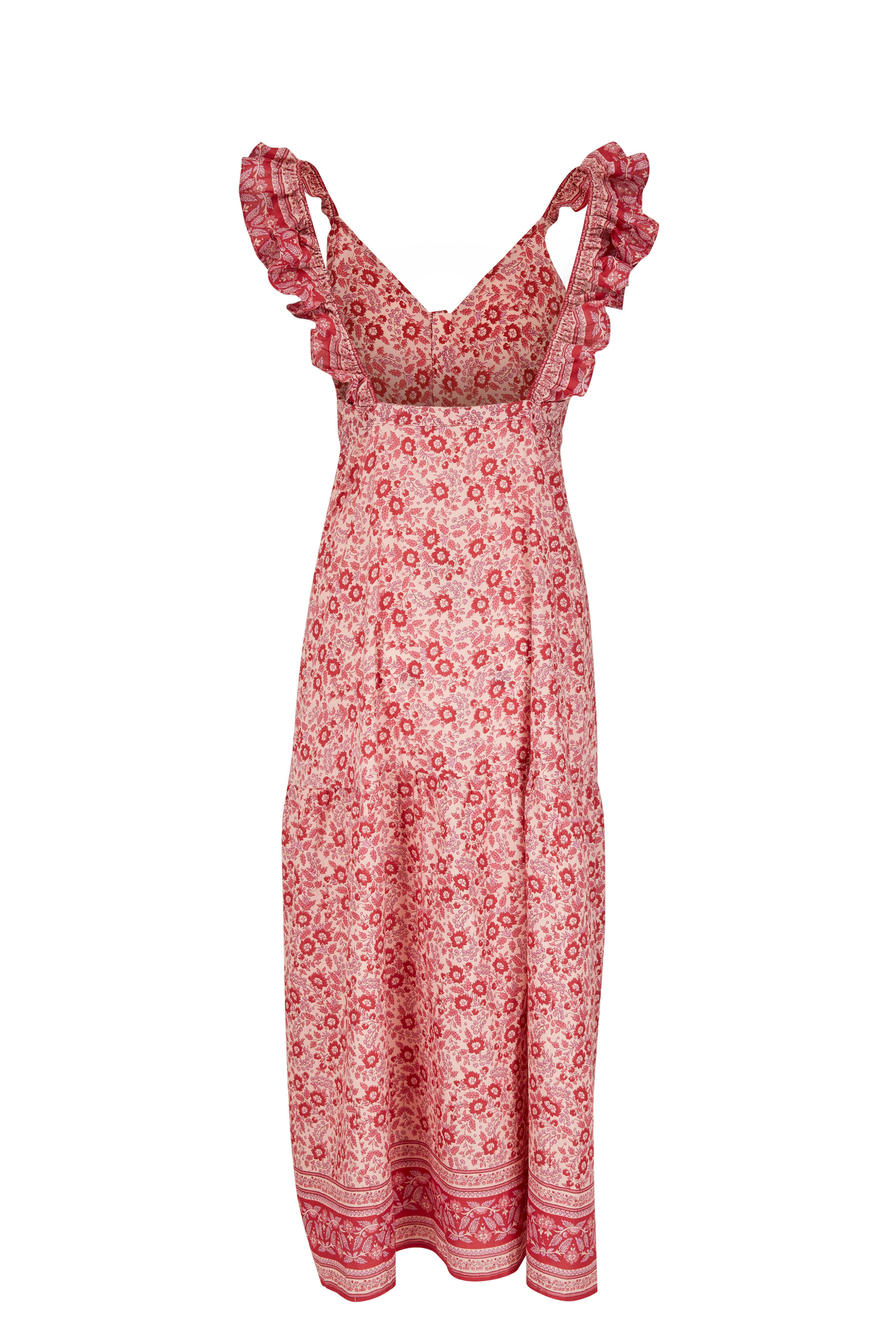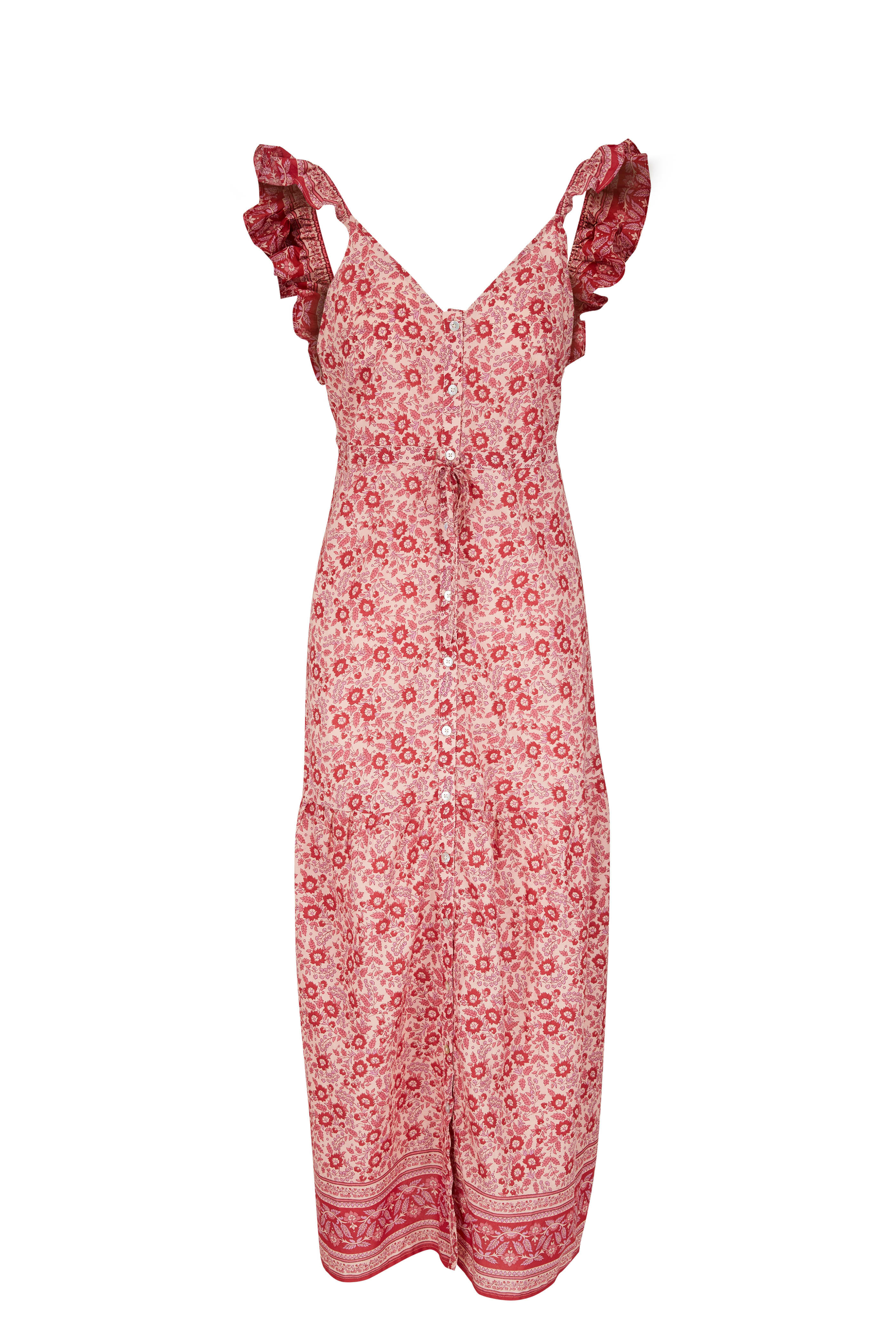V-Neckline. Full front button closure; self tie drawcord at waist. Ruffle sleeve detail; elasticized. Imported. 52" shoulder to hem. 100% organic cotton. Machine wash.
