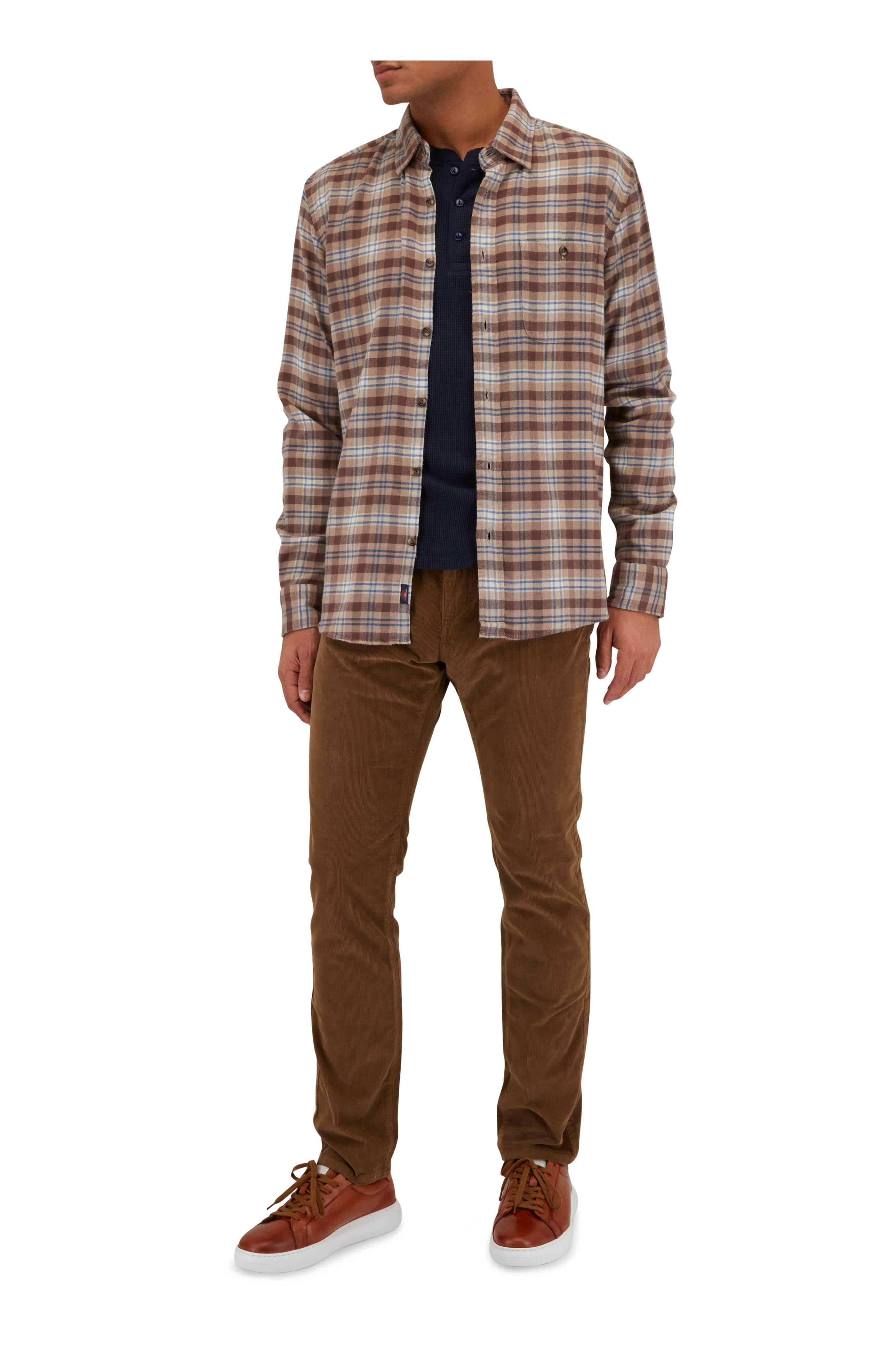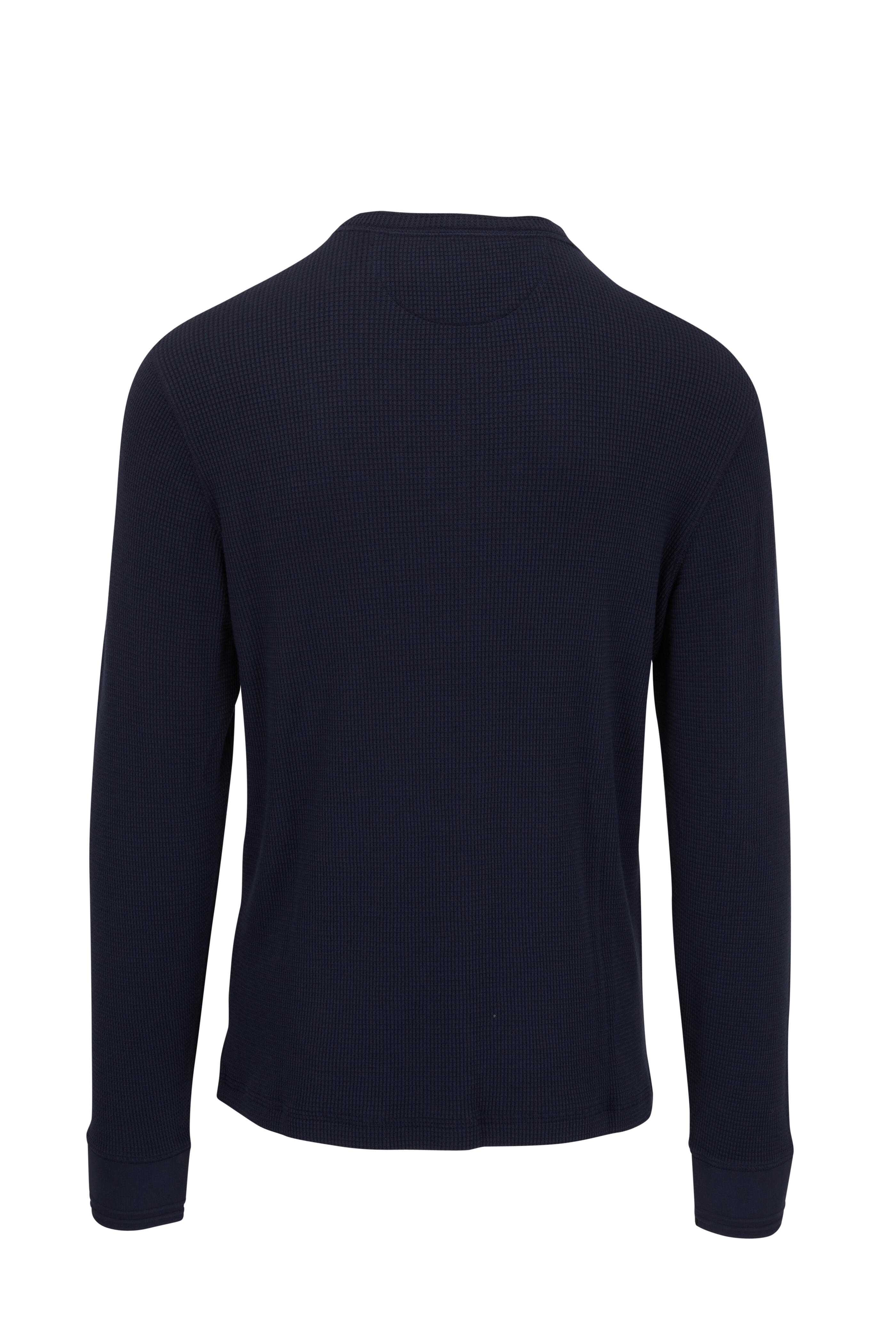 Henley neckline. Ribbed cuffs. Made in Peru. Color: Navy. Relaxed through the body with a straight fit and tapered sleeves. 49% pima cotton, 49% modal, 2% elastane. Machine wash.