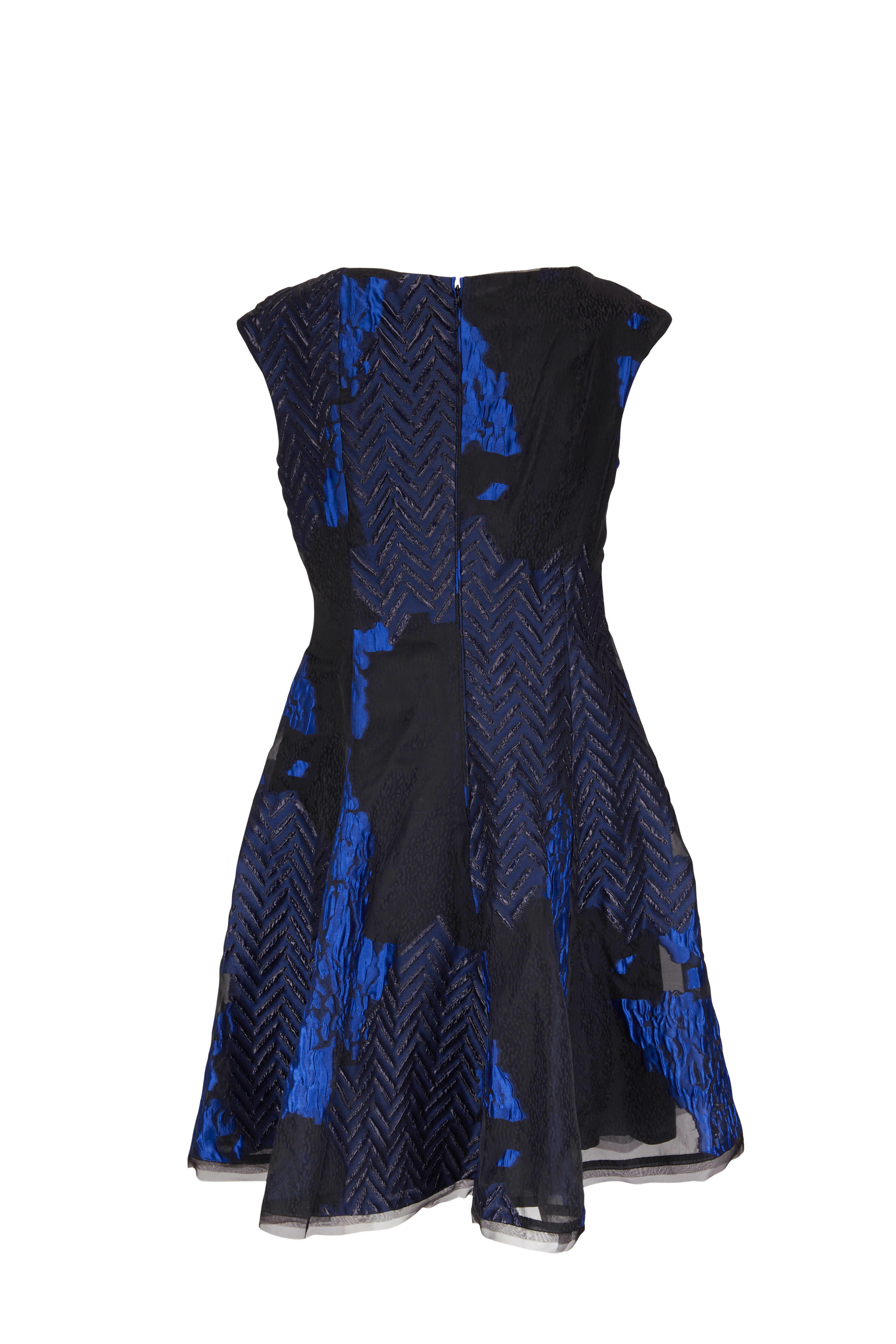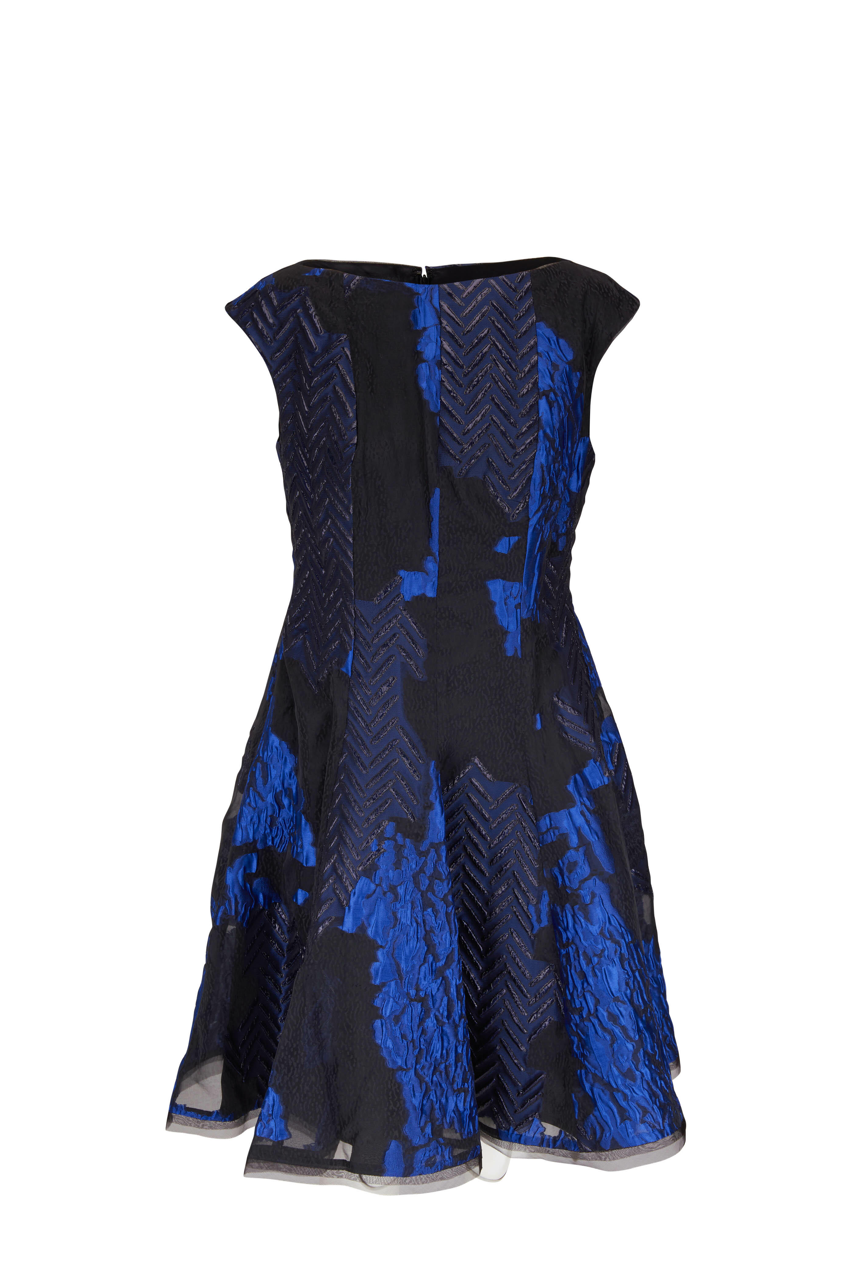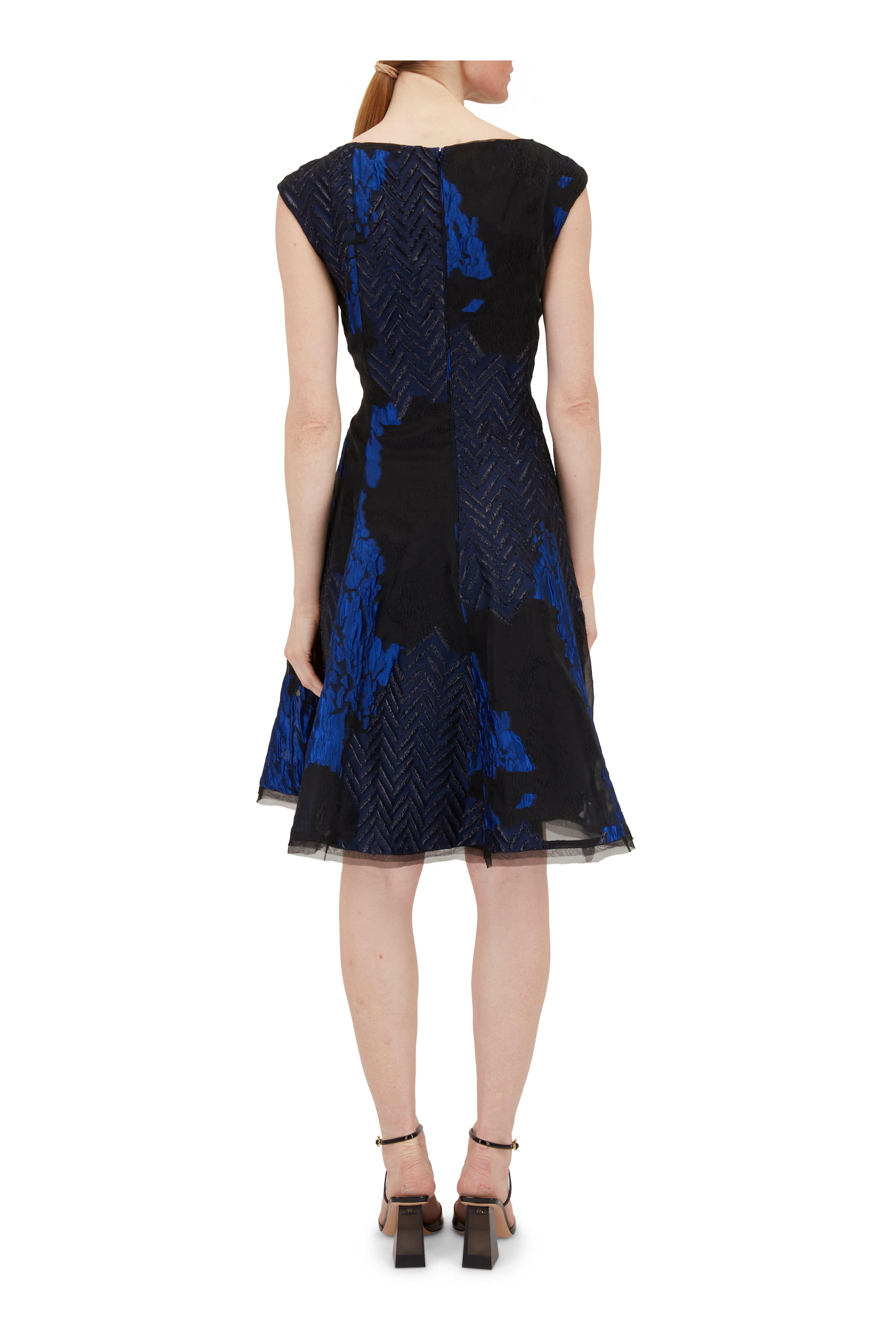 Boatneck. Concealed back zip. Imported. 38 ½" shoulder to hem.. 100% polyester; Lining: 100% acetate. Dry clean.