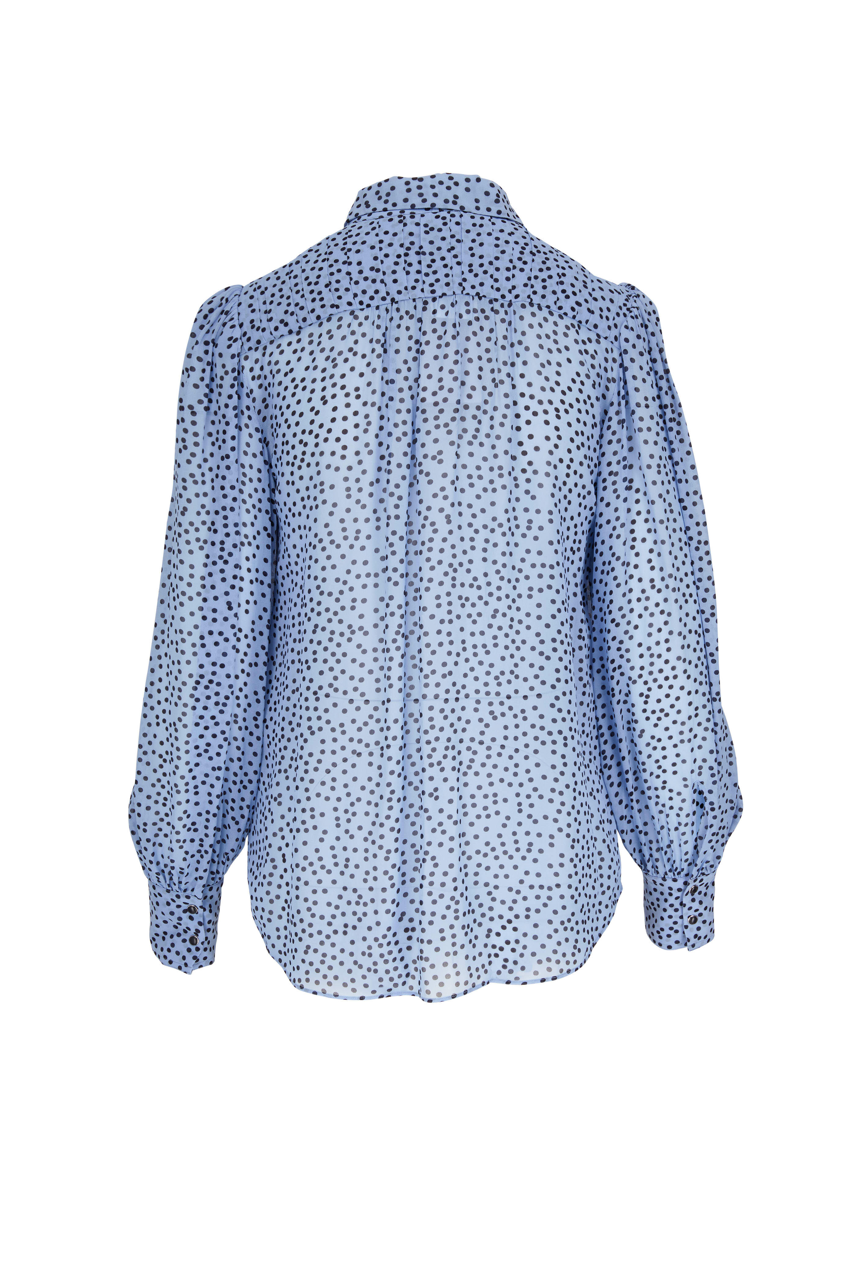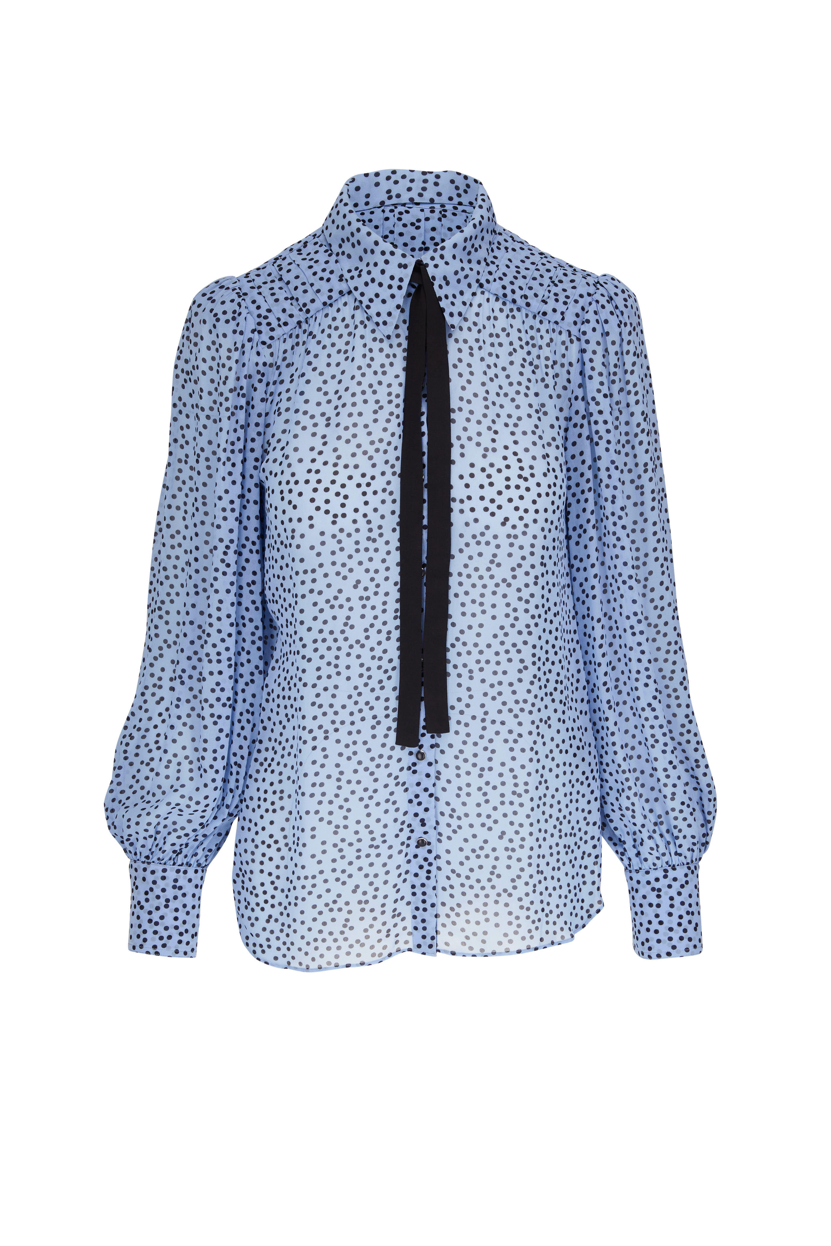 Point collar. Front button placket. Detachable silk neck ribbon. Bishop sleeves. Double button cuffs. Imported. 100% viscose; Ribbon: 100% silk. Dry clean.