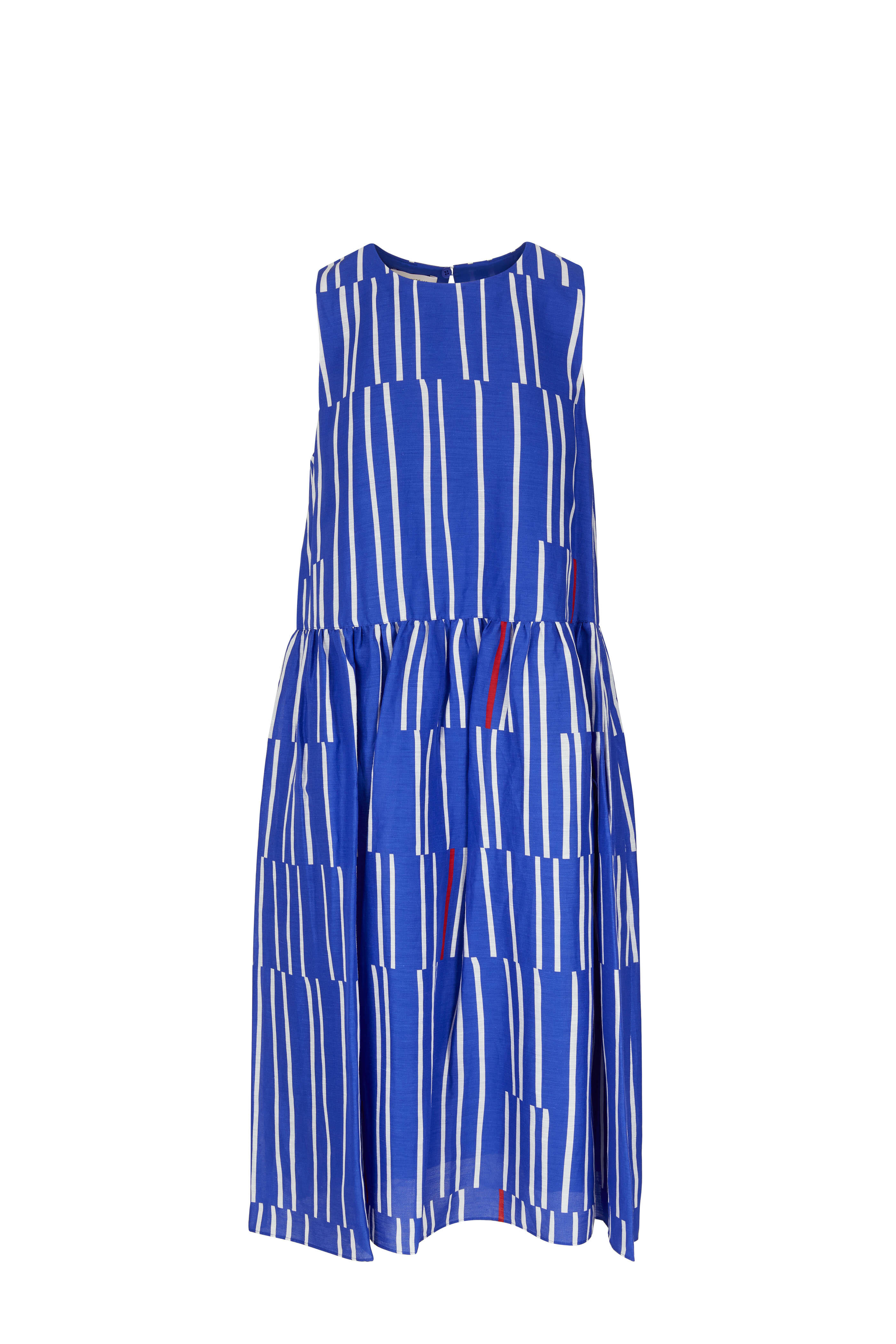 Jewel neckline. Single button keyhole back. Side slip pockets. Tiered skirt. Imported. 44" shoulder to hem. 67% linen, 33% viscose; lined. Dry clean.