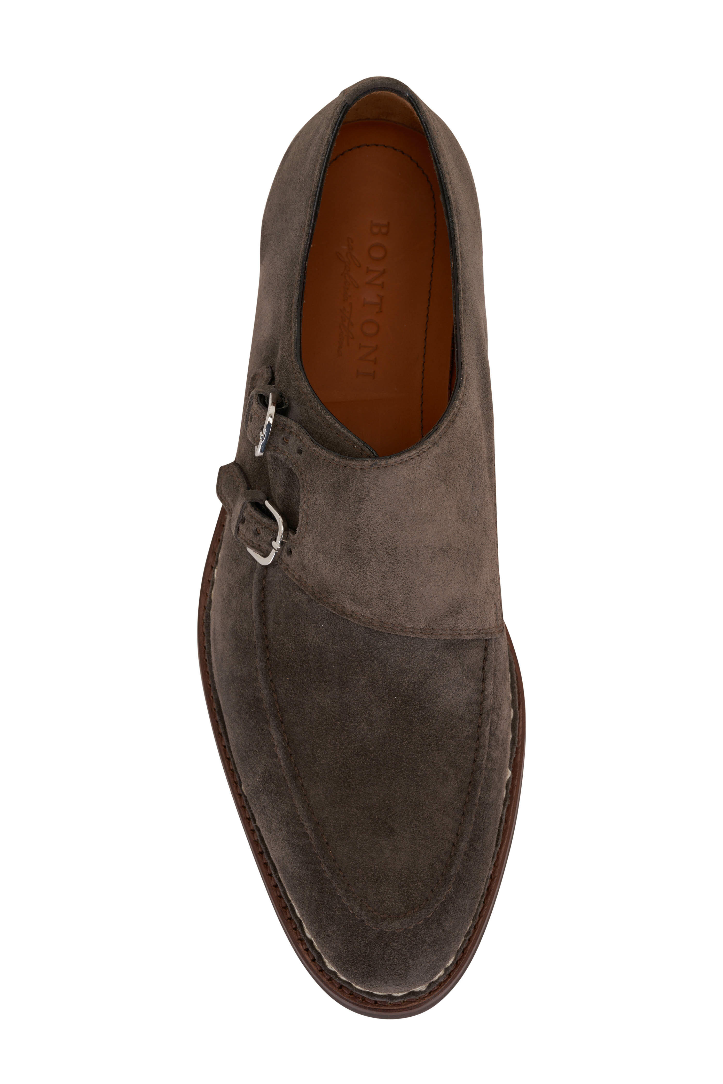 Suede upper. Tapered toe. Double buckle monk straps. Leather lining and insole. Textured rubber sole. Made in Italy.