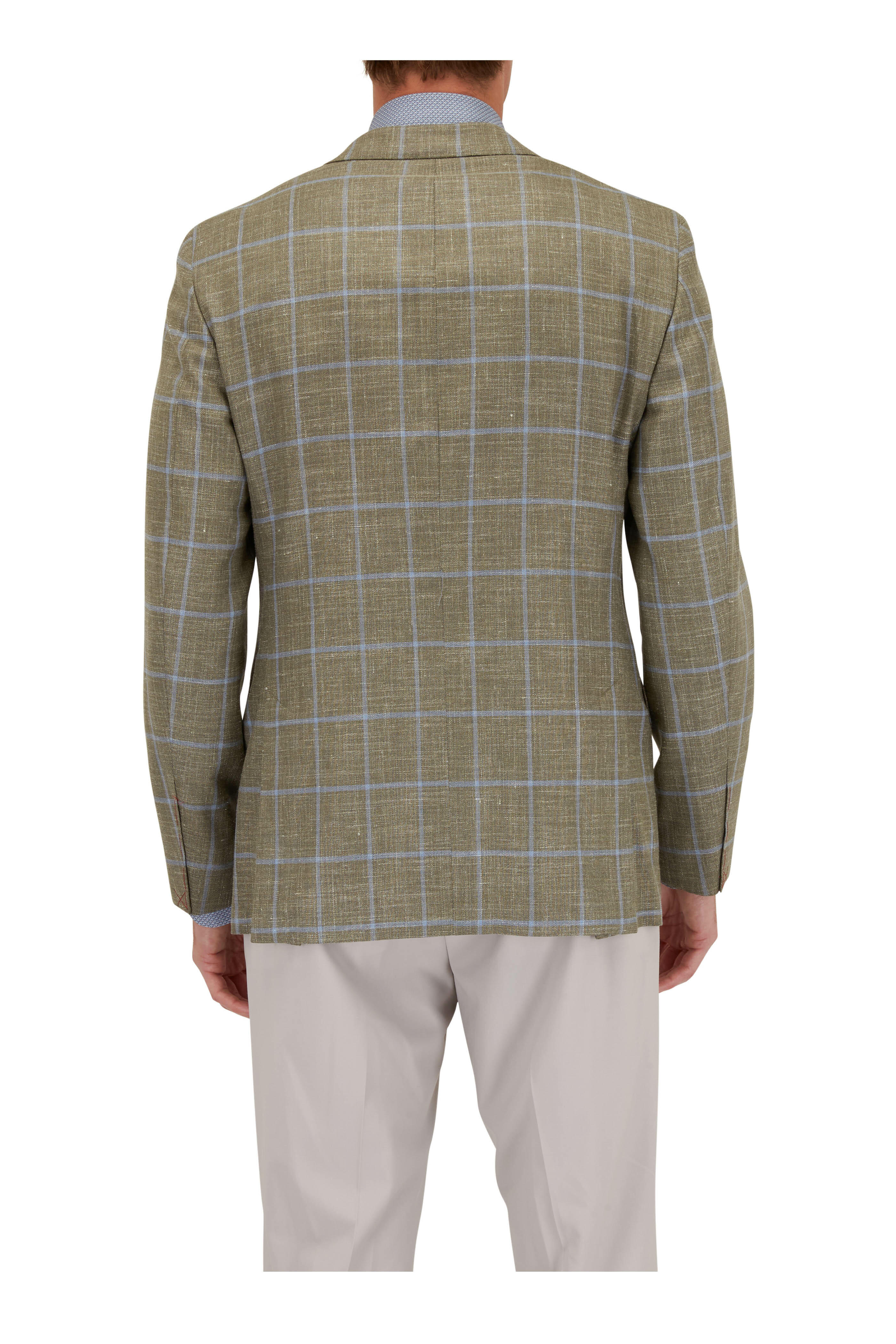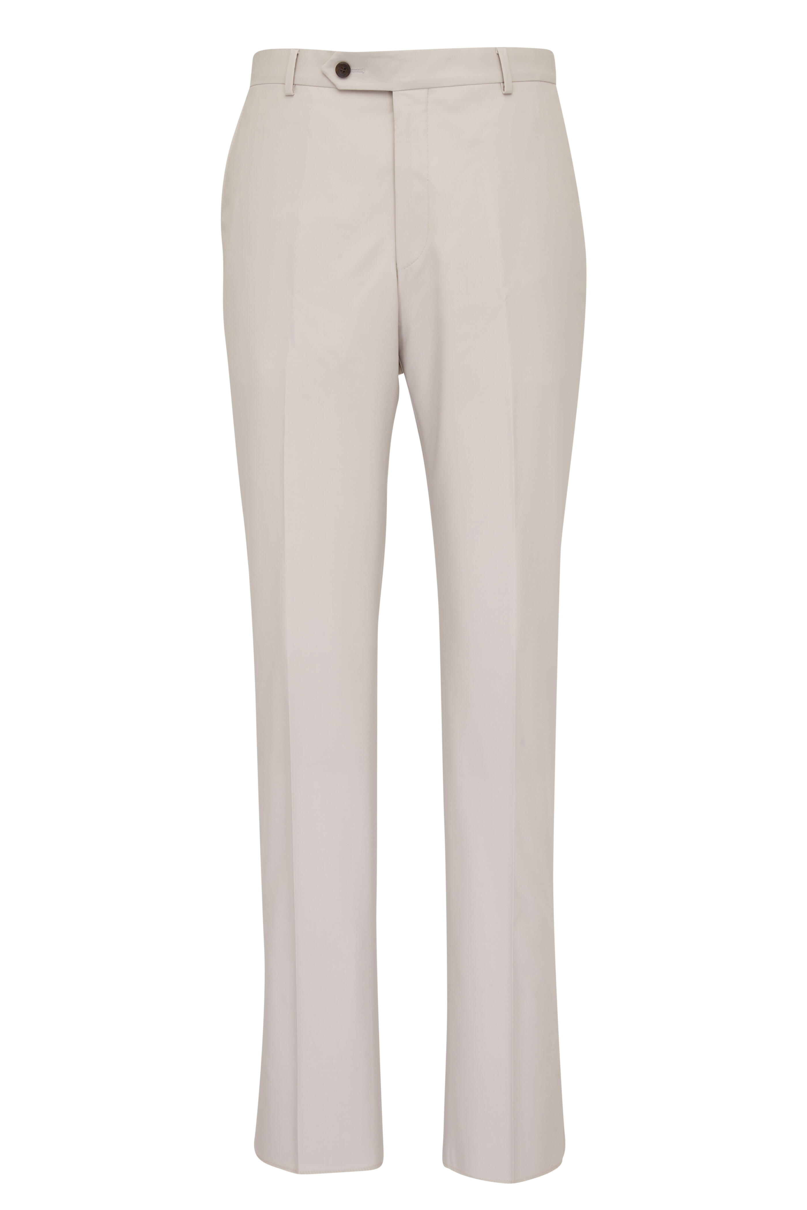 Zip fly with double button tab. Belt loops. Side slash pockets; Back single button welt pockets. Unfinished hem. Fabric from Italy. 100% wool. Dry clean.