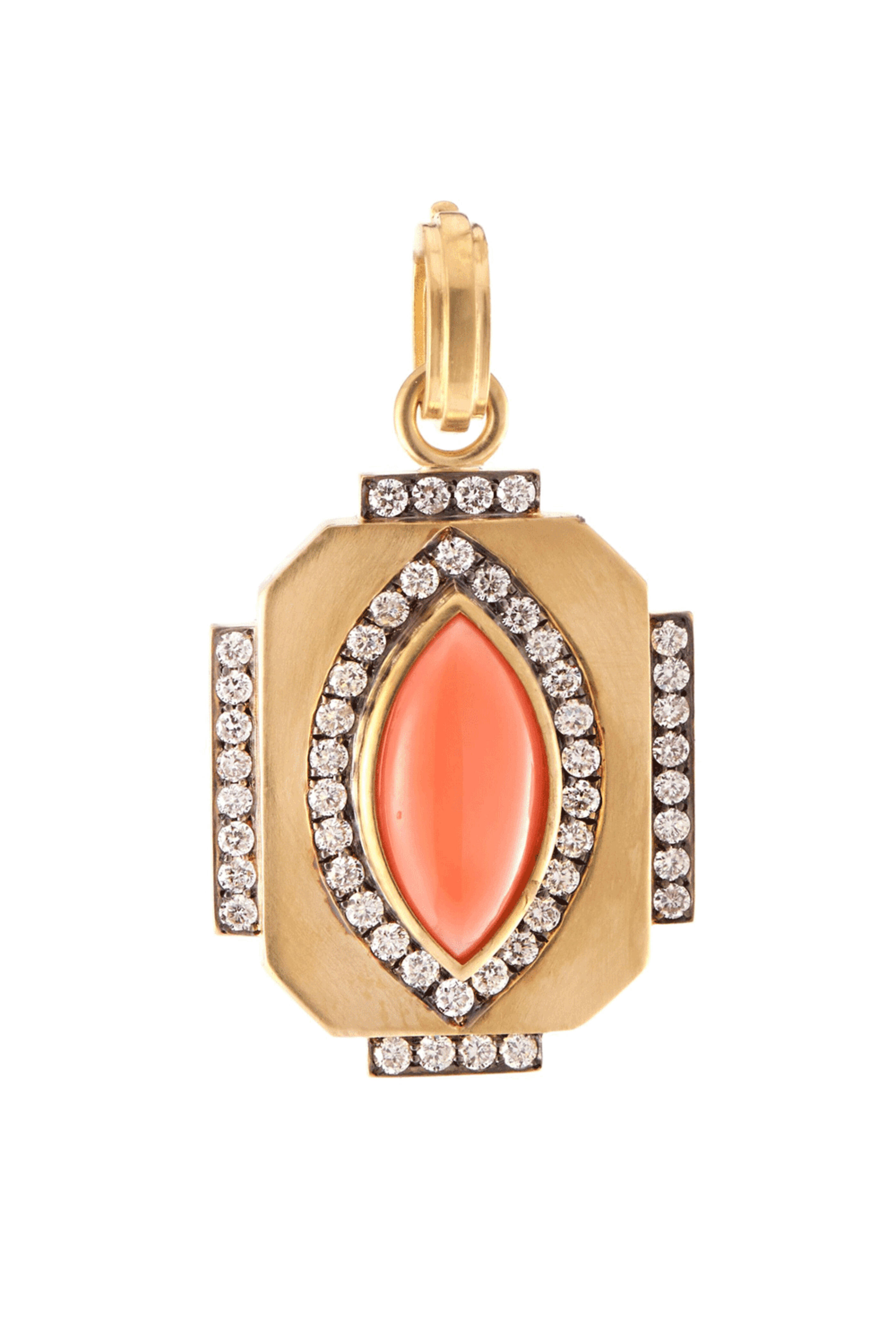 Sylva & Cie Coral Gatsby Pendant. 18k gold. Diamond 0.90 total carat weight. Coral 2.90 total carat weight. Round, brilliant cut diamond. Gatsby inspired design. Marquise cut coal with diamonds surrounding. Gold bezel. Hinge bail. Made in the USA.
