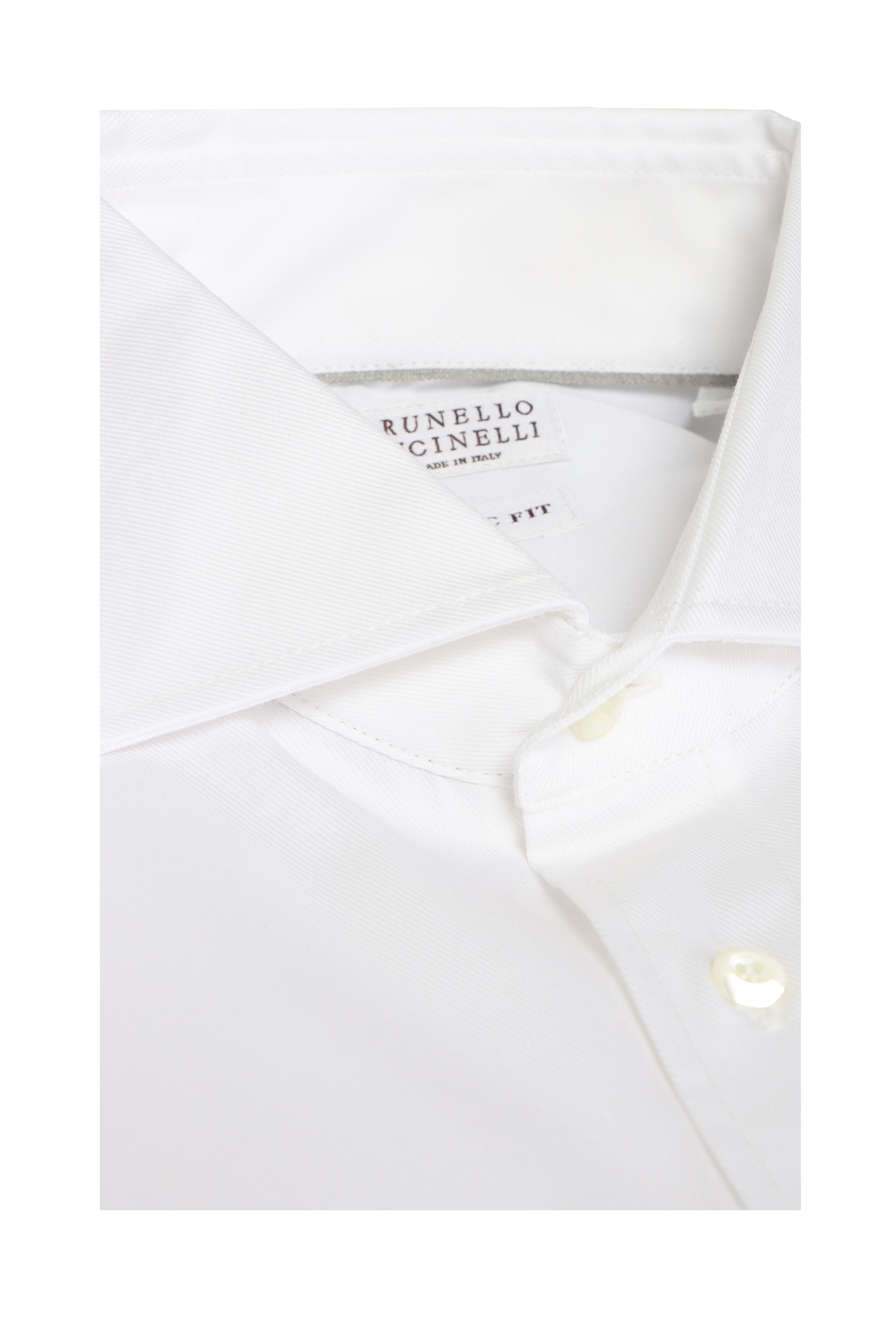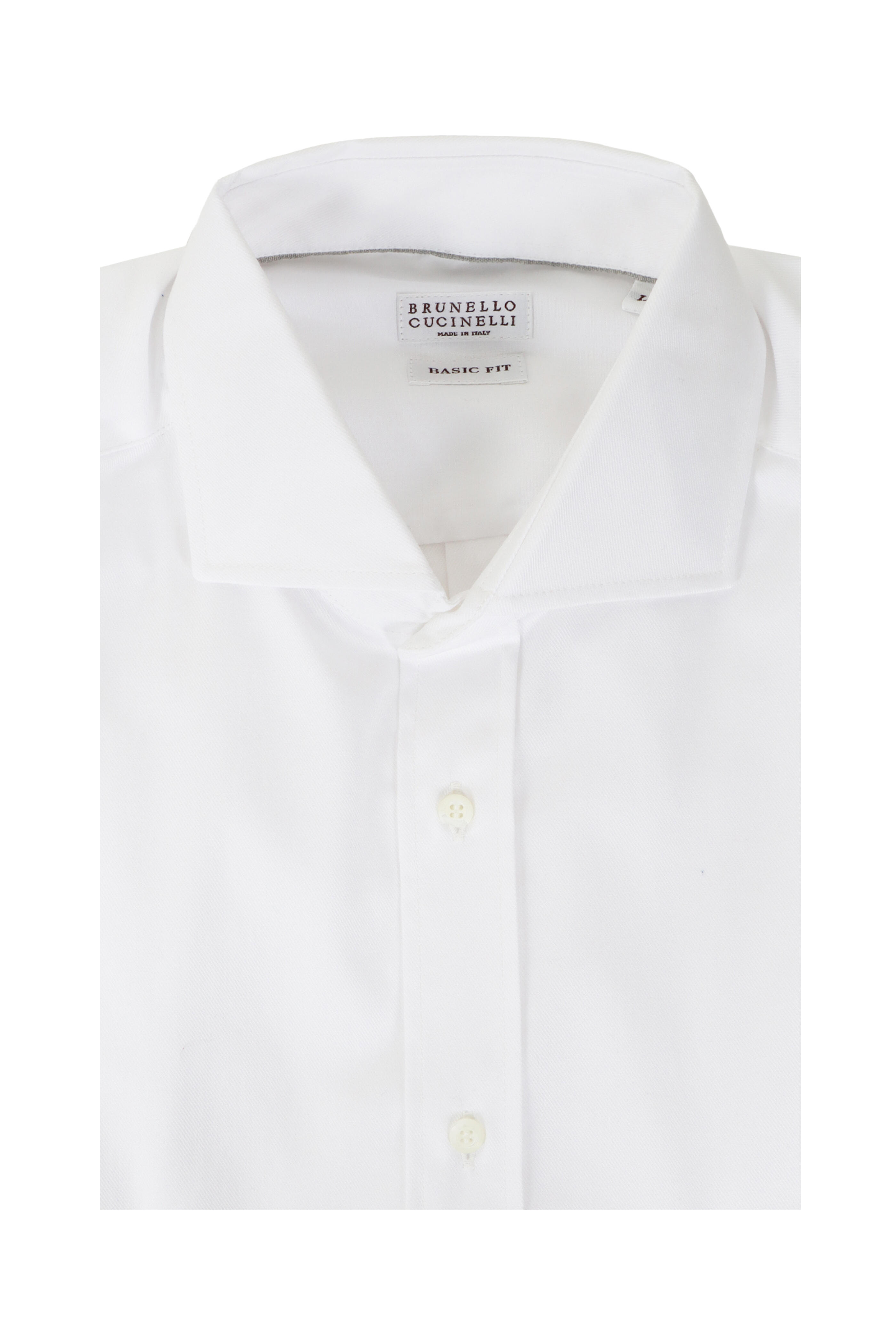 Spread collar. French front button placket. Single button rounded cuffs. Made in Italy. Basic fit. 100% cotton. Dry clean.