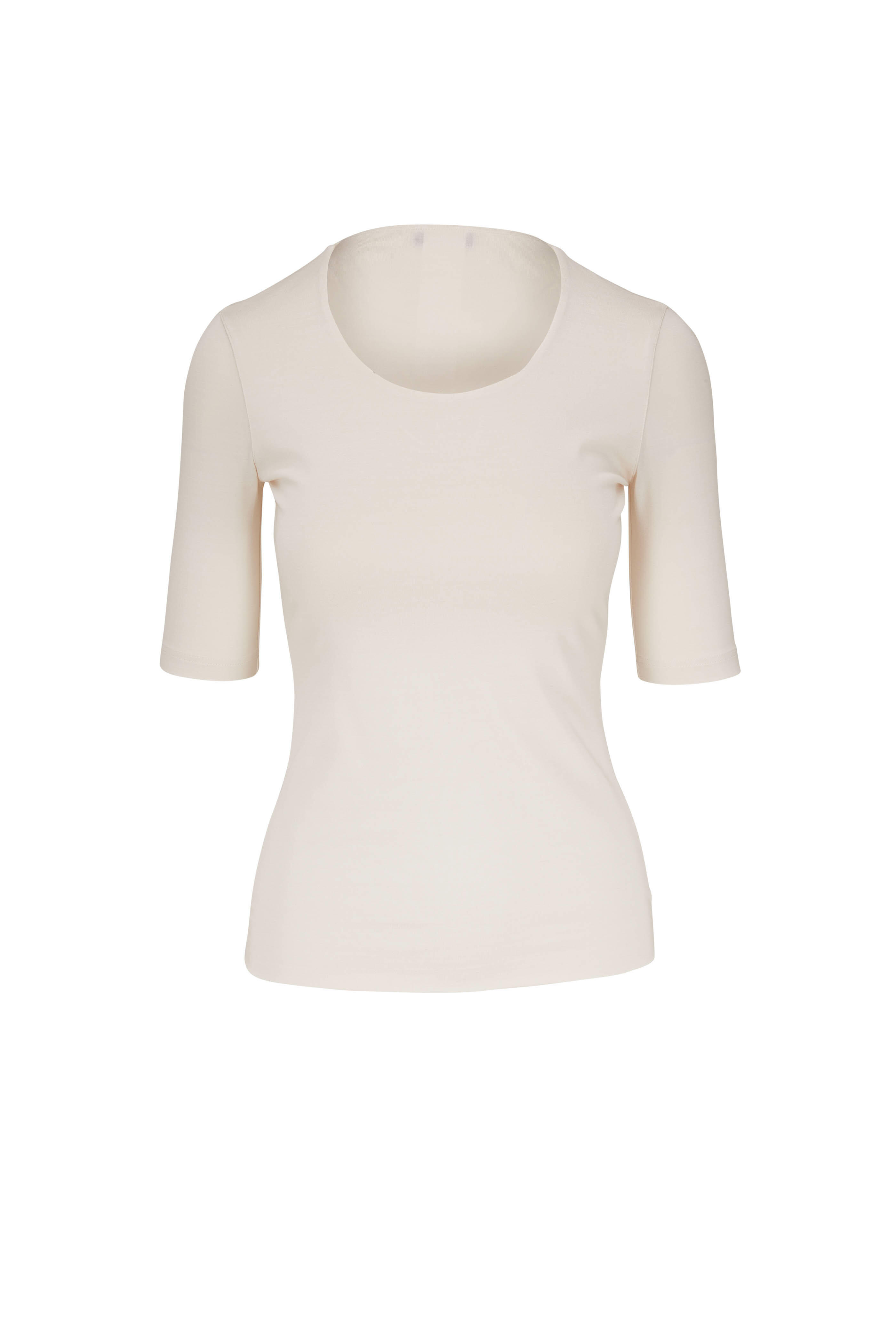 Scoop neckline. Three-quarter sleeves. Imported. 97% mulberry silk, 3% elastane. Dry clean.