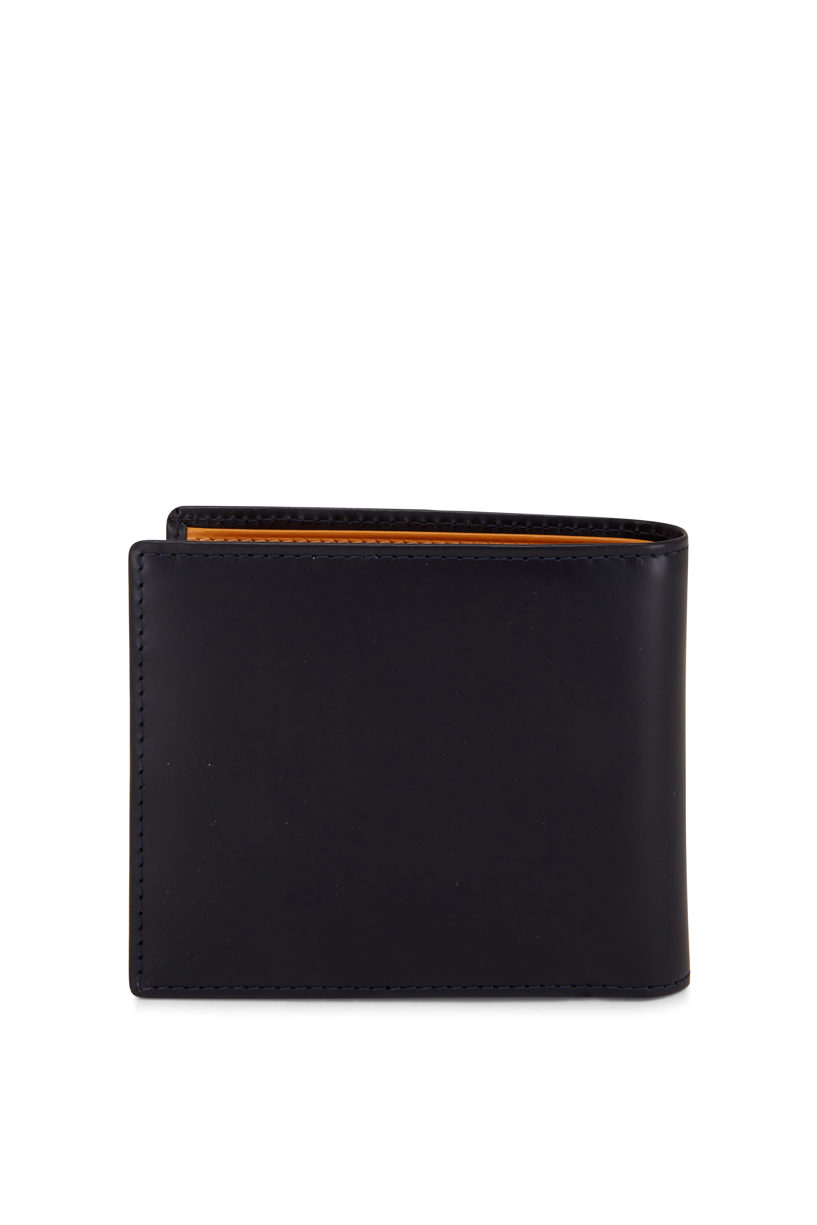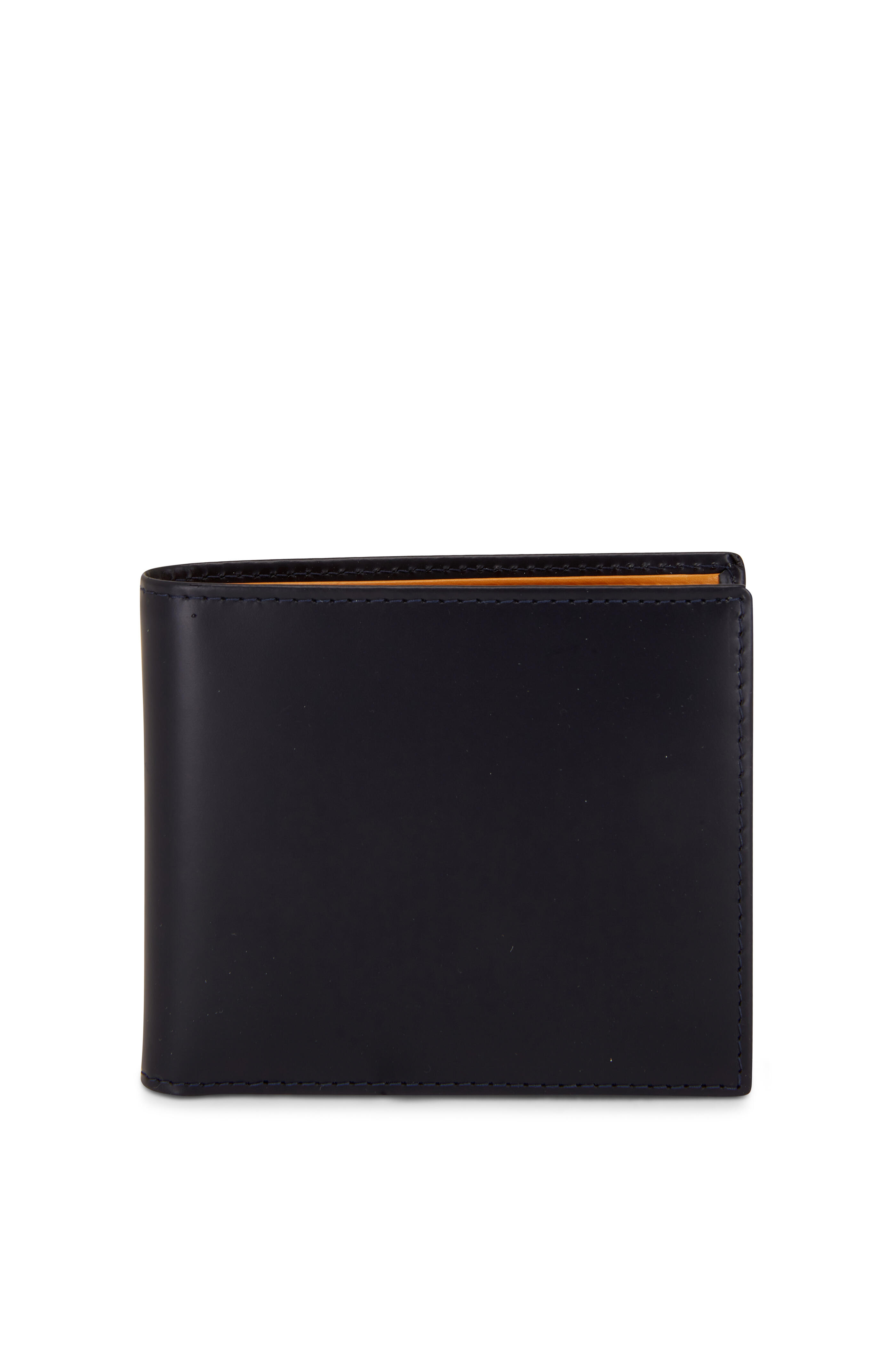 Leather. Six card slots, two note pockets, two slip pockets. Made in England.
