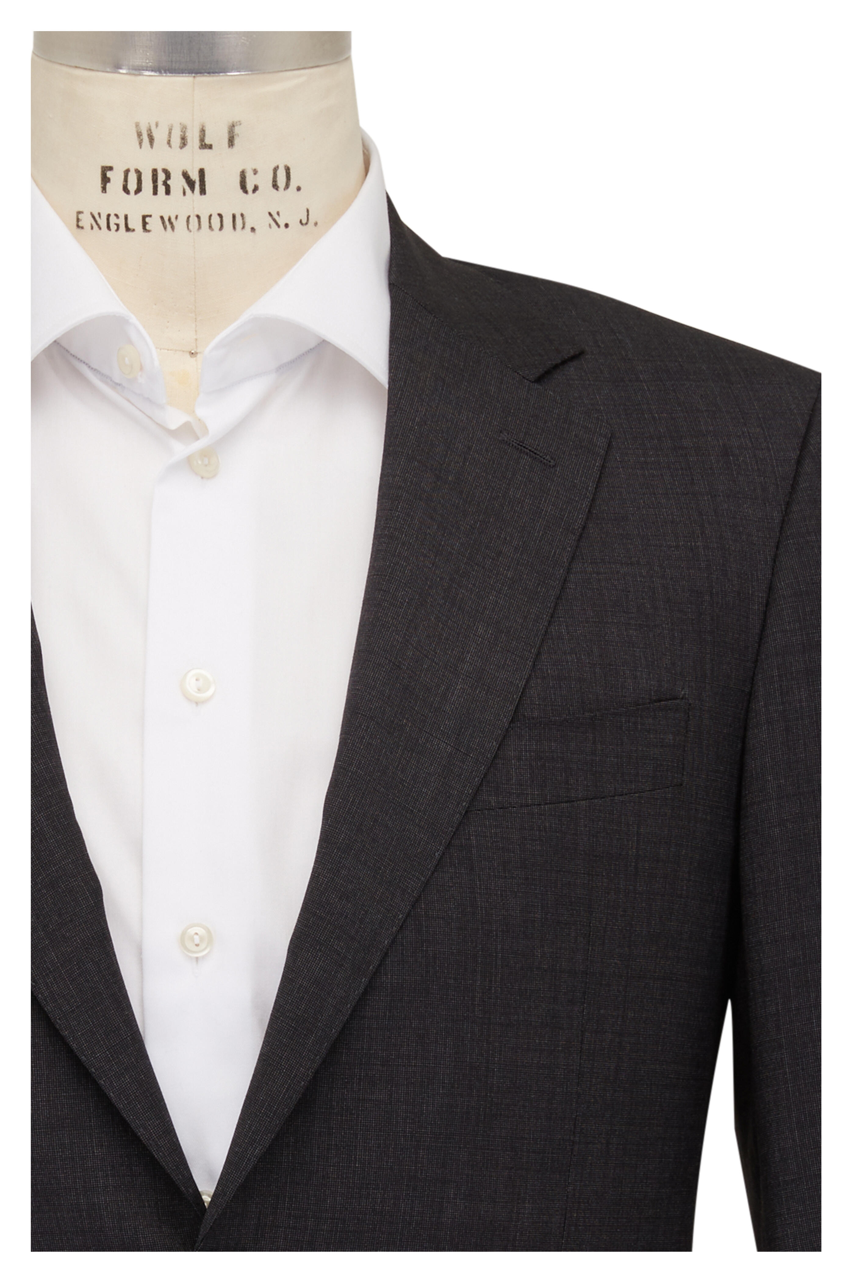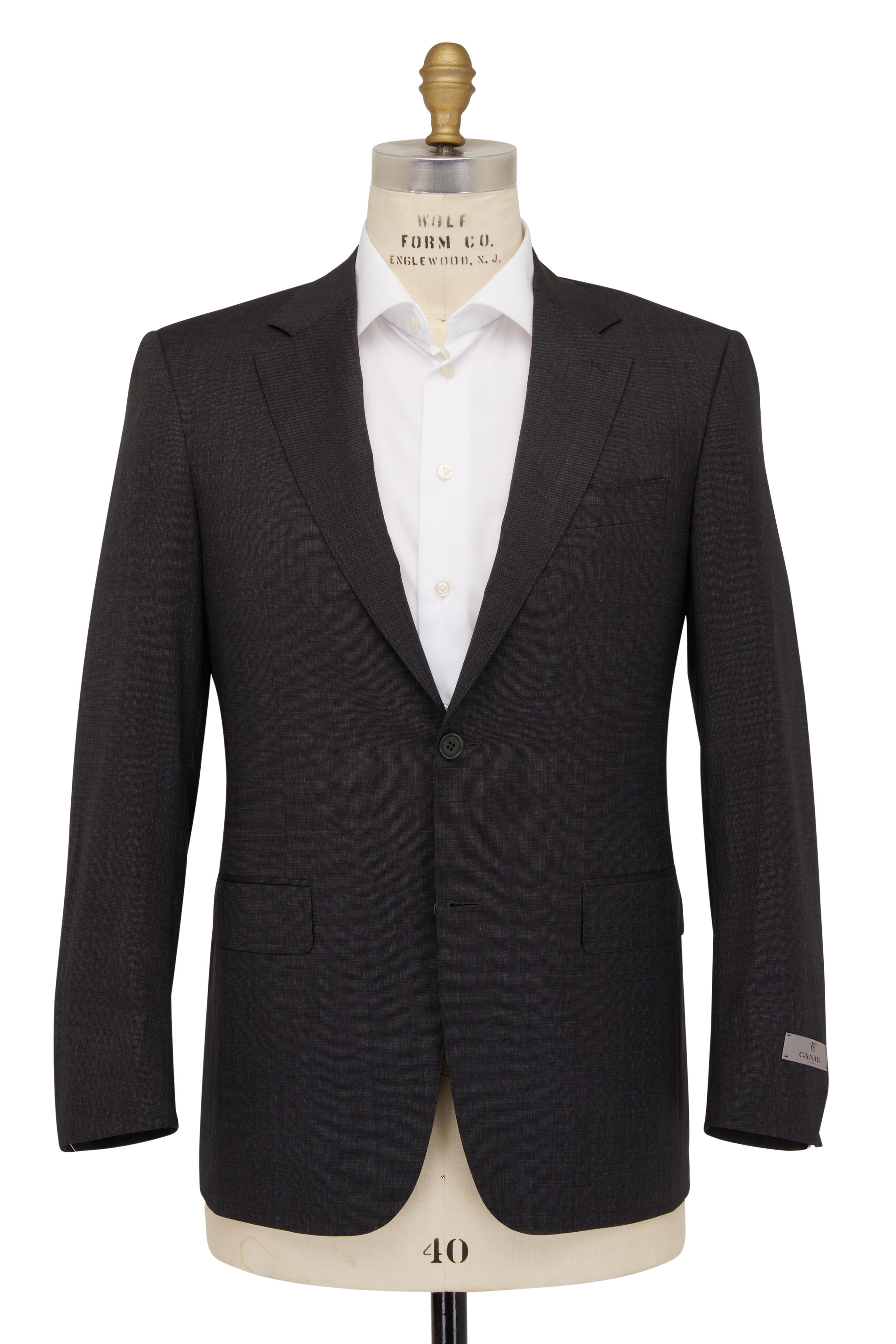 Imported. Jacket: Fully lined. Notched lapels. Front two button closure. Lower flap pockets; chest welt pocket. Double vent. Pant: Banded waist; belt loops. Front slip pockets; back besom pockets. Unfinished hem. 99% wool, 1% elastane. Dry clean.
