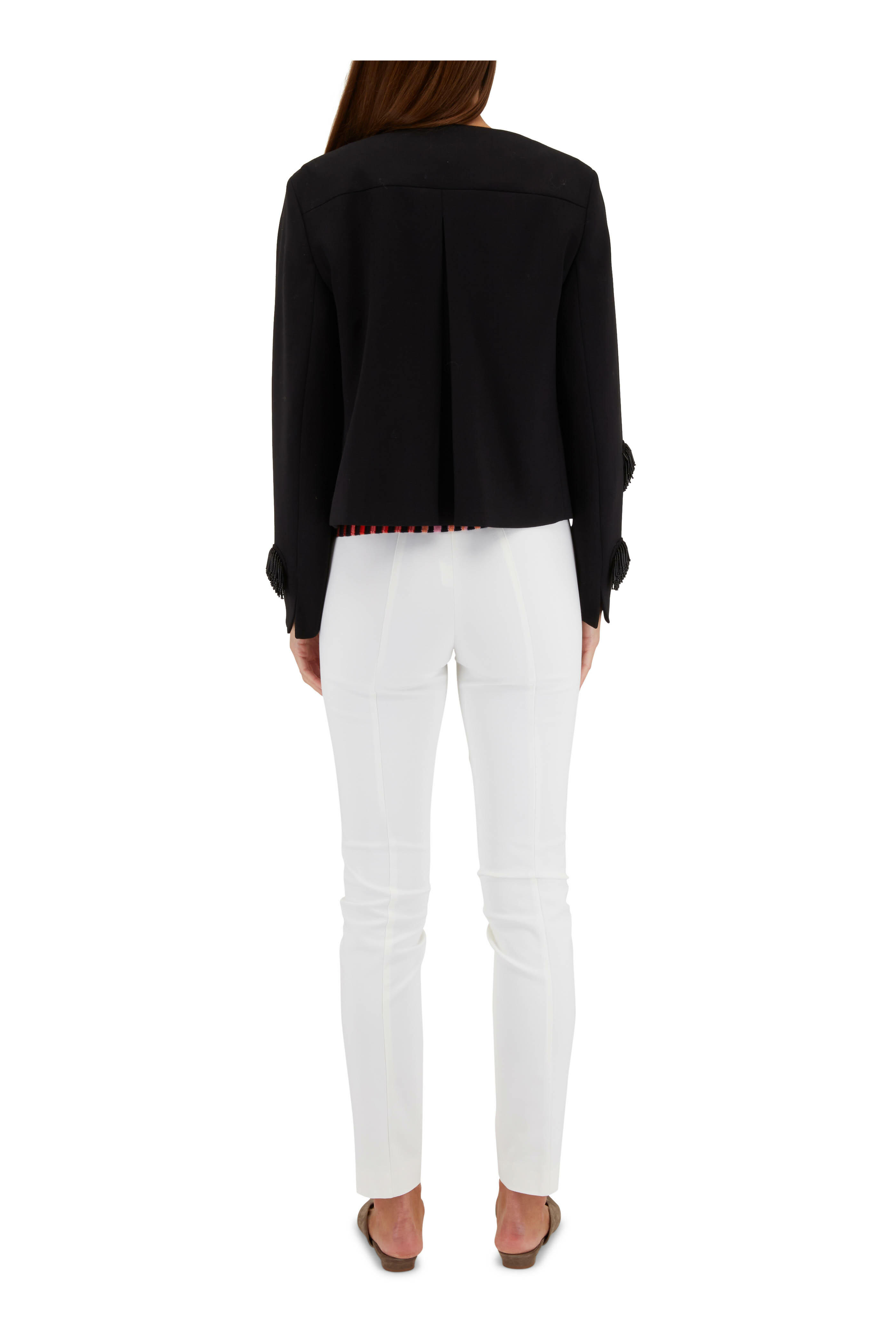 Crew neckline. Concealed front button closure. On-seam pockets. Bead tassel dot detailing. Imported. About 25" shoulder to hem. 95% virgin wool, 5% elastane; lining: 100% cupro; trim: 100% polyresin. Dry clean.