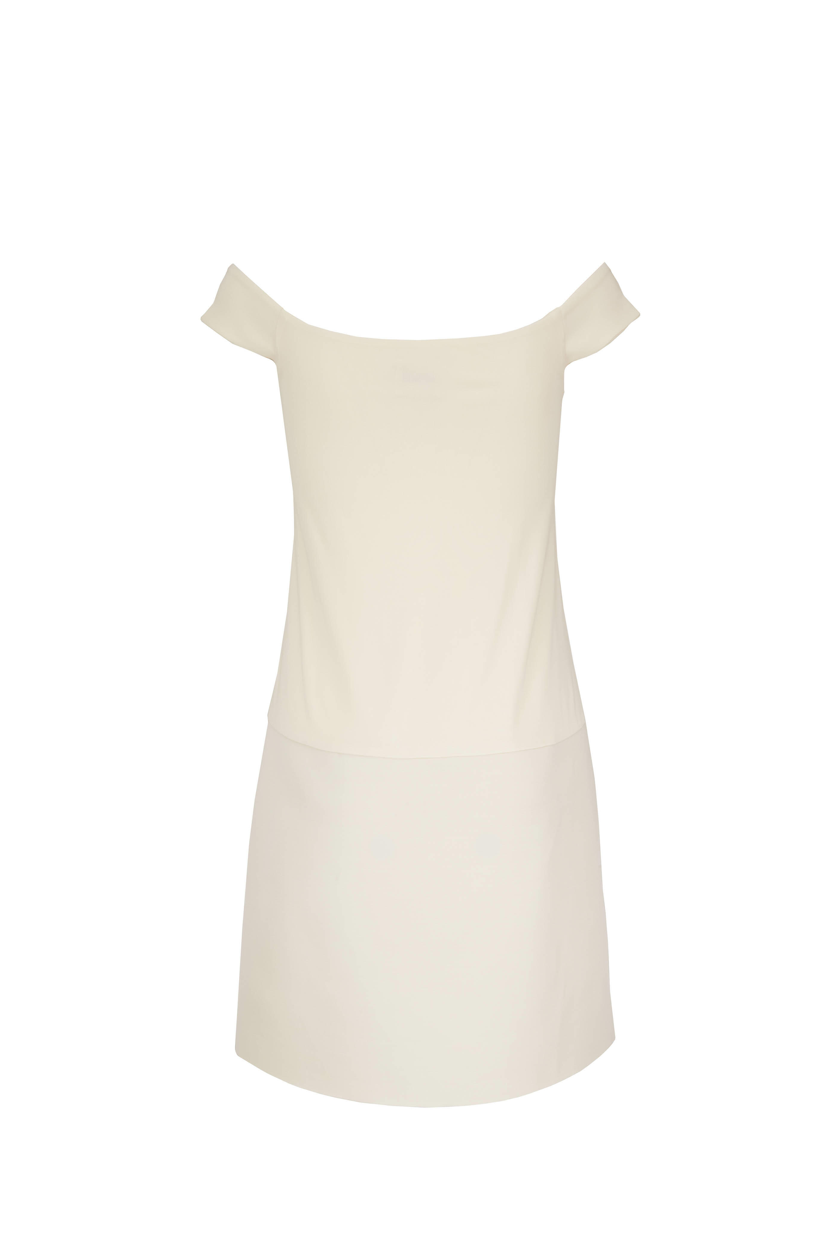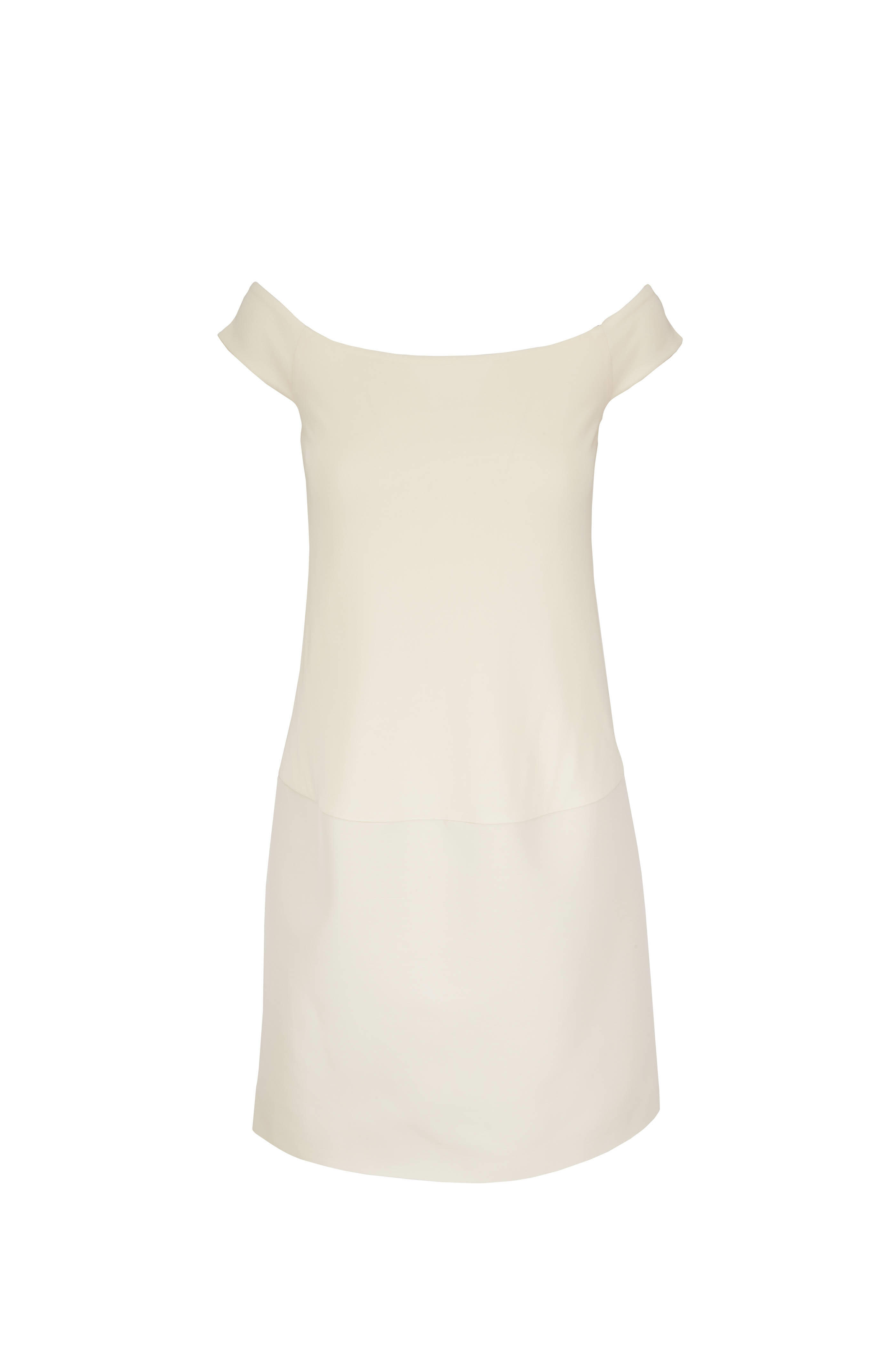 Off-the-shoulder neckline. Slip over style. Drop waist. Imported. 33" shoulder to hem. 100% viscose. Dry clean.