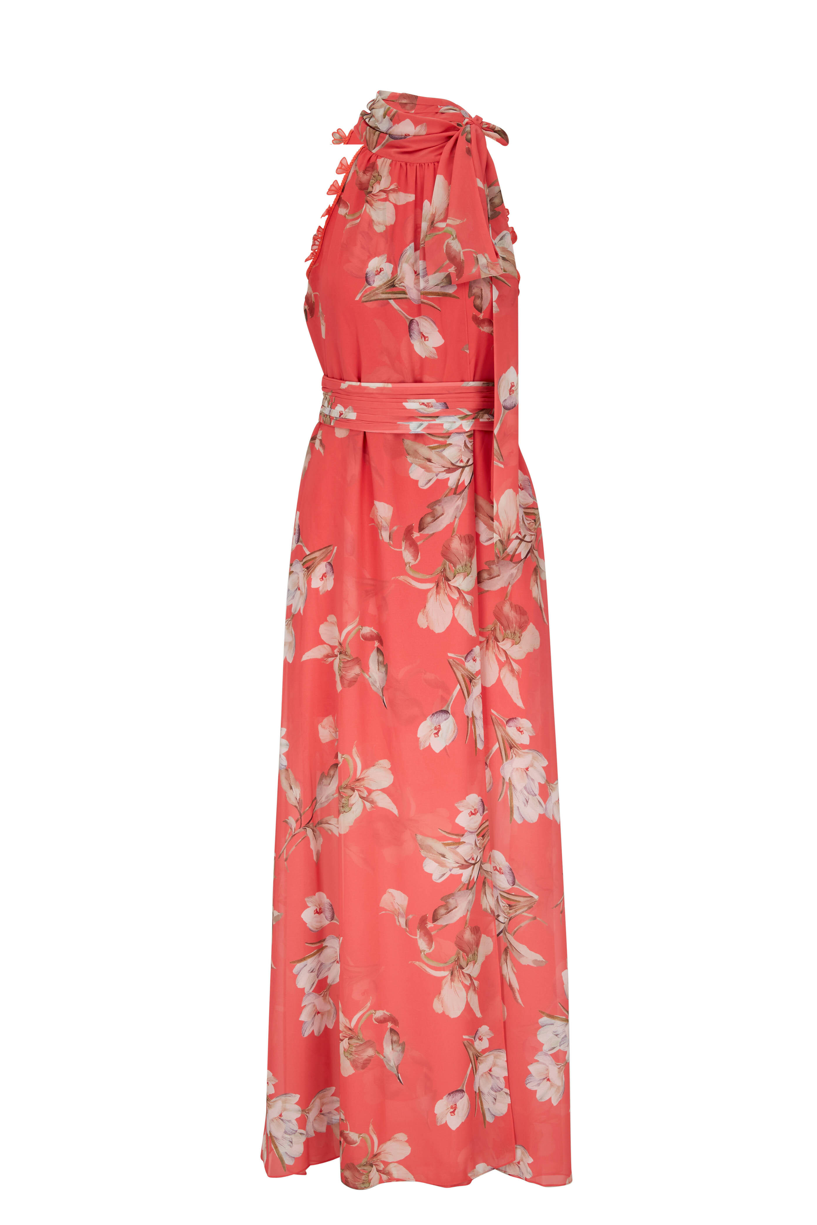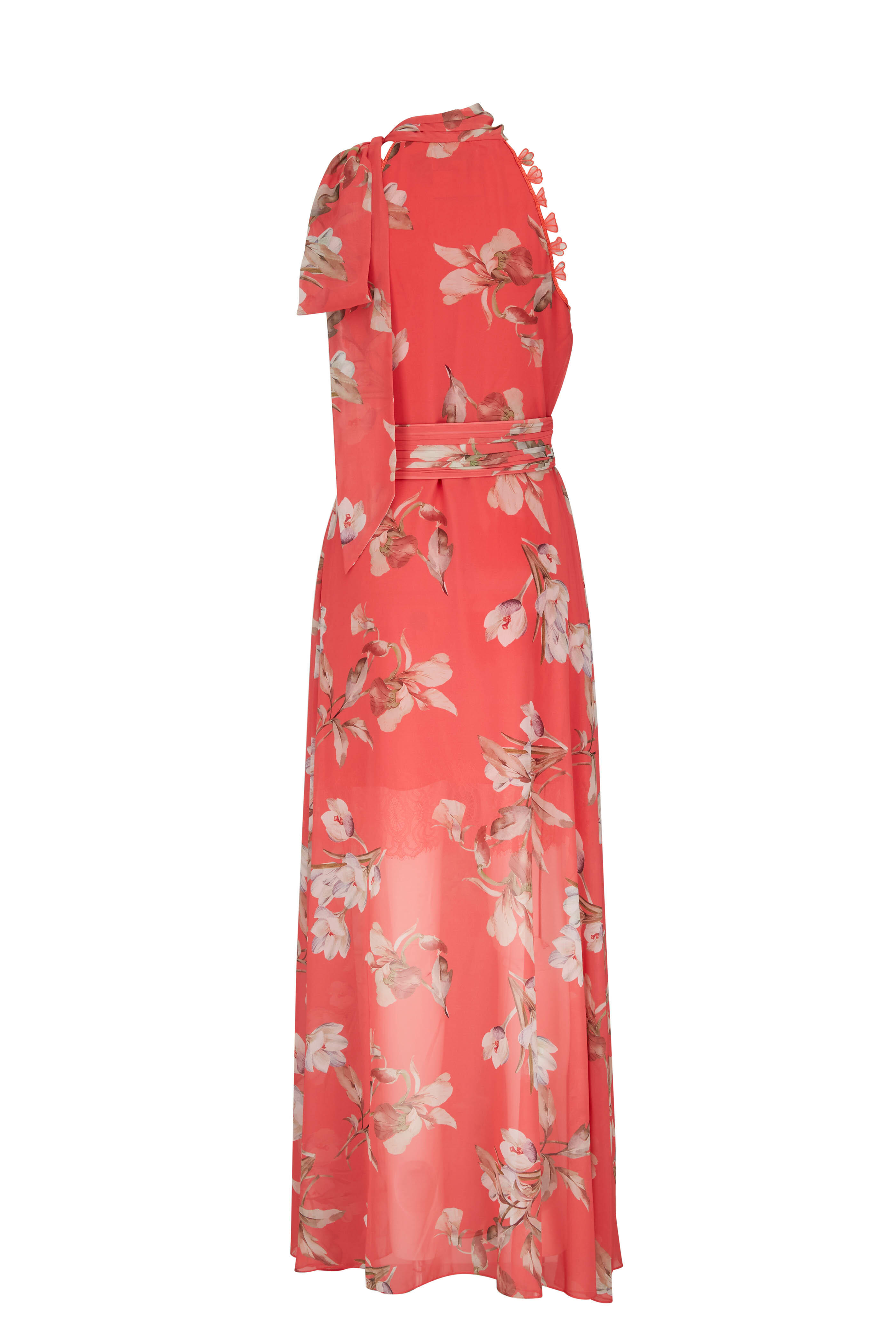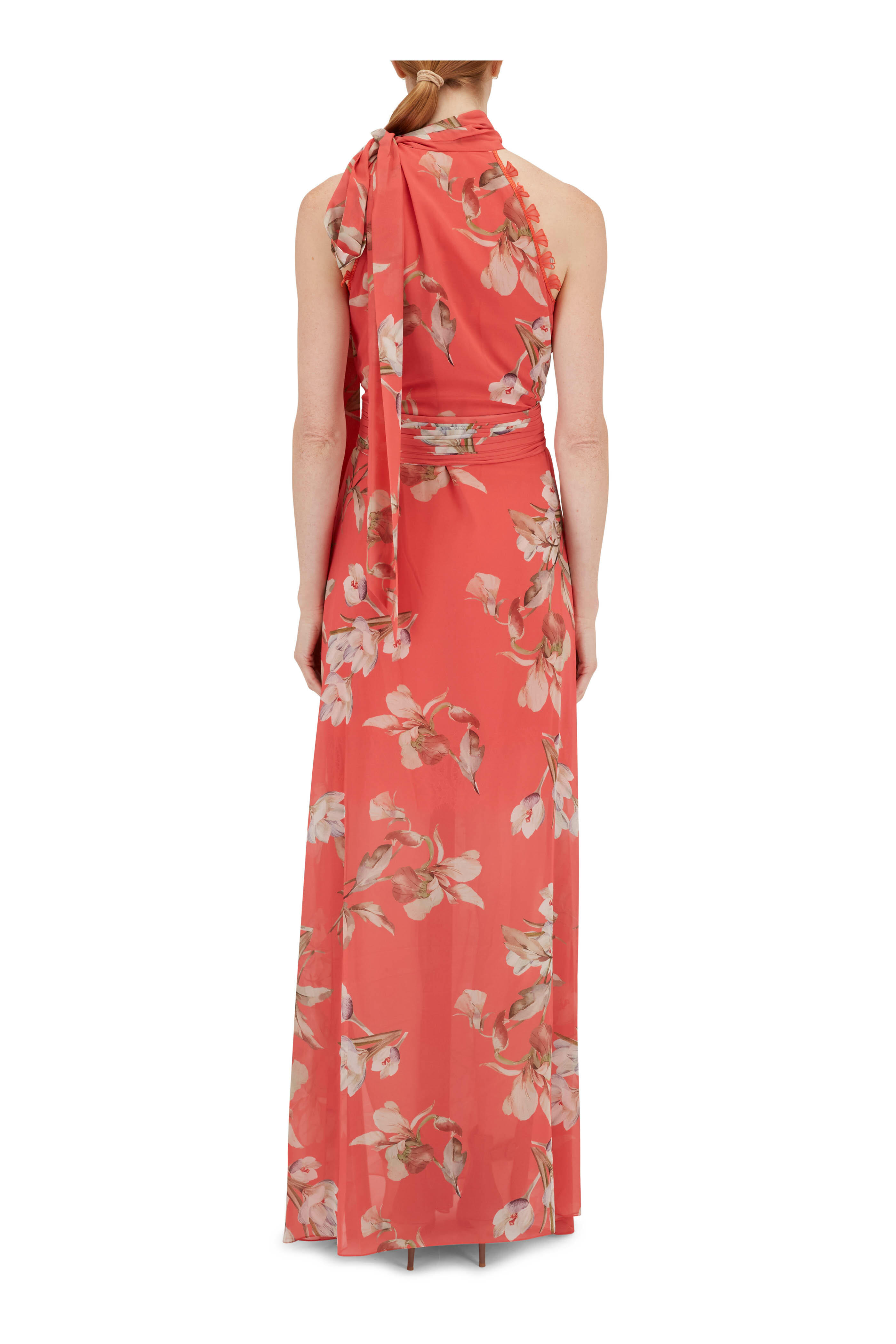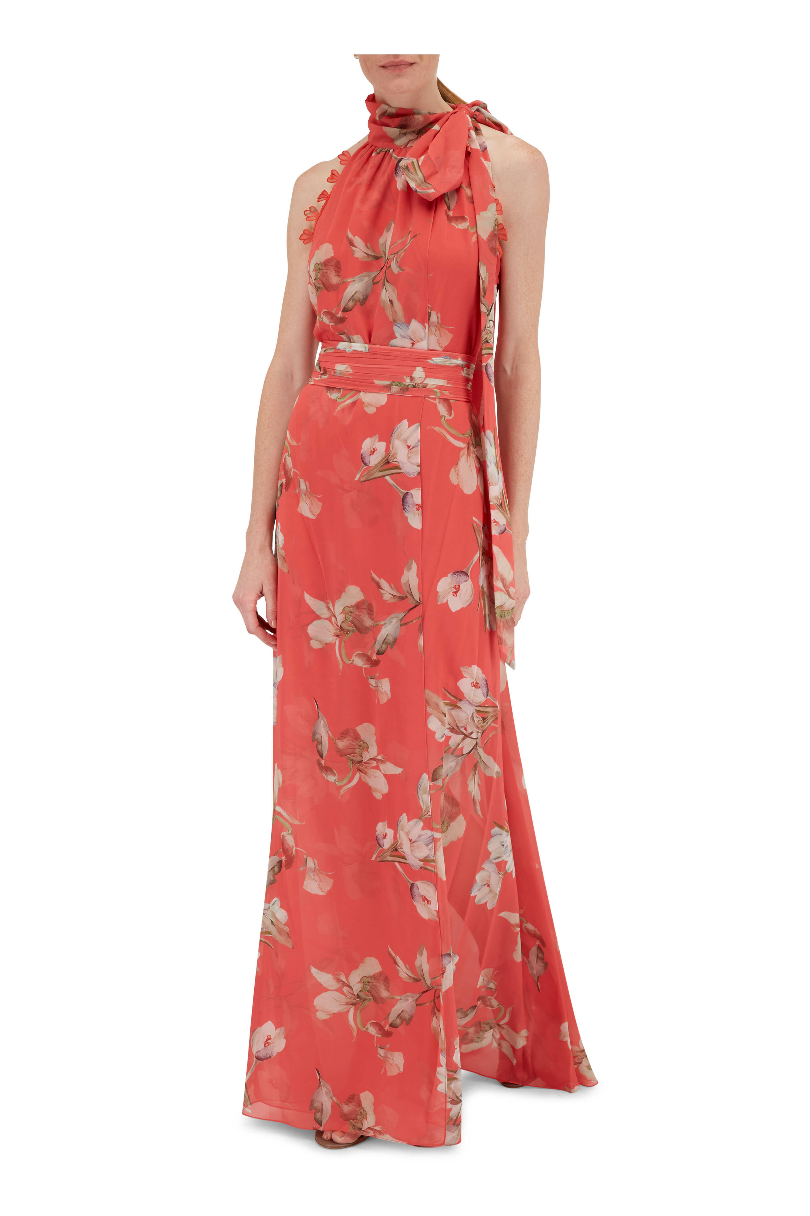 High self-tie neckline. Concealed side zip. Small floral appliques along sleeves. Layered hem. Partially lined. Imported. 100% polyester. Dry clean.