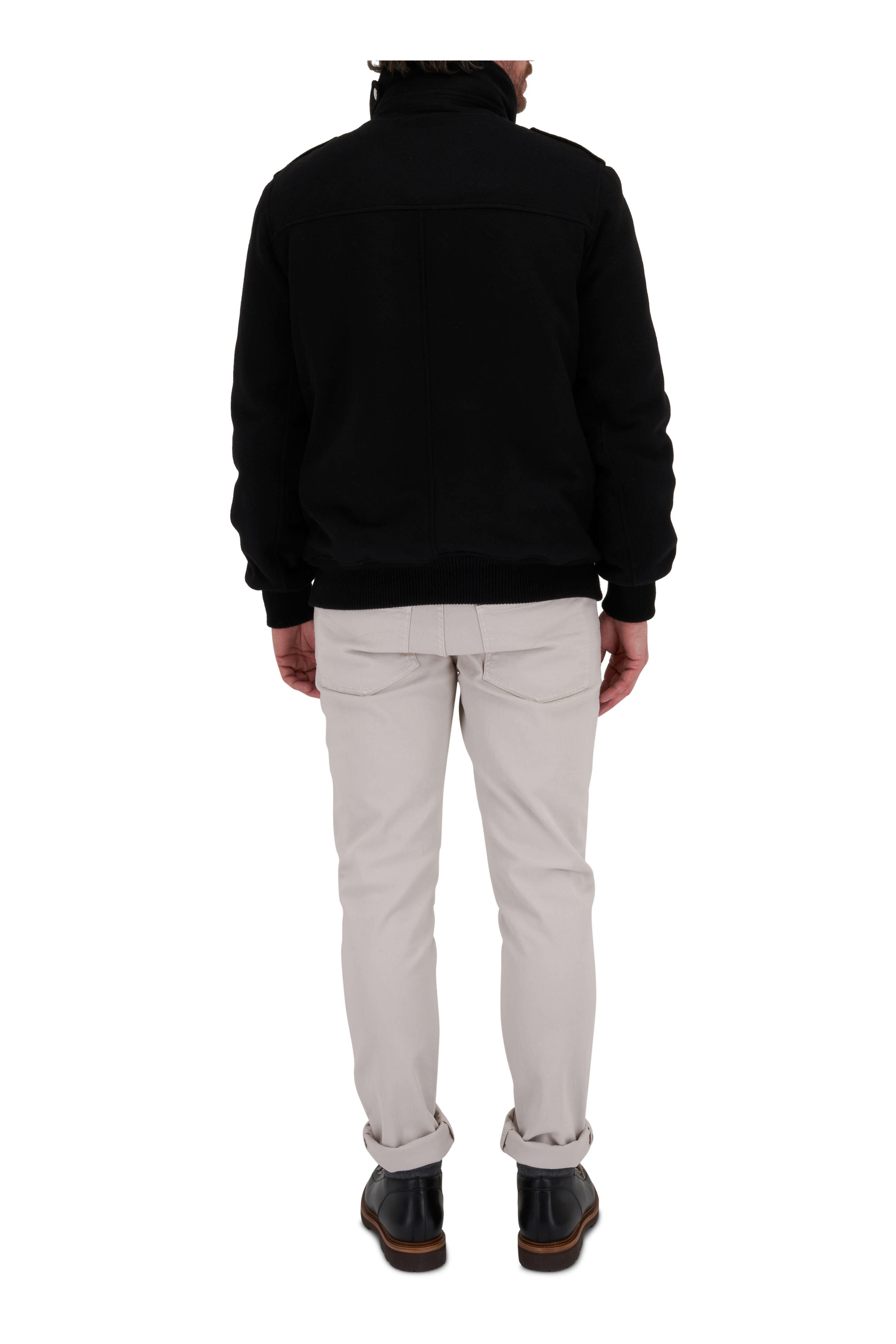 Stand collar. Quarter zip placket. Ribbed trim. Made in Italy. 100% cashmere. Dry clean.