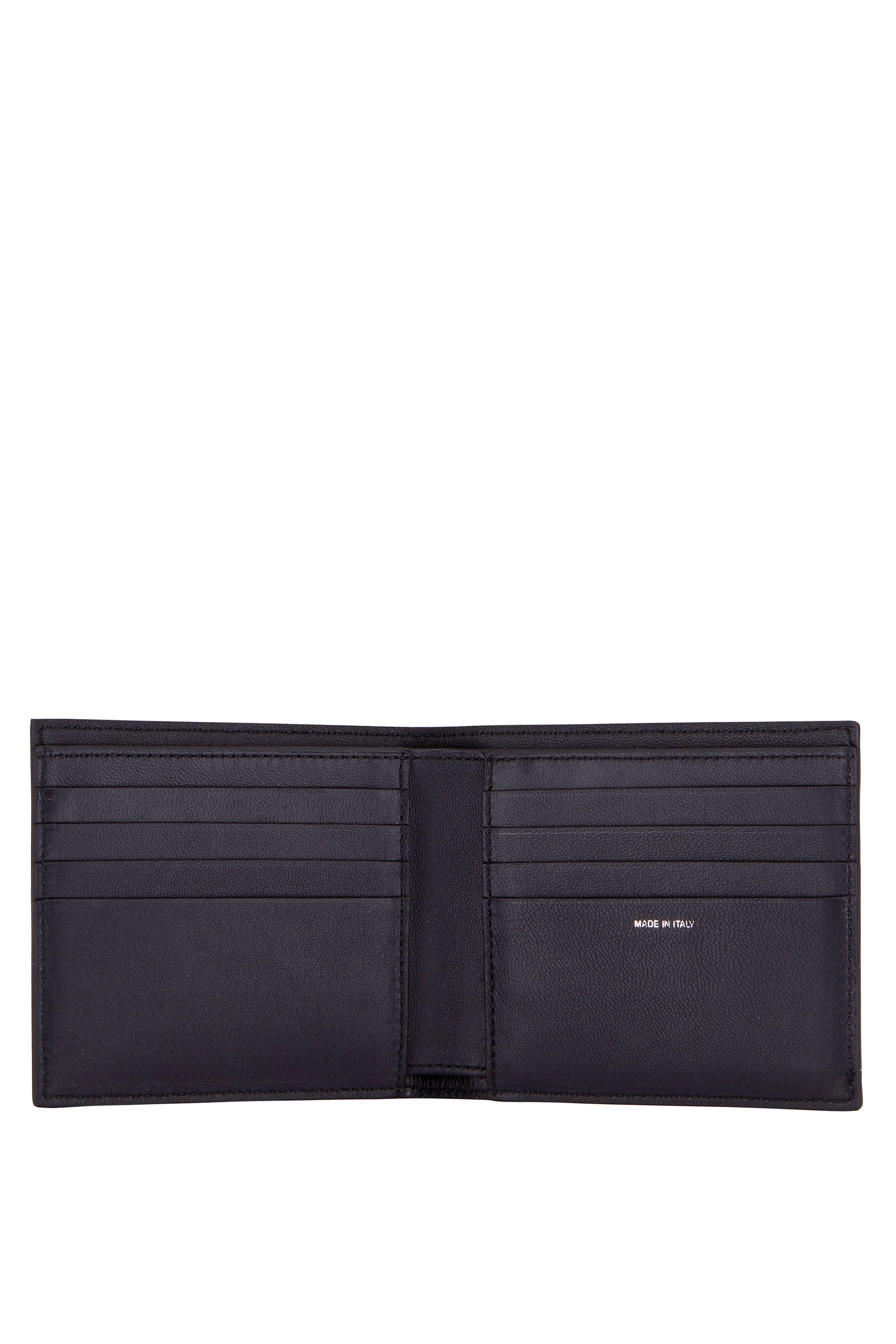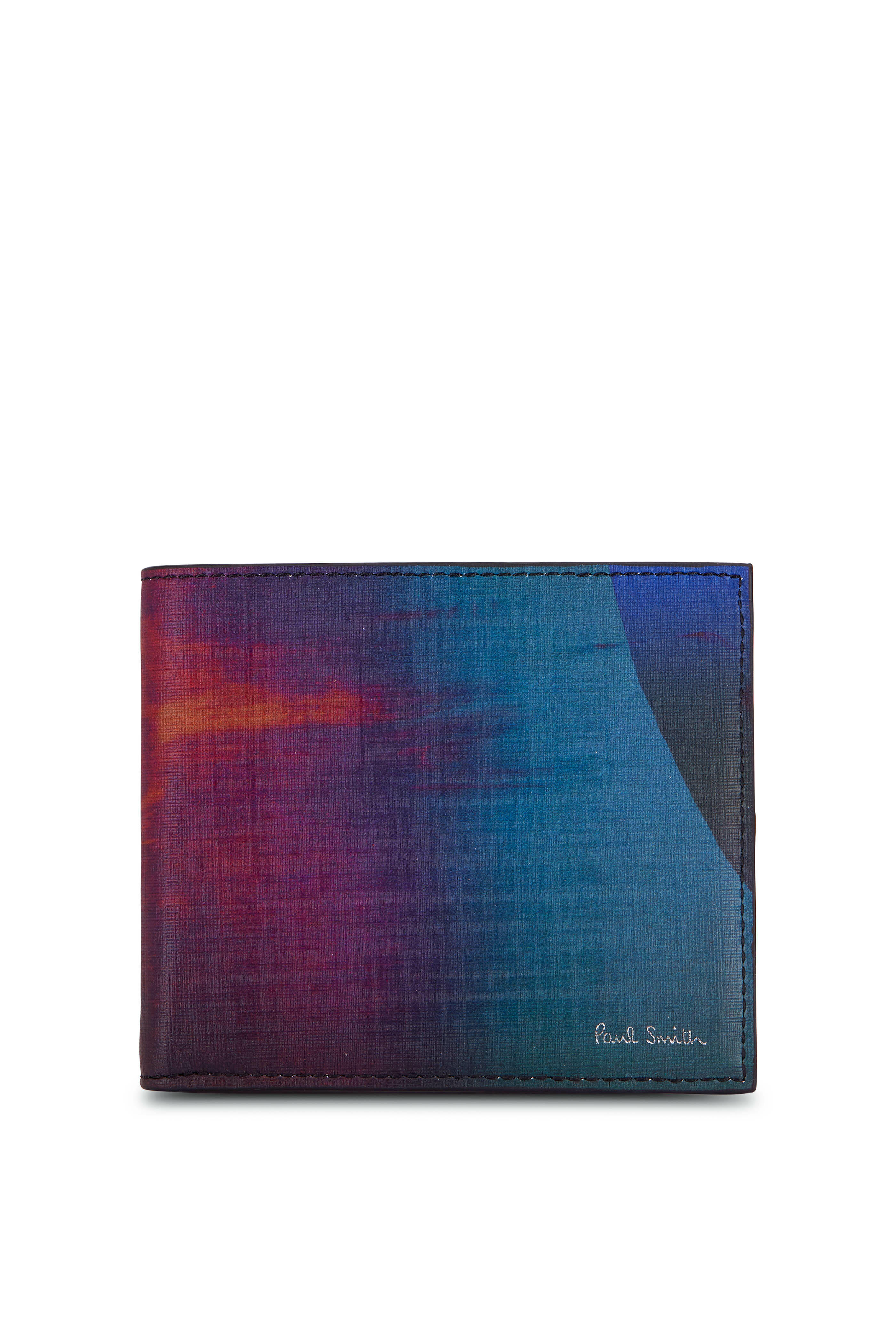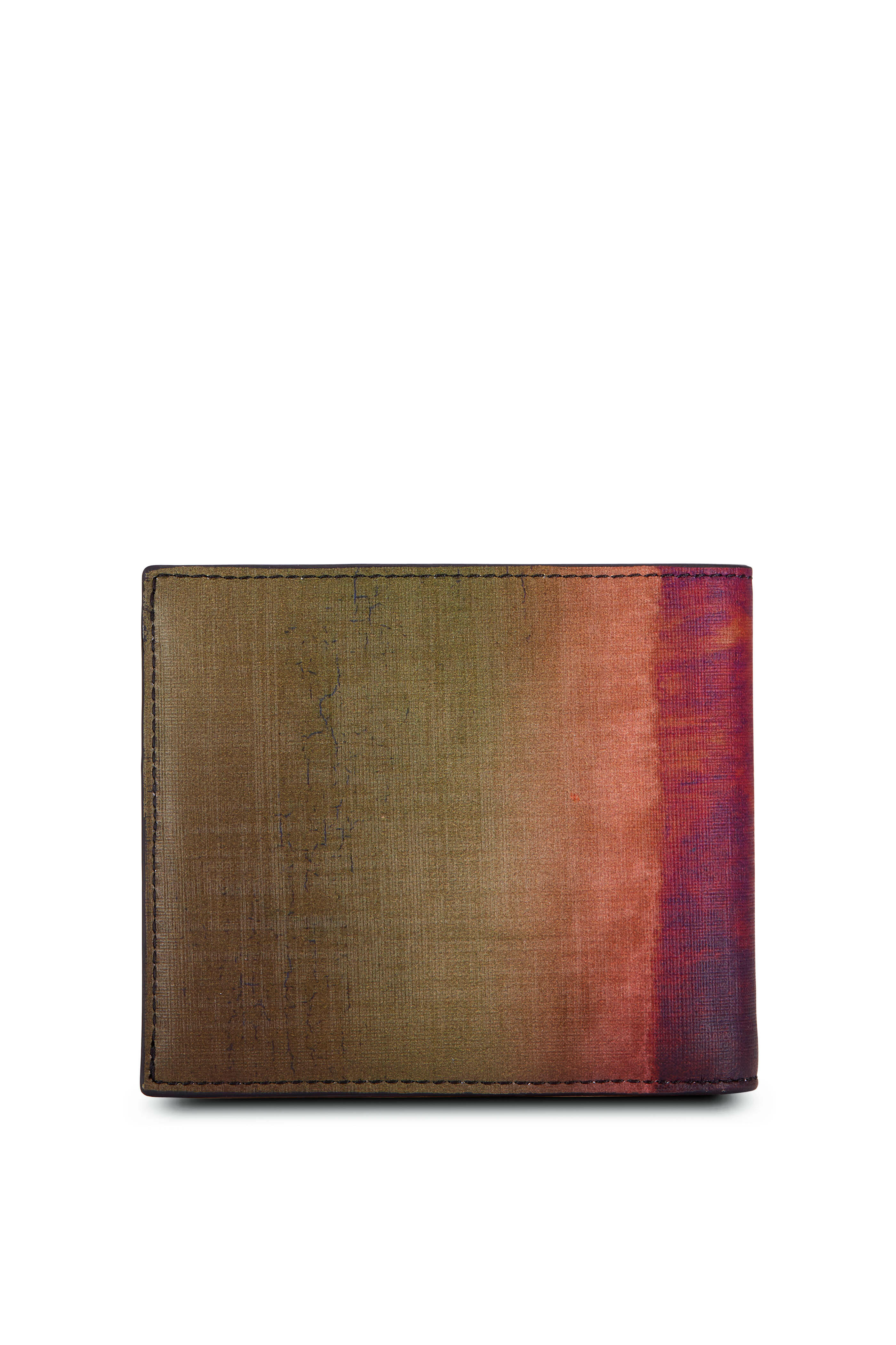 Printed leather. Bi-fold. One center bill slots, six card slots. Made in Italy. Height: 3 3/4". Width: 4 1/4".