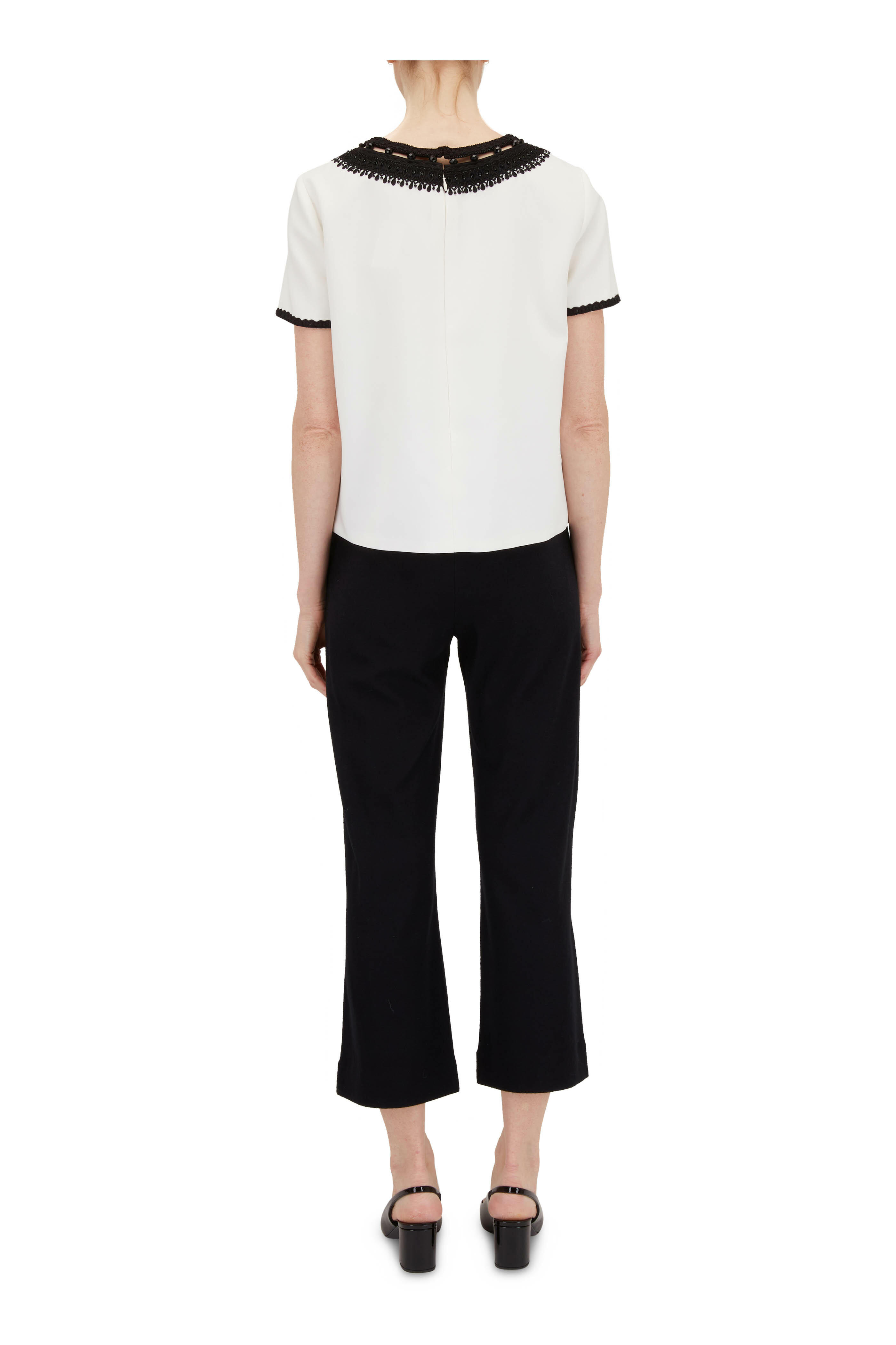 Round, embellished neckline. Concealed back zip. Lace trim sleeves. Made in the USA. 92% polyester, 8% polyurethane; Lining: 100% polyester. Dry clean.