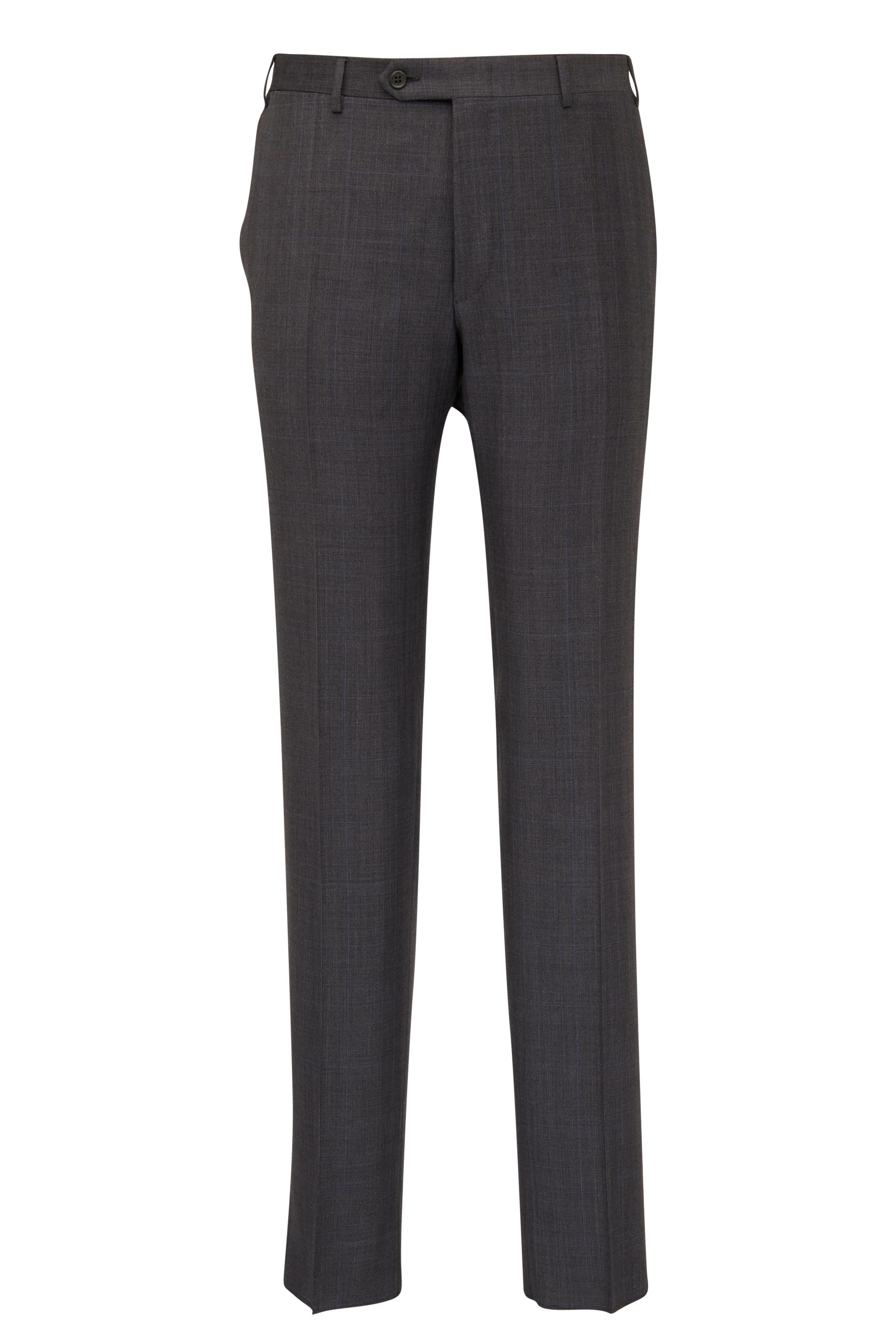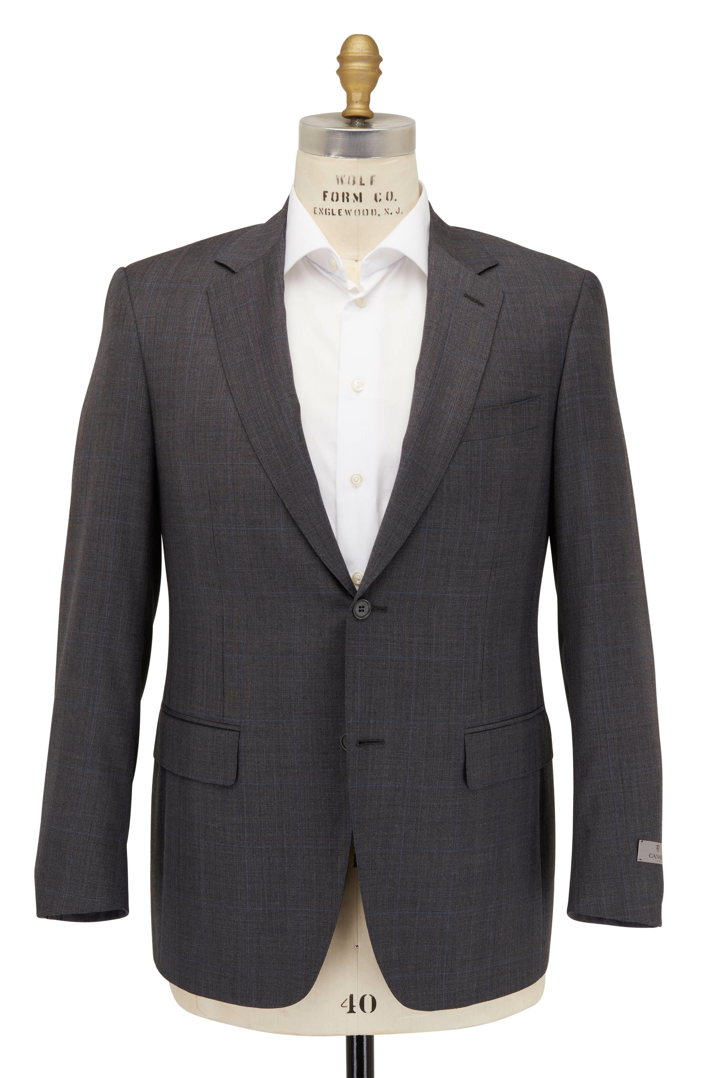 Made in Italy. Jacket: Fully lined. Notched lapels. Two button closure. Lower flap pockets; chest welt pocket. Double vent. Pant: Belt loops. Front slip pockets; back besom pockets; ticket pocket. Unfinished hem. 100%. Dry clean.