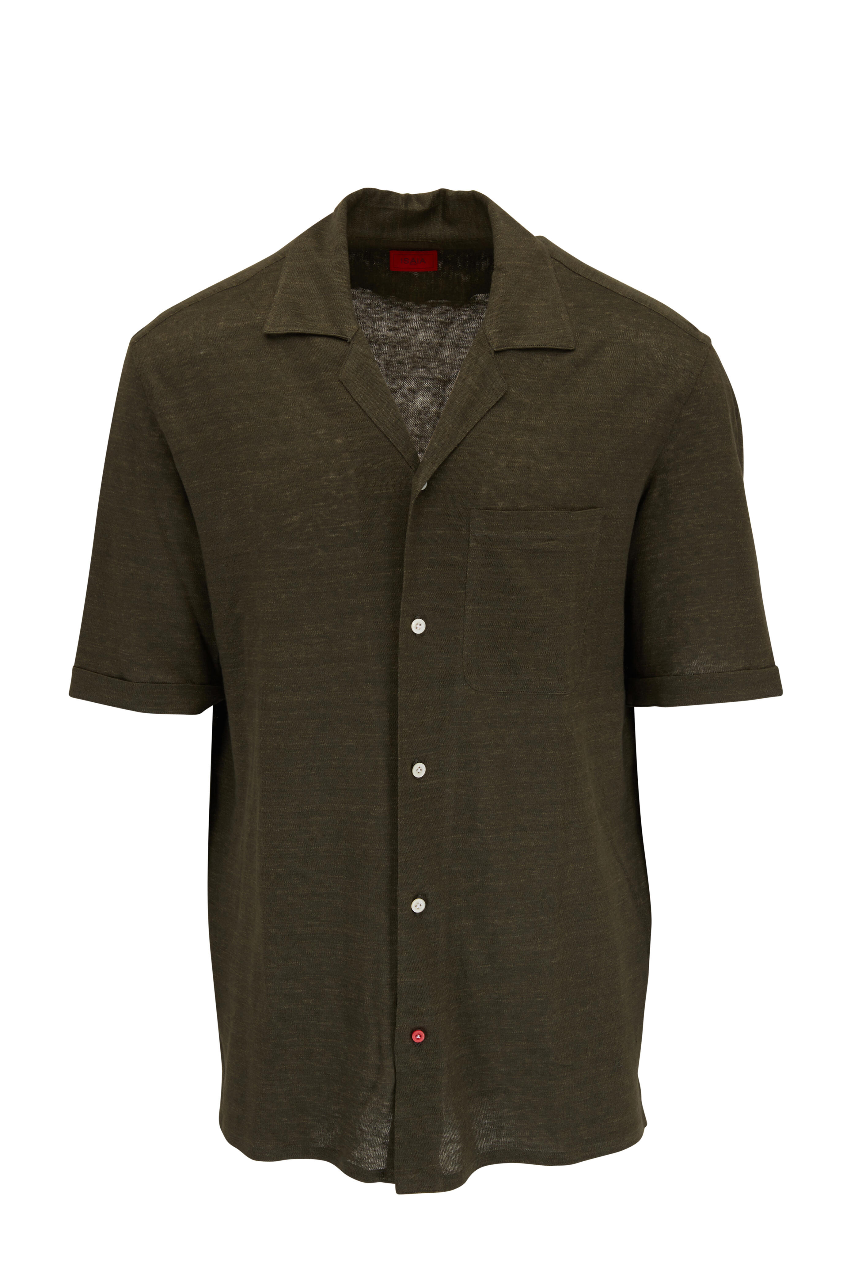 • Isaia - Olive Jersey Linen Short Sleeve Camp Shirt