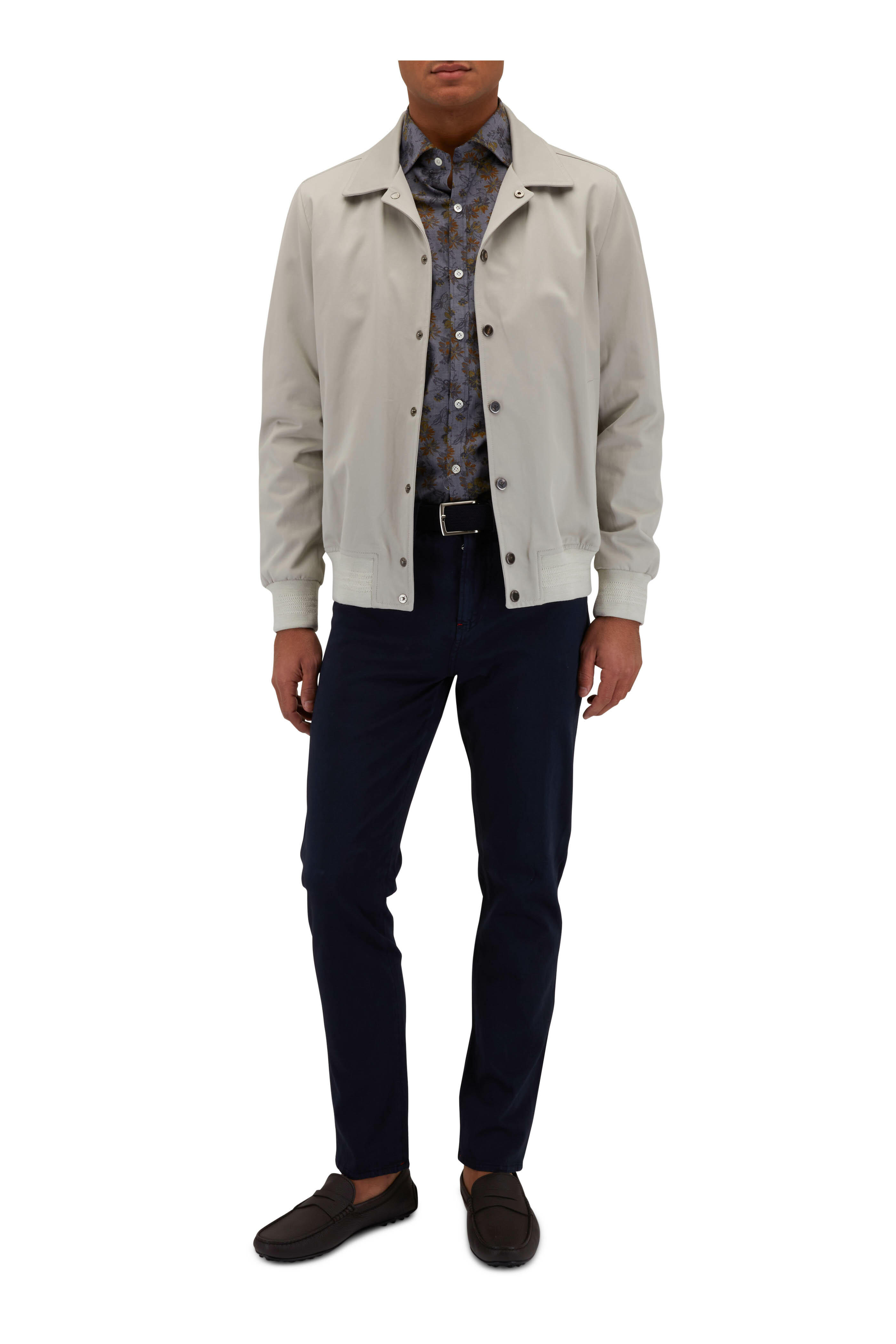 Spread collar. Front snap button placket. Lower waist slip pockets. Ribbed knit trims. Made in Italy. 100% cotton. Dry clean.