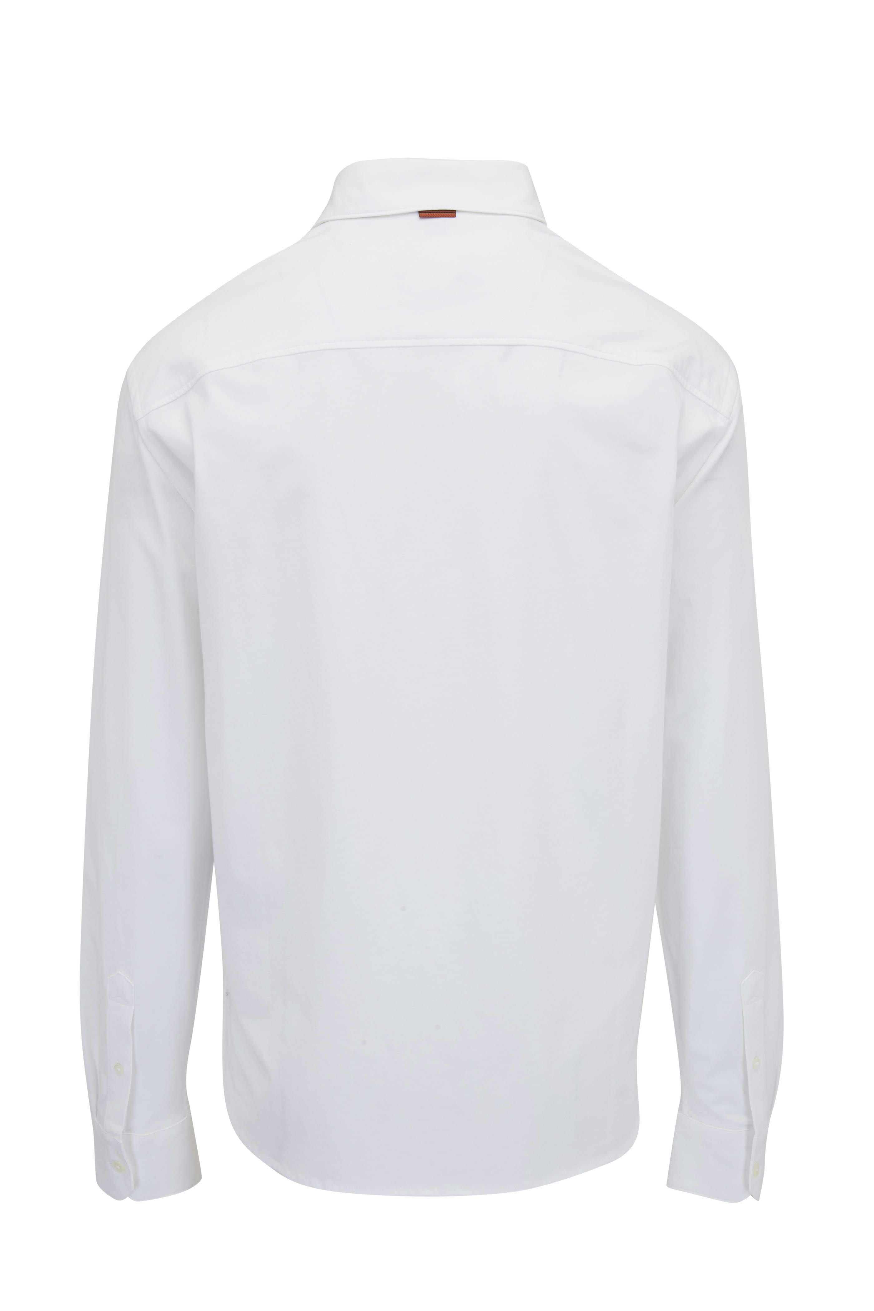 Spread collar. Single button mitered cuffs. Imported. 100% cotton. Machine wash.