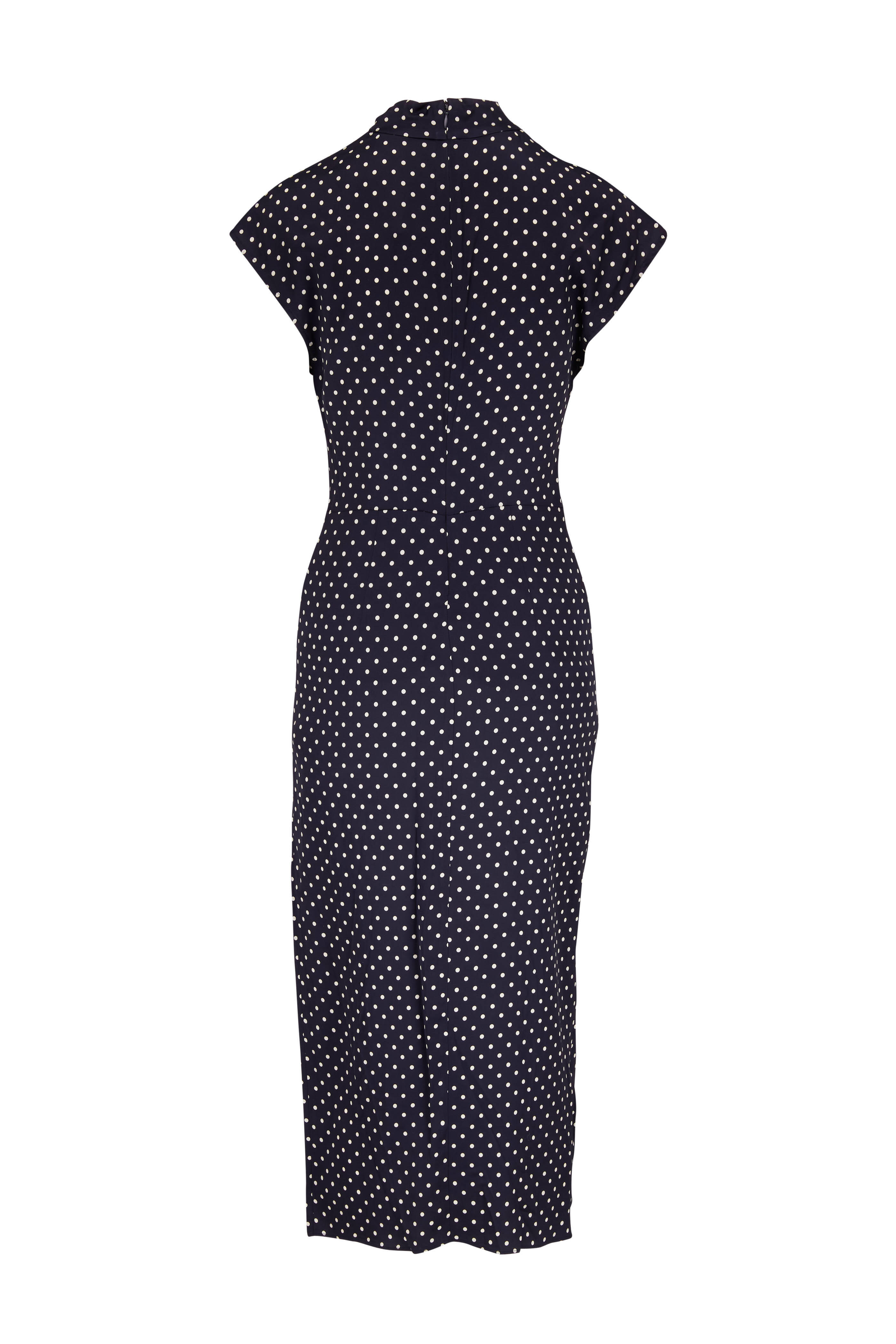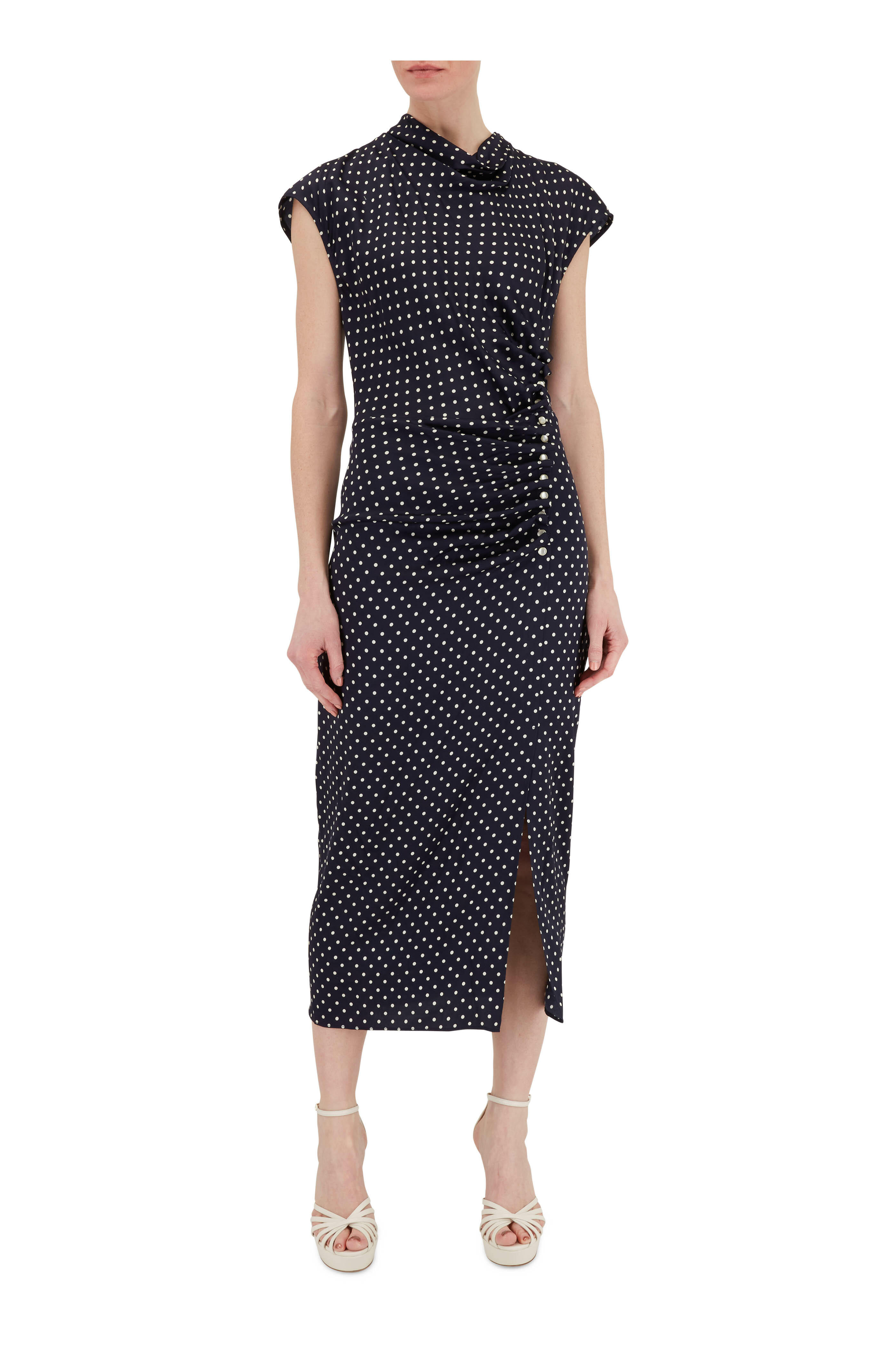 Cowl neckline. Concealed back zip. Cap sleeves. Off-center front slit. Faux front snap detailing. Imported. About 50” from shoulder to hem. 52% silk, 40% viscose, 8% spandex; lined. Dry clean.