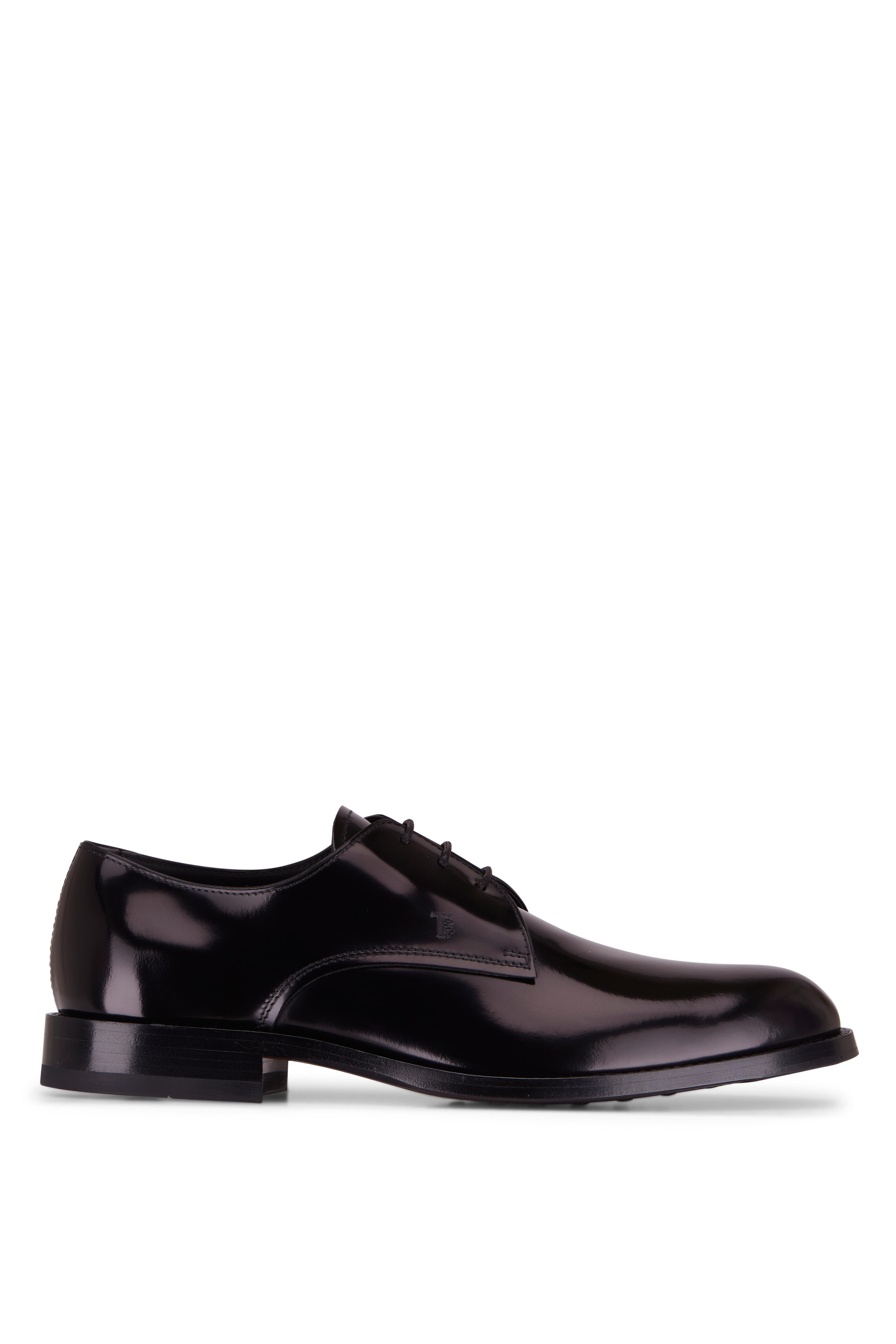 Patent leather upper. Lace-up closure. Stacked heel. Leather lining and insole. Rubber sole with pebble detailing. Made in Italy.