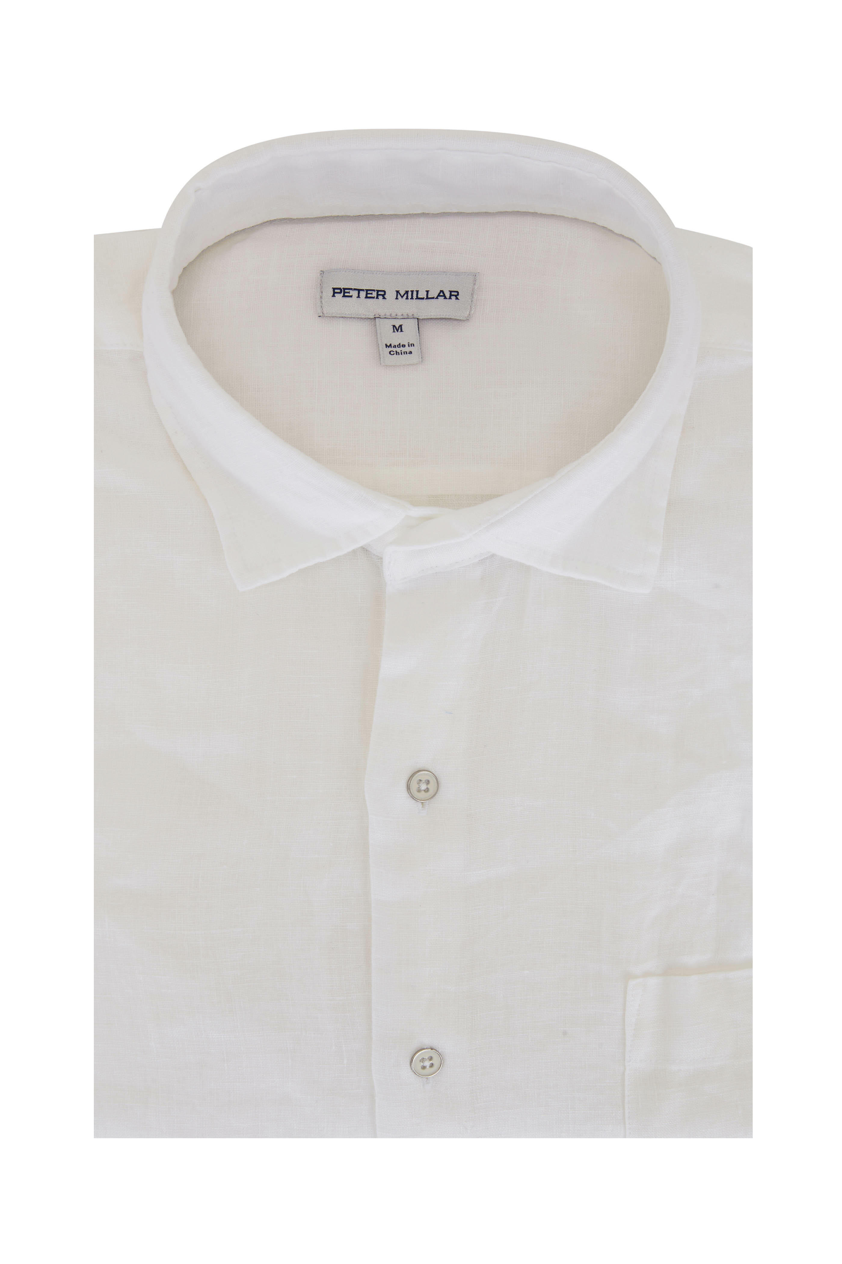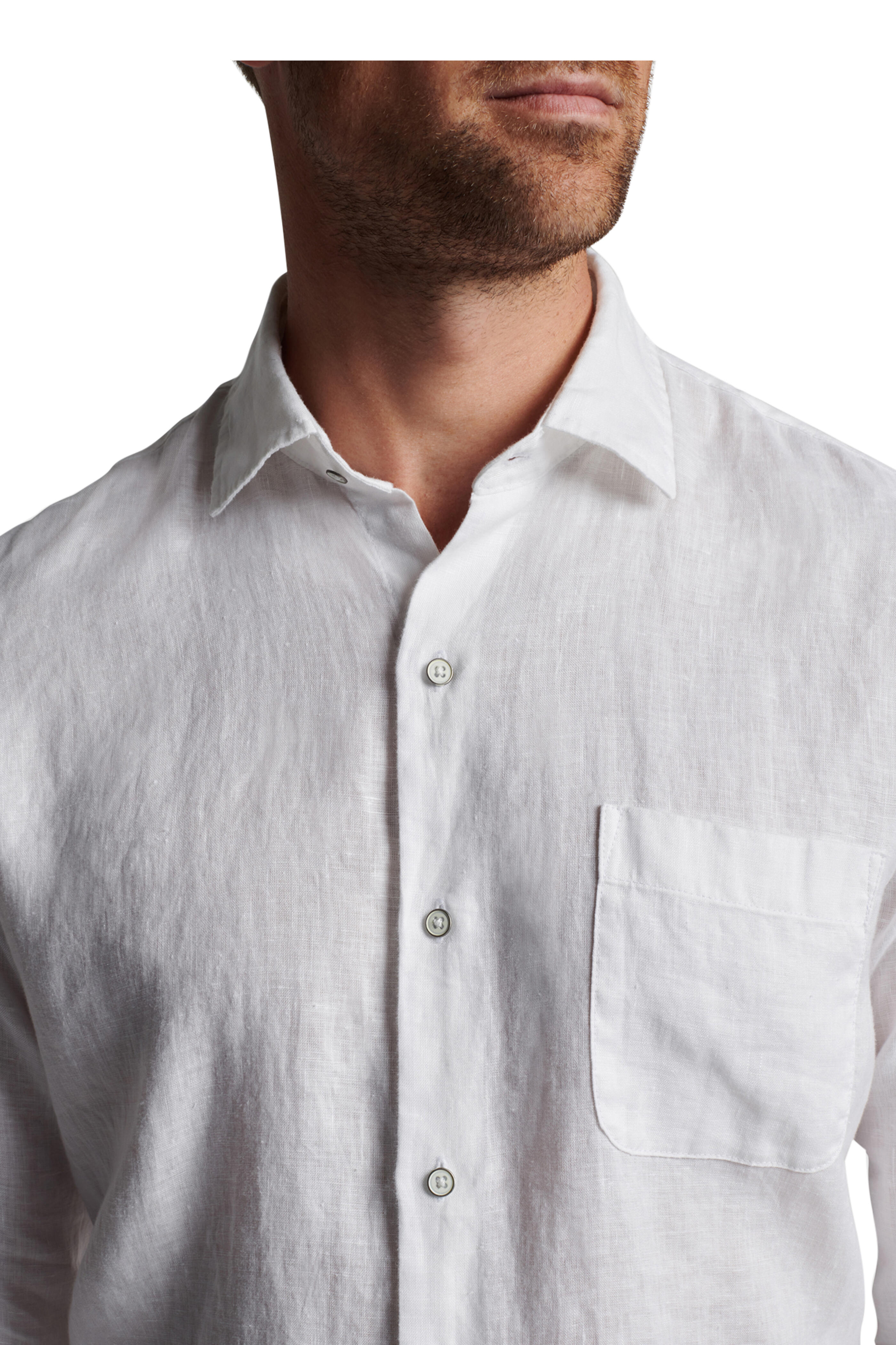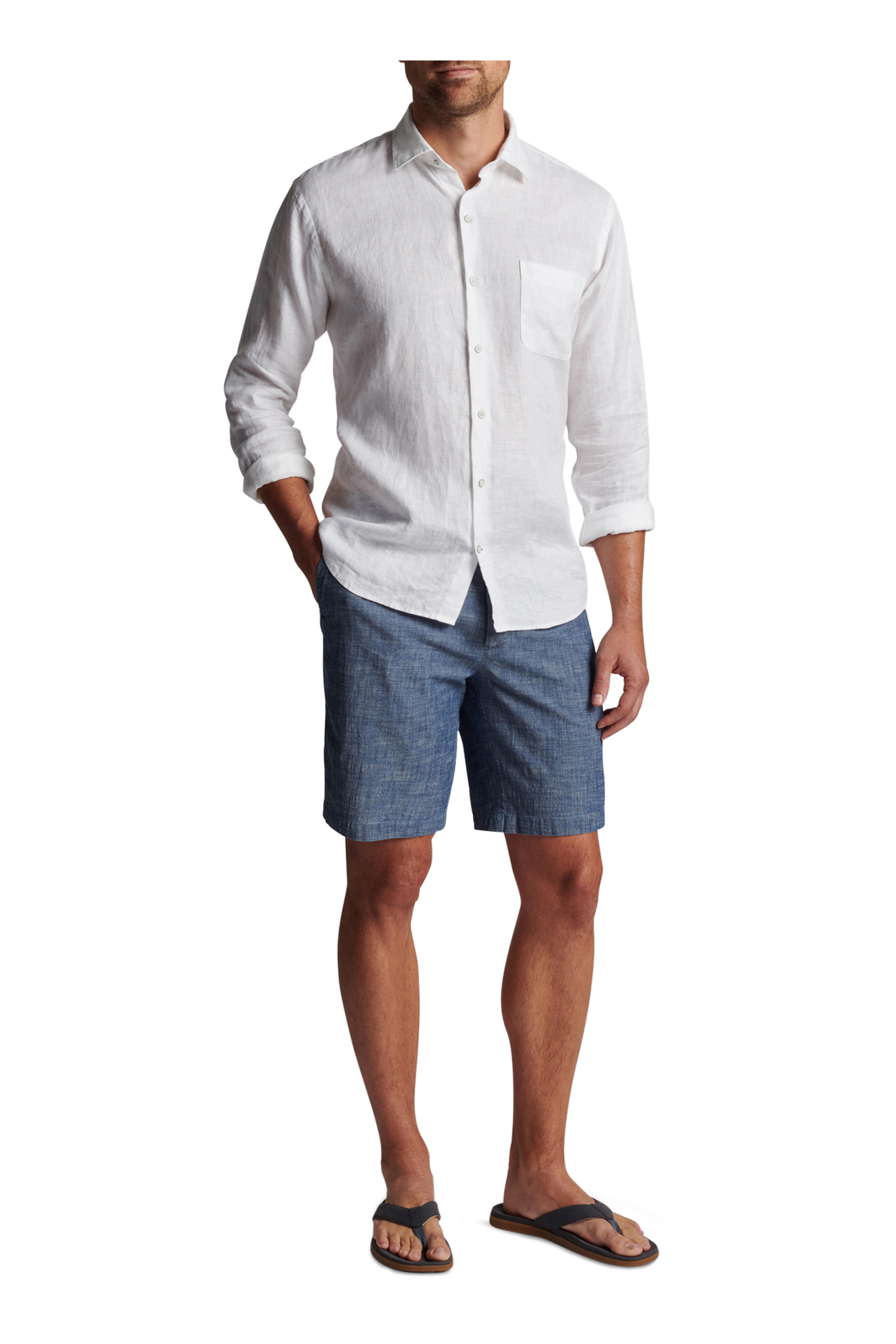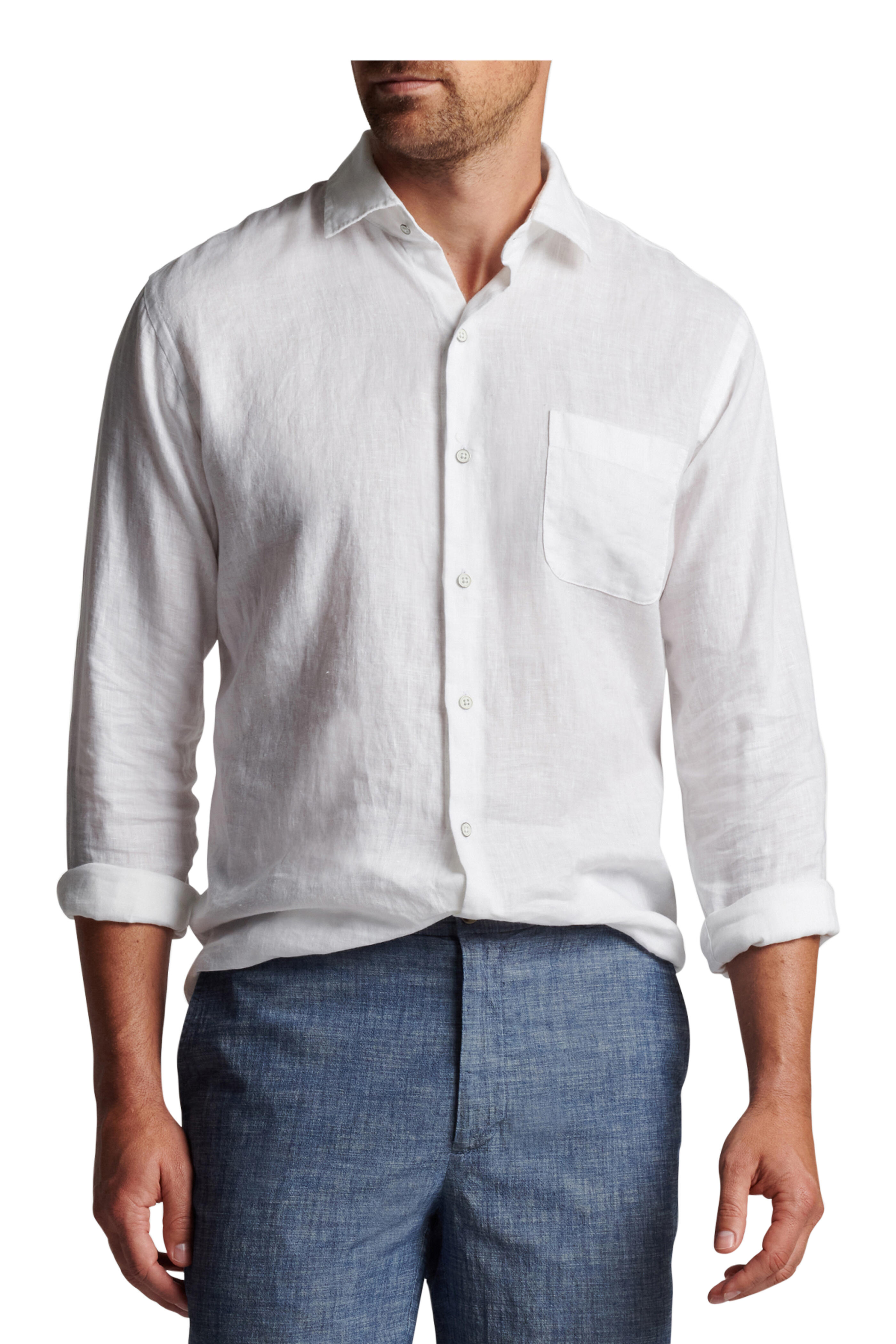 Spread collar. French placket. Double button barrel cuffs. Chest patch pocket. Imported. Classic fit. 100% linen. Hand wash.