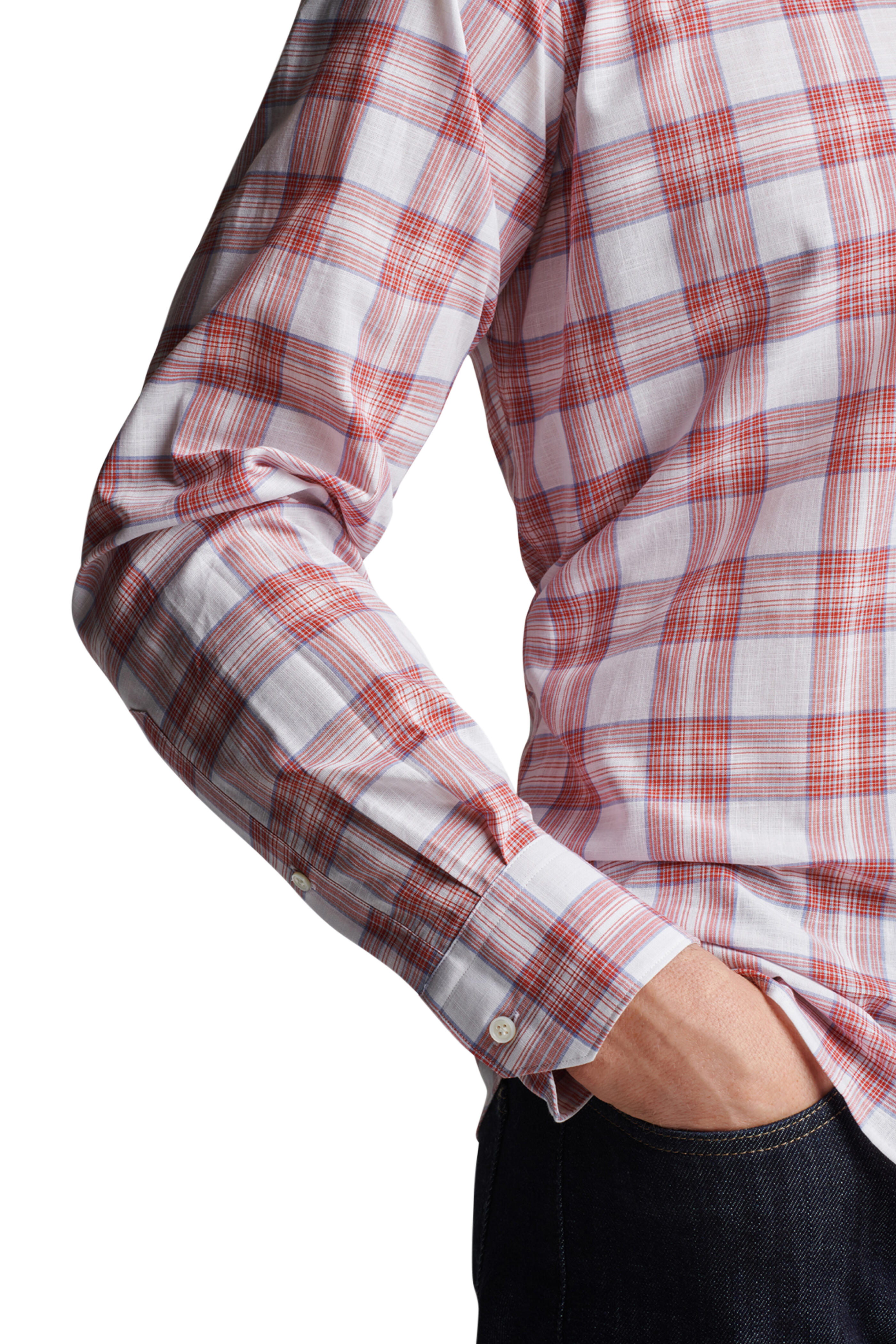 Spread collar. French placket. Double button mitered cuffs. Imported. Color: Red Pear. Tailored fit. 100% cotton. Machine wash.