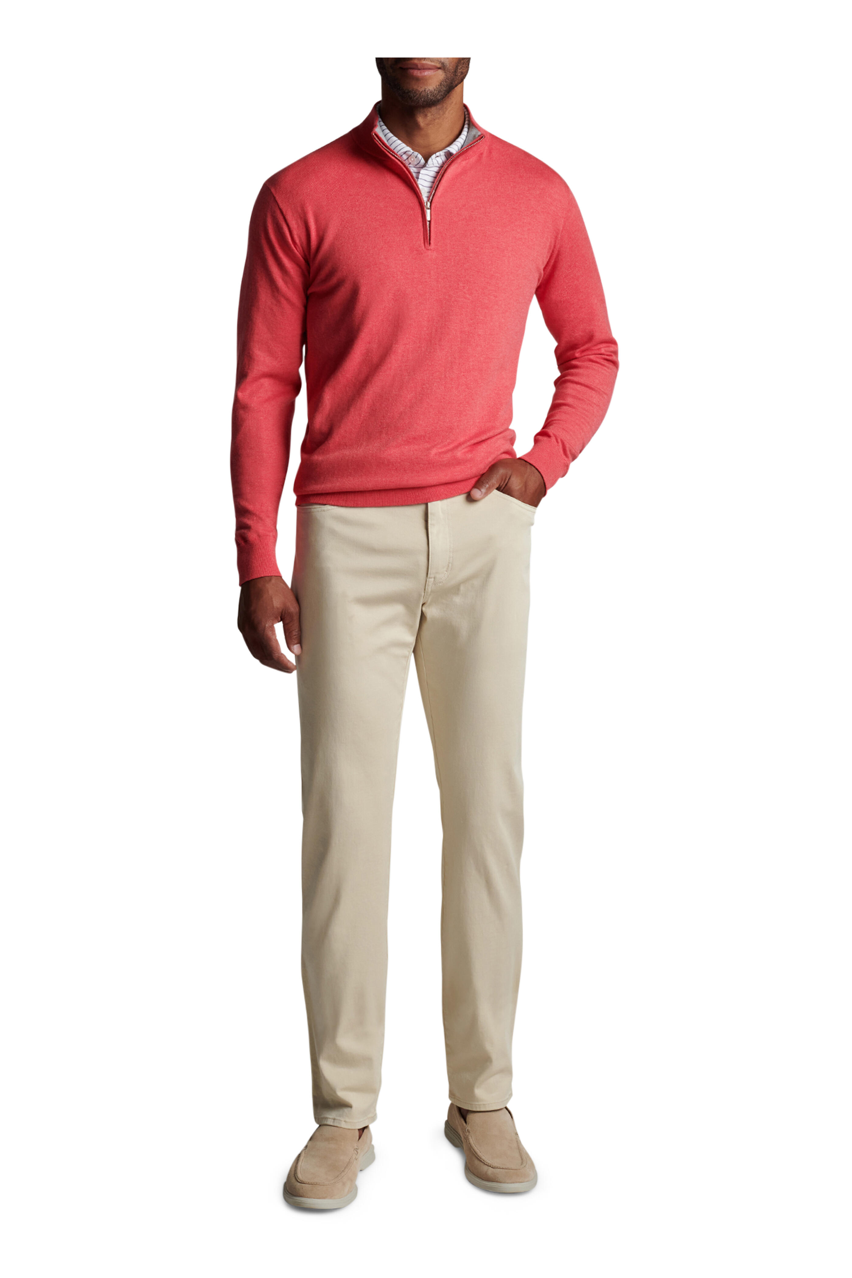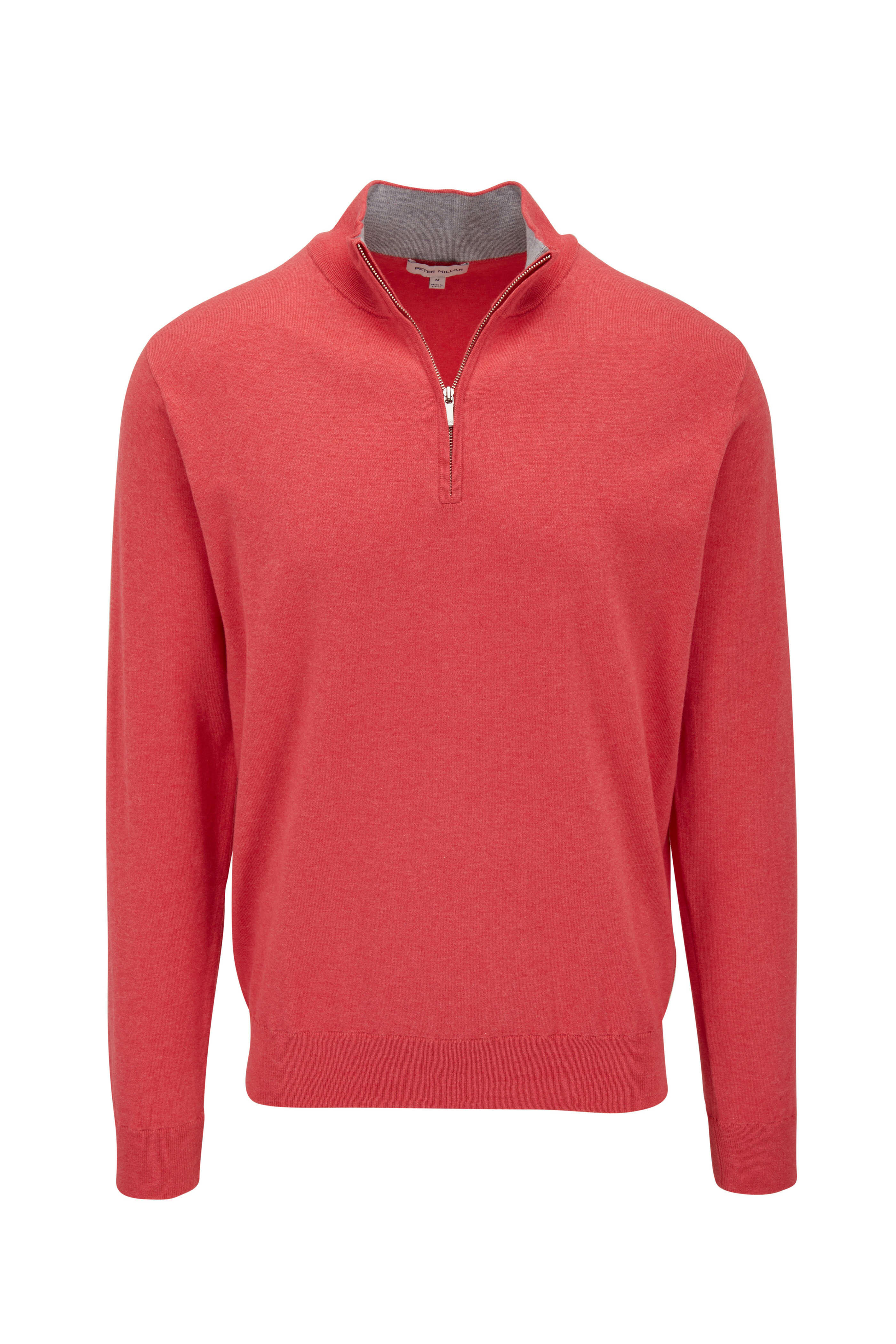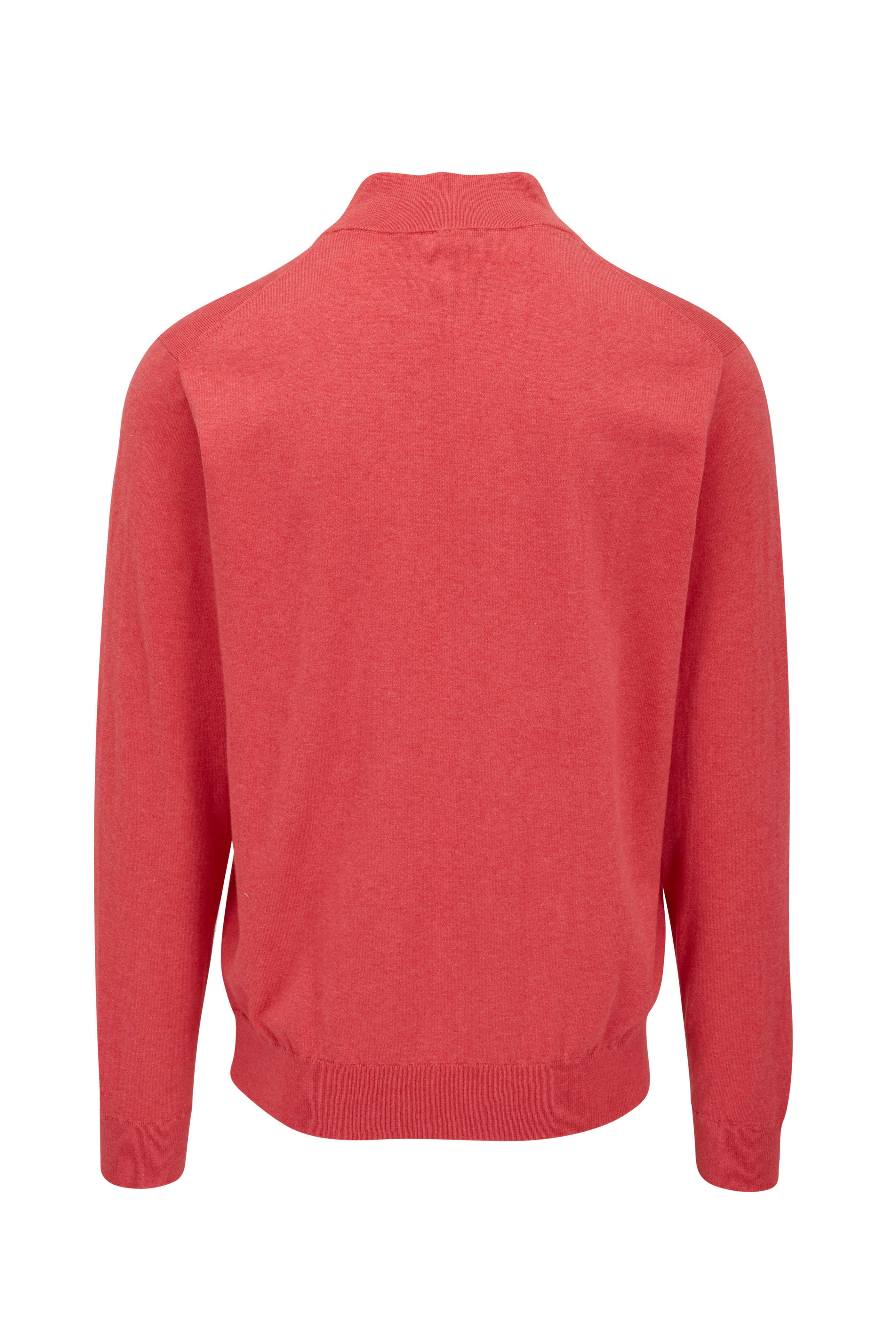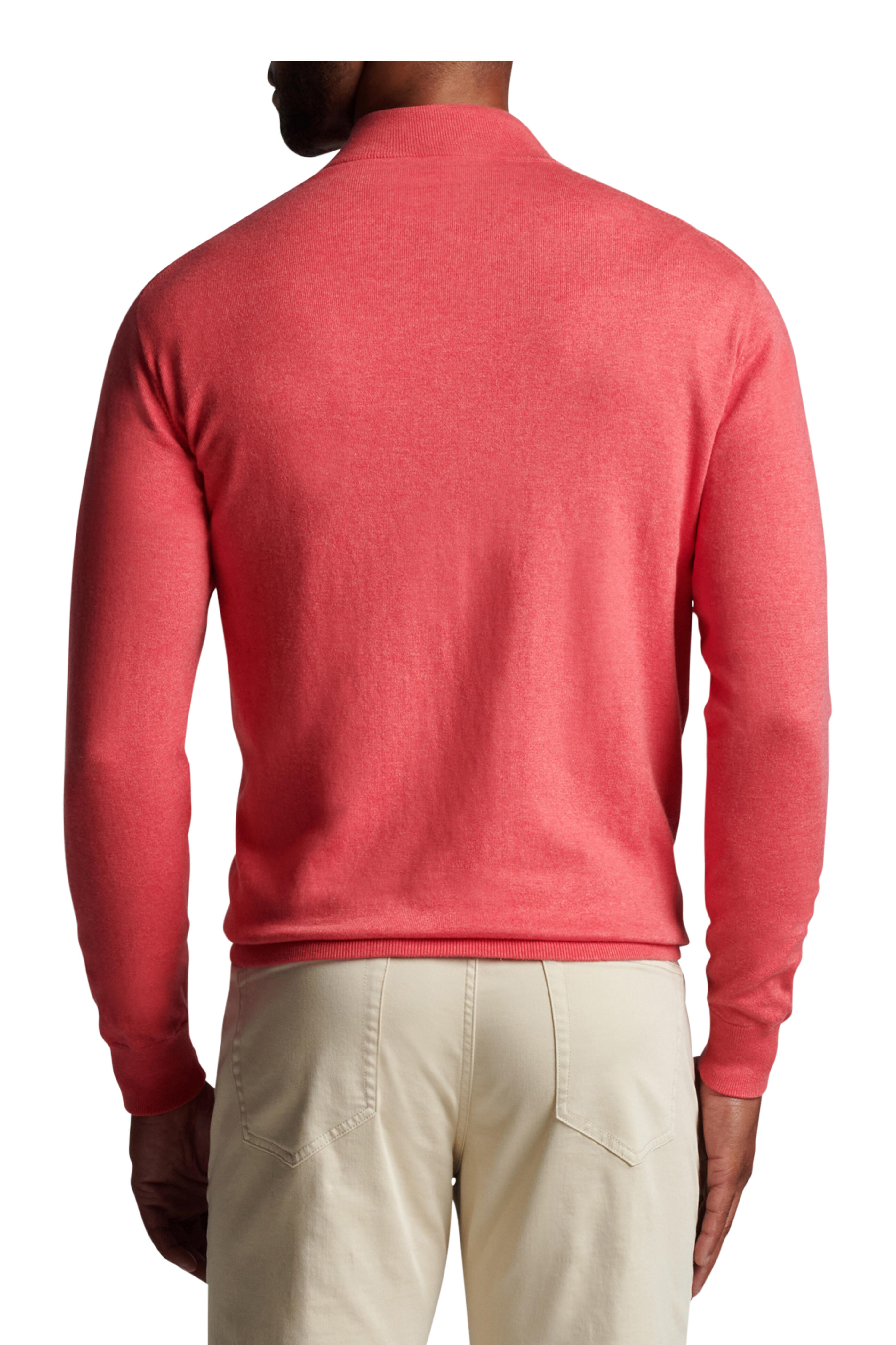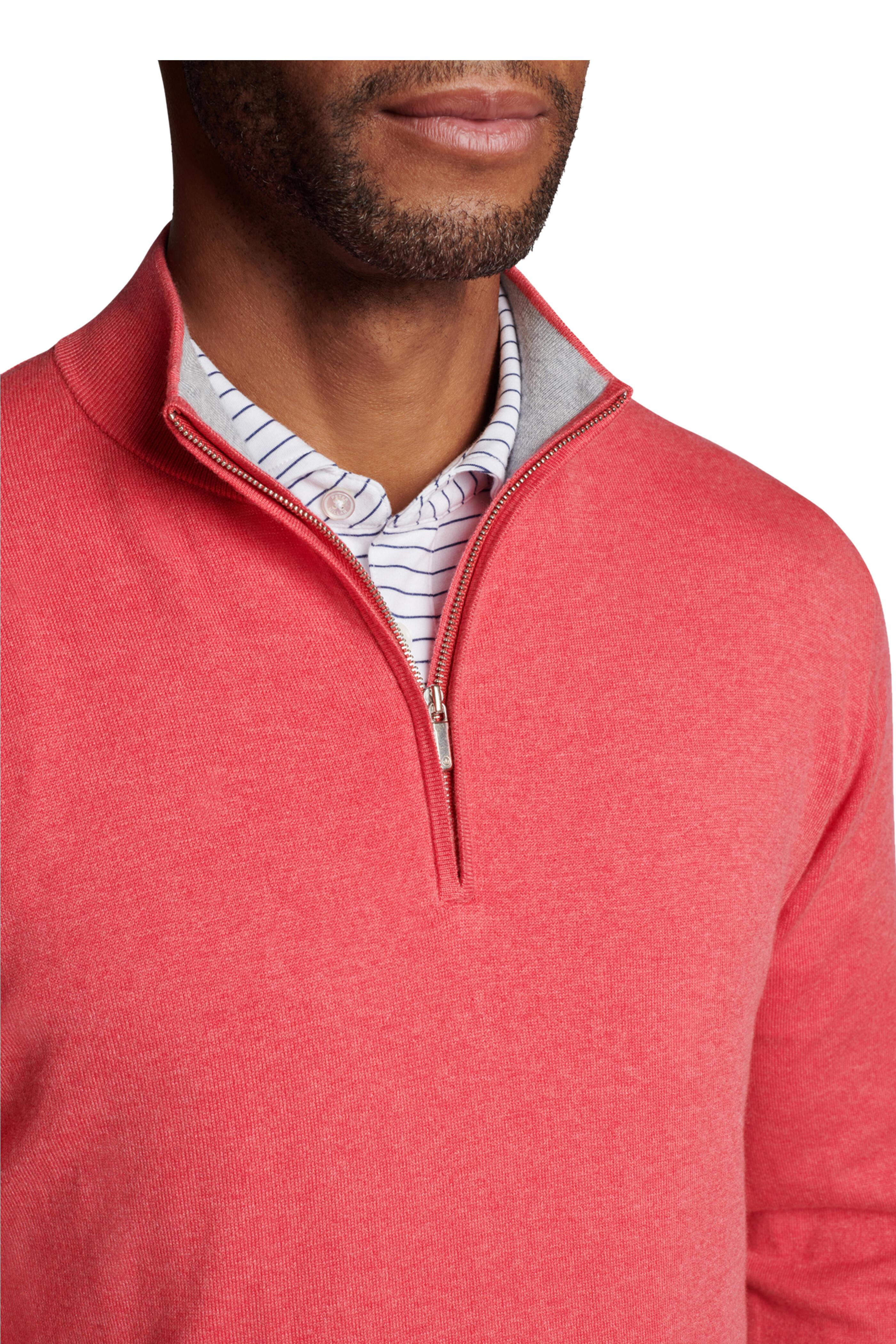 Stand collar. Quarter zip placket. Ribbed trim. Imported. 53% cotton, 22% lyocell, 20% nylon, 5% silk. Hand wash.