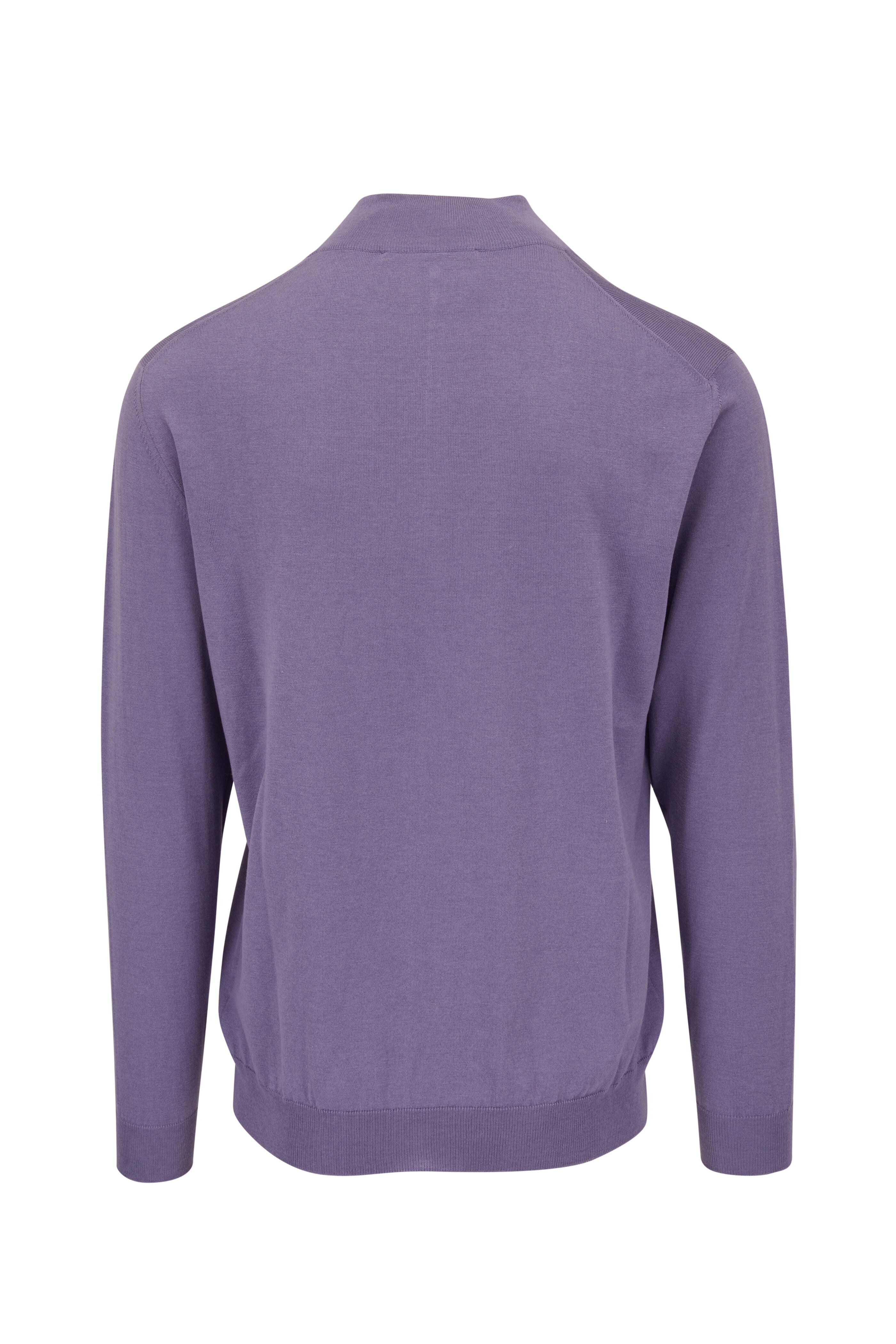 Mockneck. Quarter-zip. Ribbed trims. Made in Italy. 55% silk, 45% cotton. Machine wash.