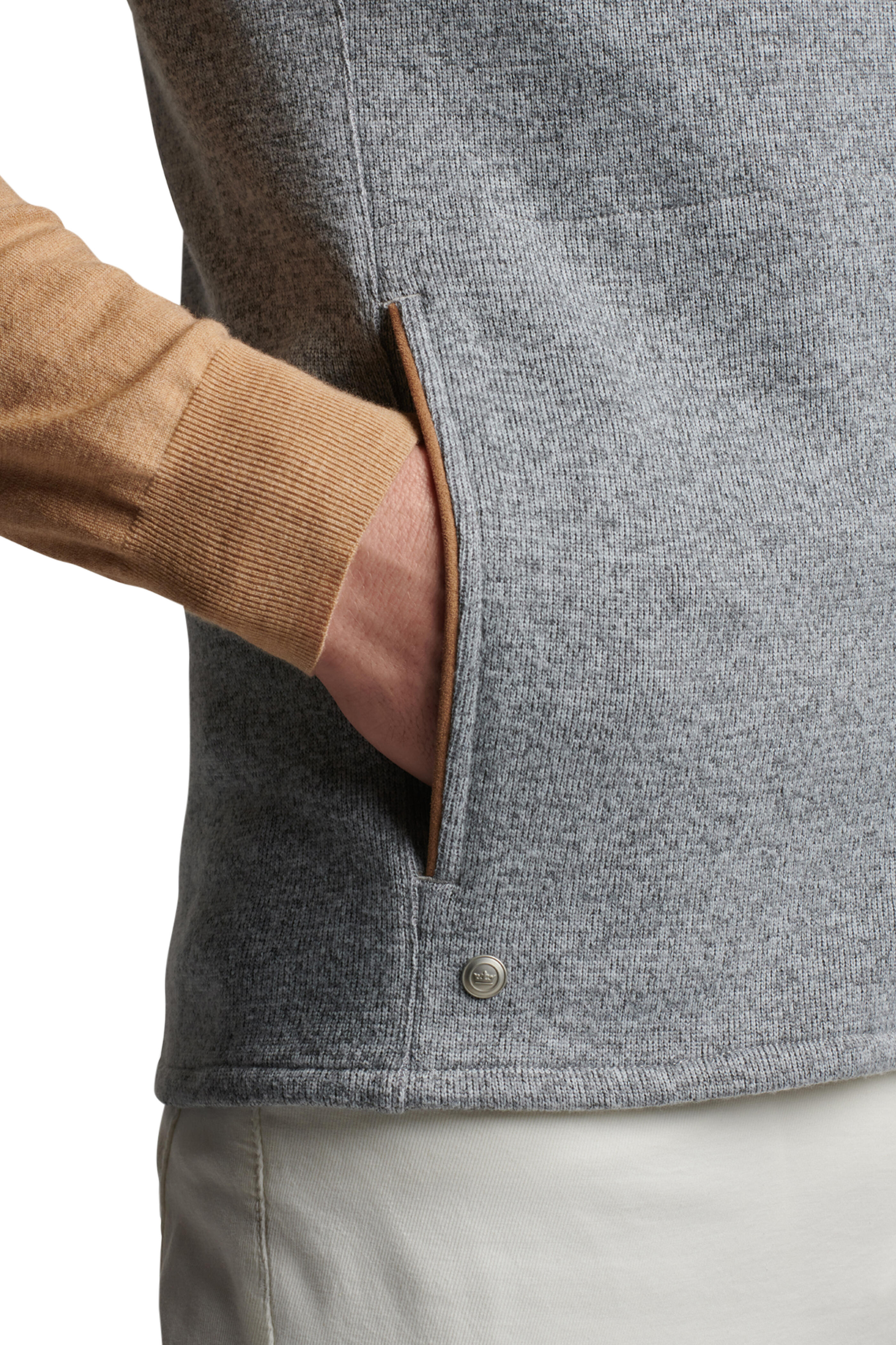 Stand collar. Two-way front zip. Faux suede details. Side slip pockets. Imported. Tailored fit. 100% polyester. Dry clean.
