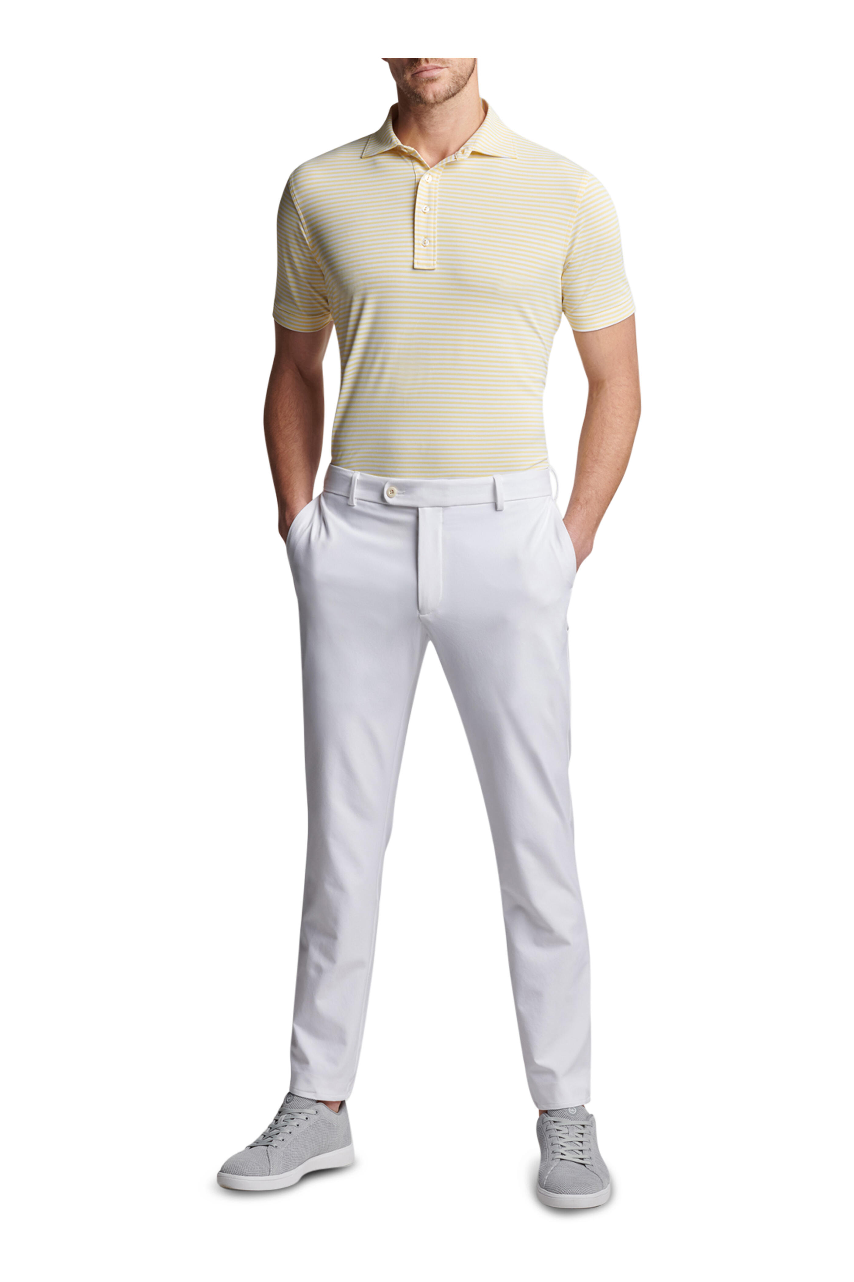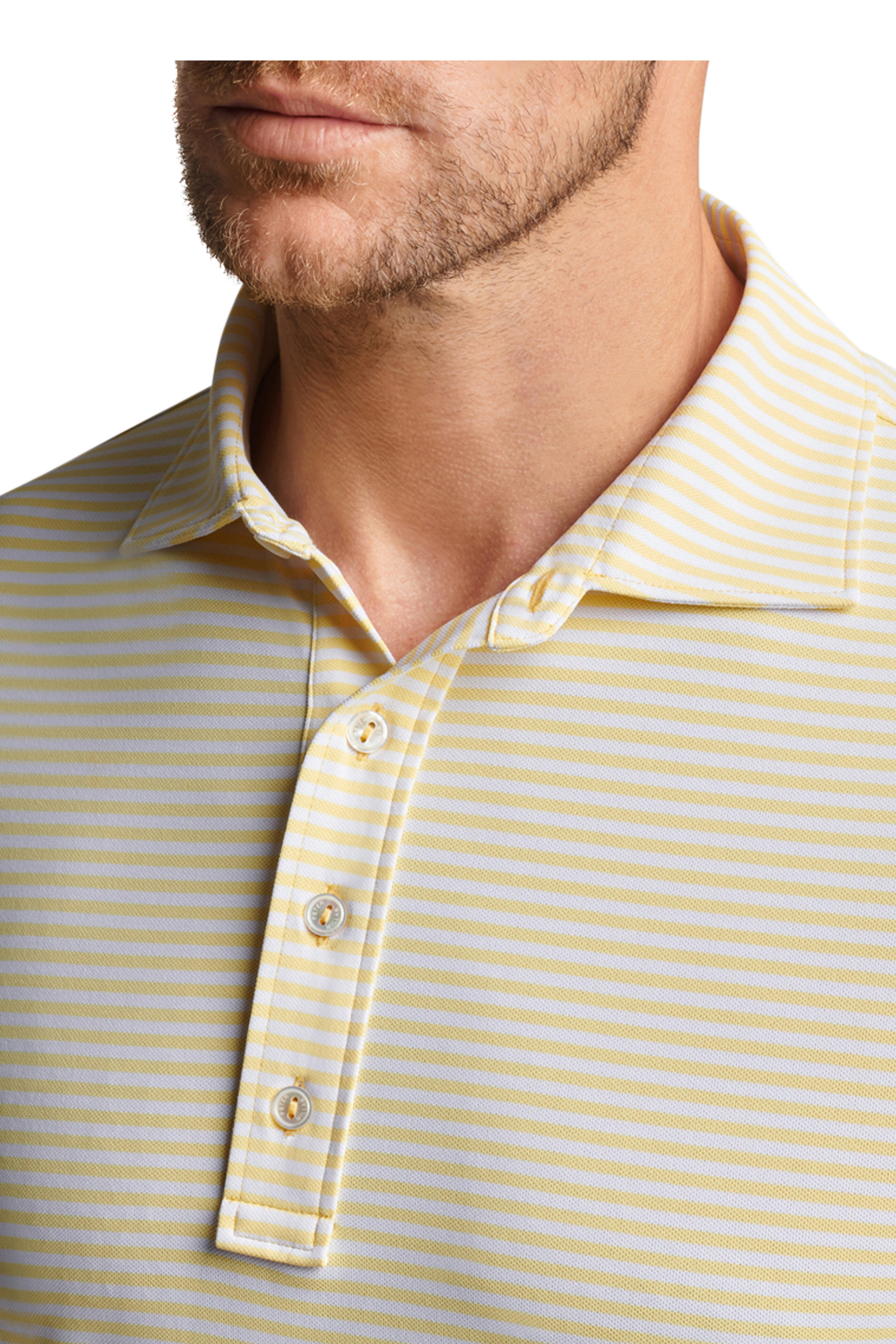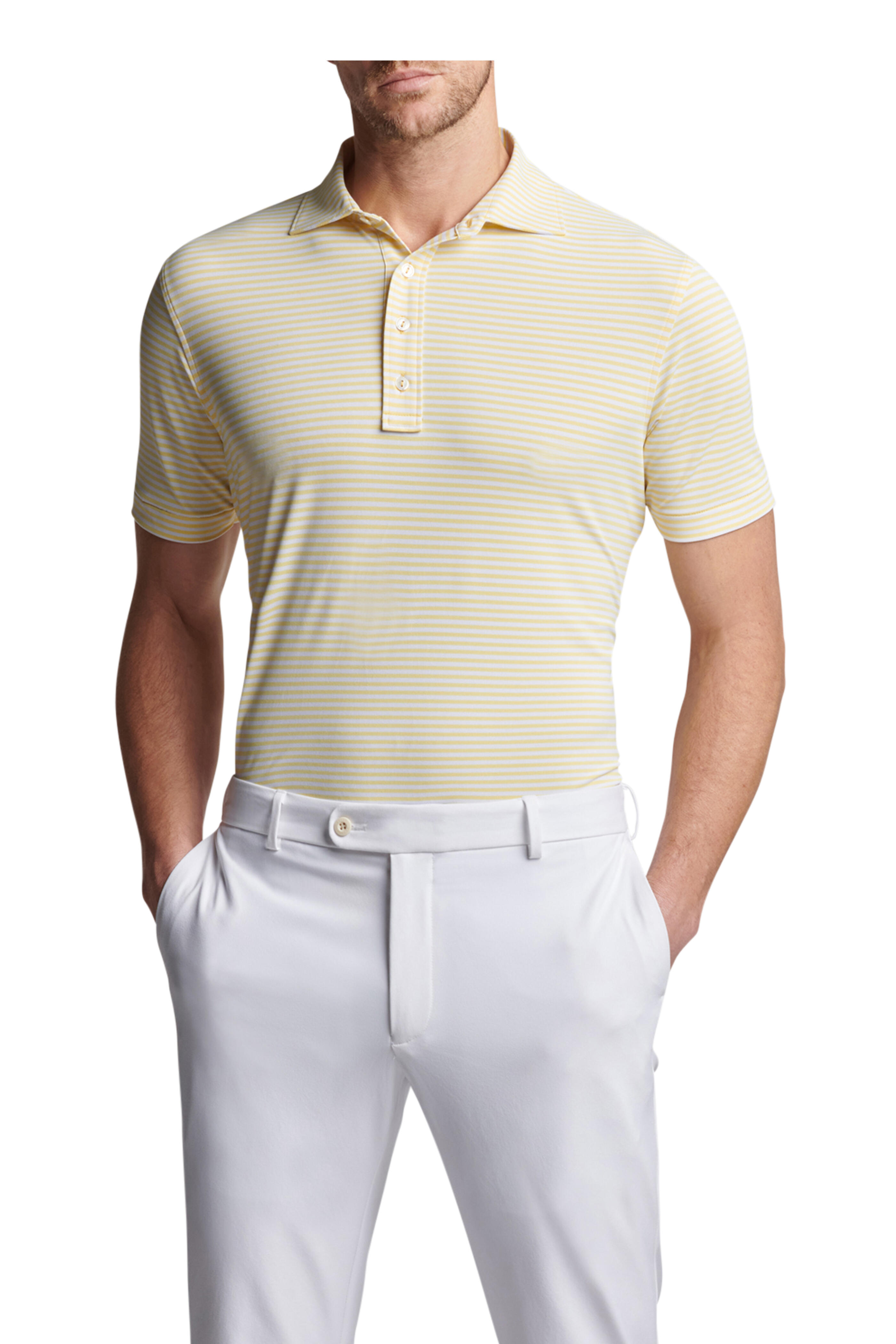 Edwin self-fabric spread collar. Two-button placket. Four-way stretch. Moisture wicking. Imported. Tailored fit. 94% polyester, 6% spandex. Machine wash.
