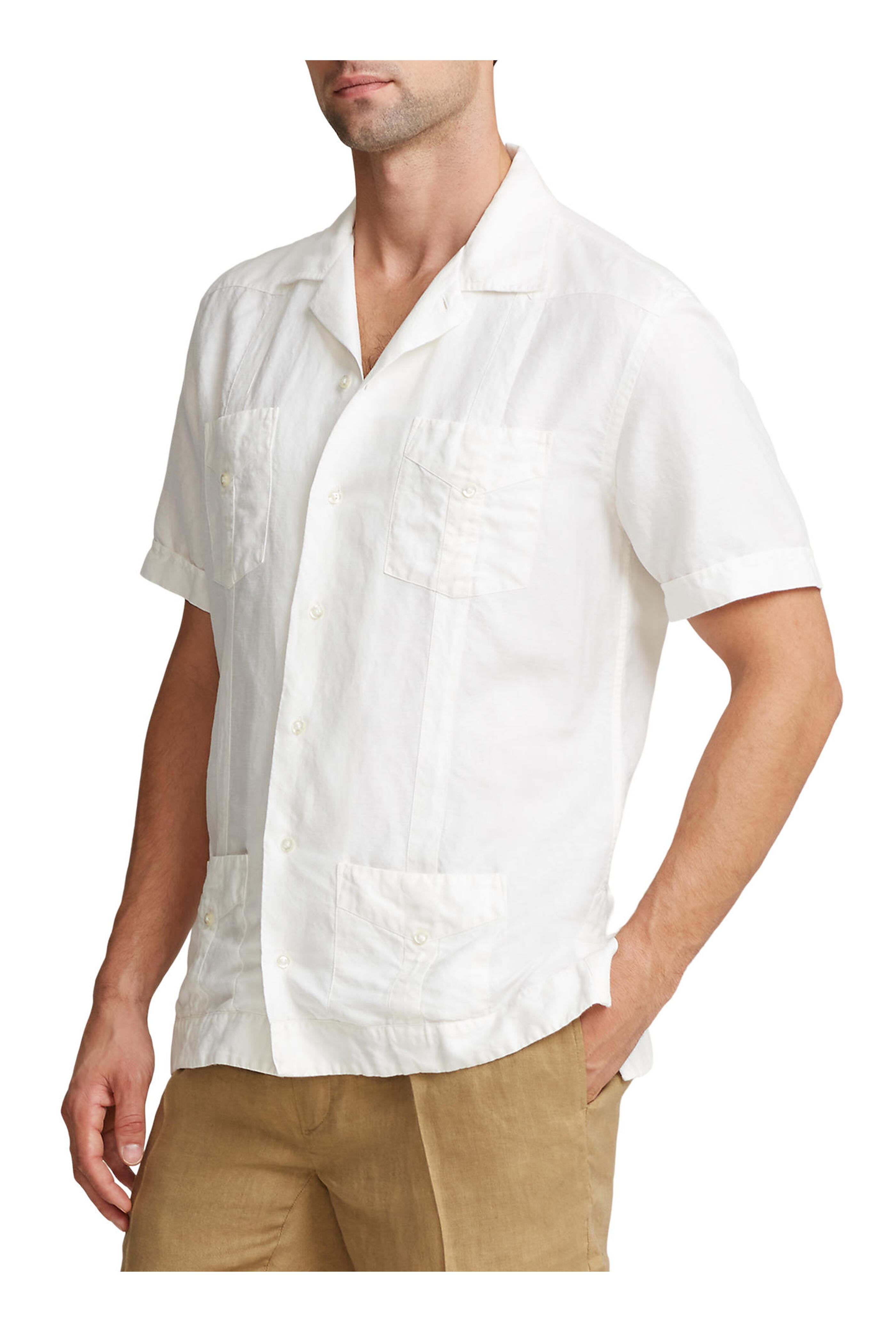 Camp collar with a horizontal buttonhole. Front button placket. Short sleeves. Two chest patch pockets; two front waist patch pockets. Vented hem. Made in Italy. 100% linen. Machine wash.
