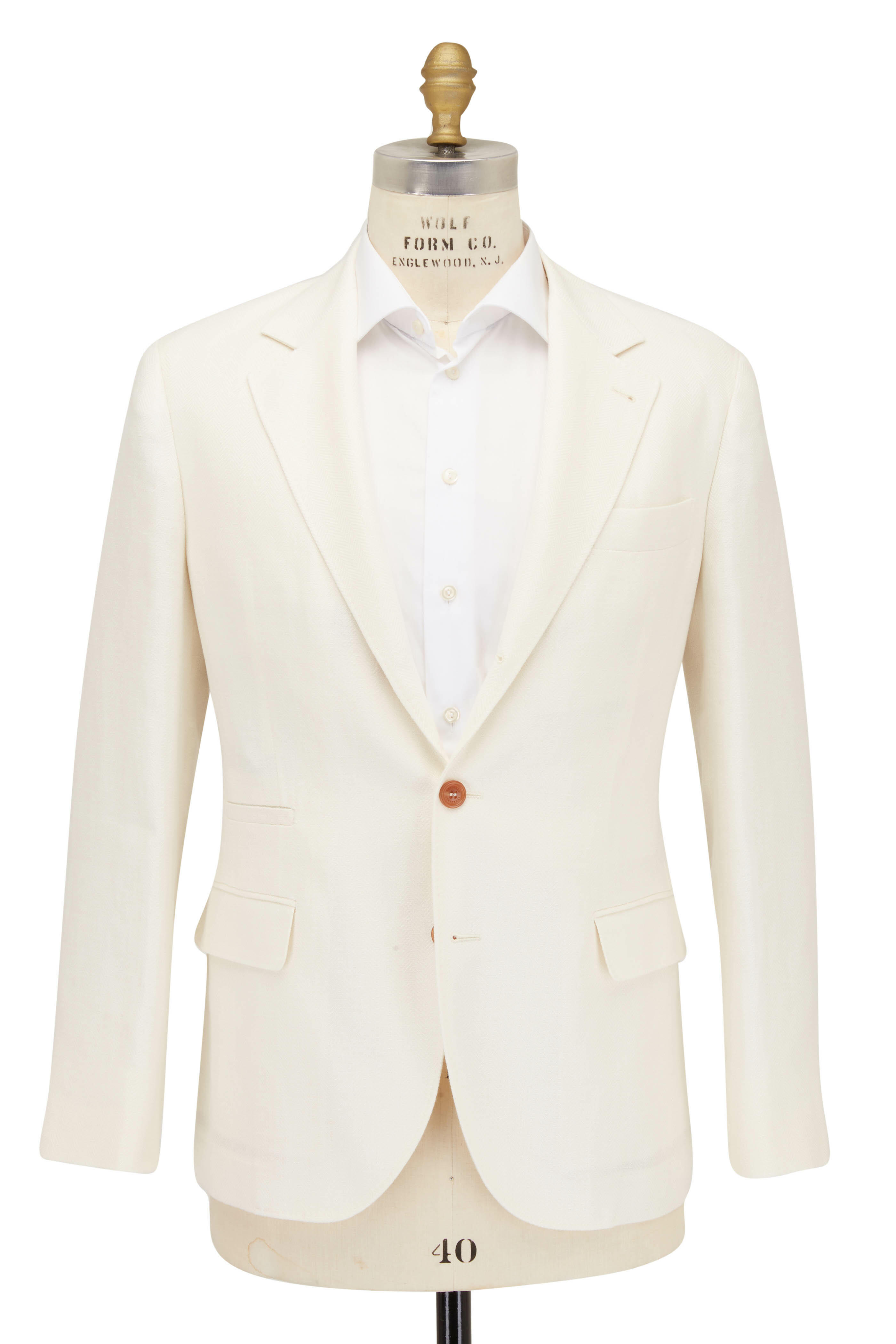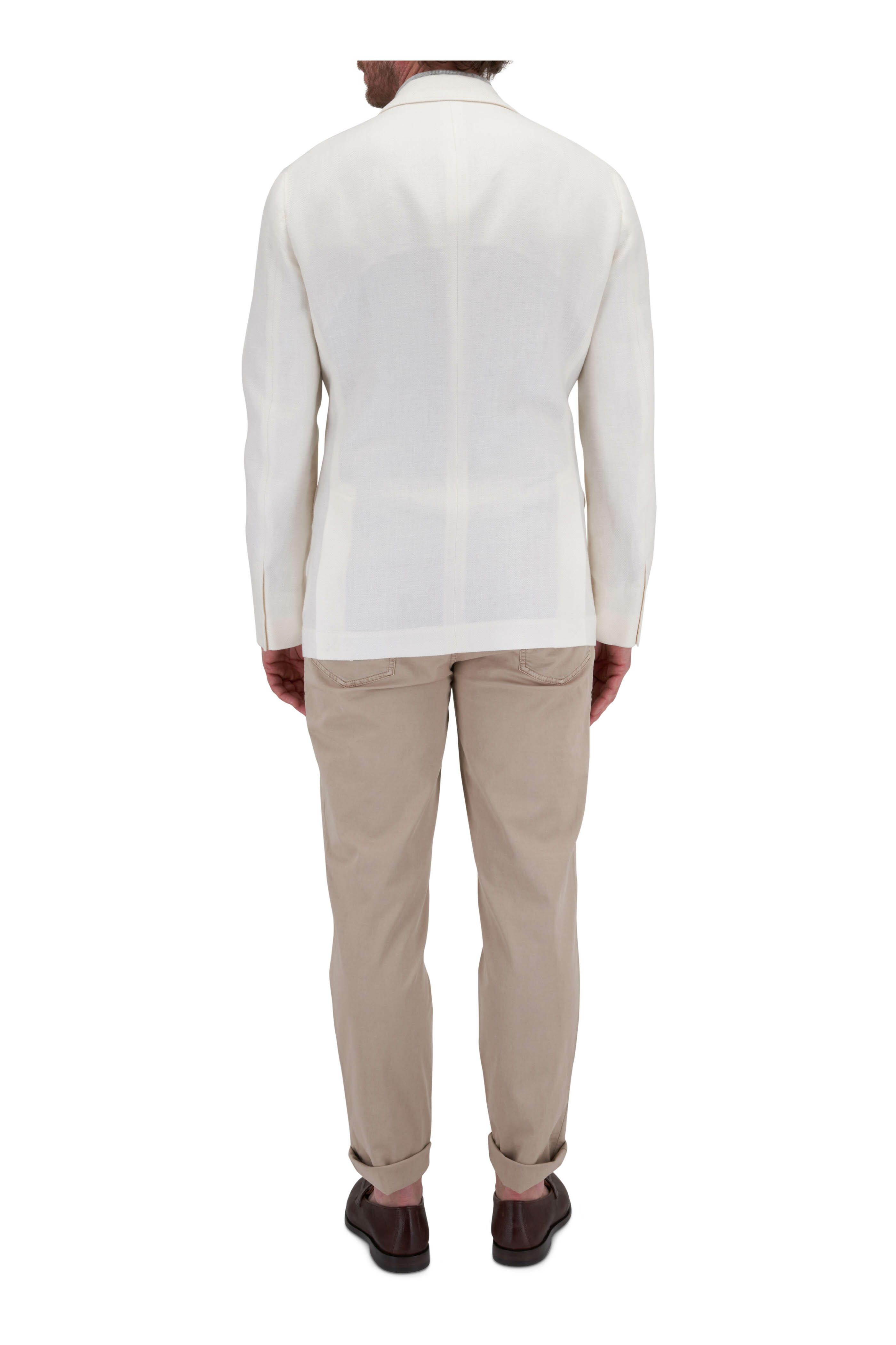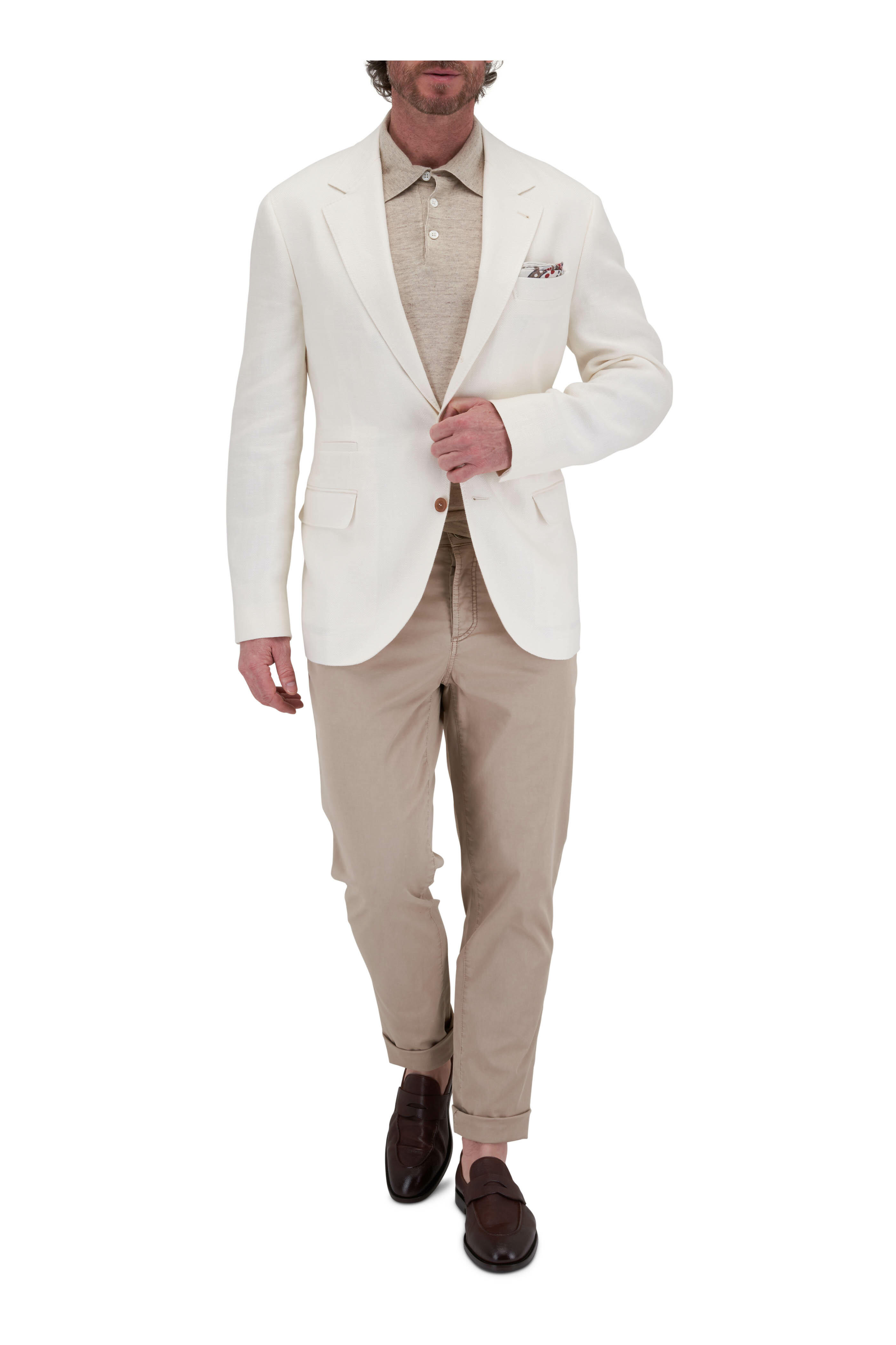 Notched lapels. Two button closure. Lower flap pockets; lower & chest welt pocket. Double vent. Made in Italy. 74% linen, 24% wool, 2% silk; partially lined. Dry clean.