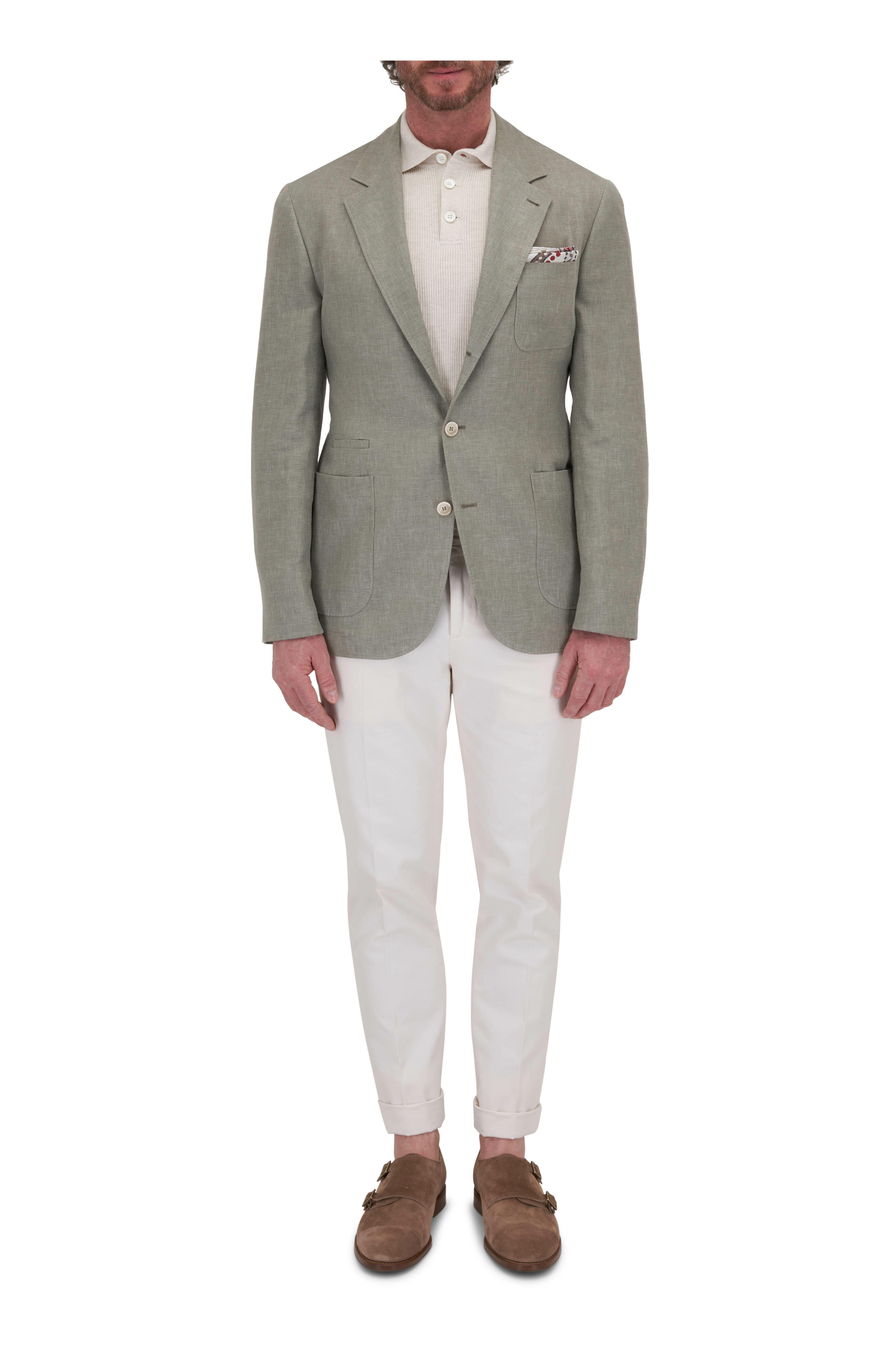 Spread collar. Three button placket. Ribbed cuffs & hem. Made in Italy. 100% cotton. Machine wash.