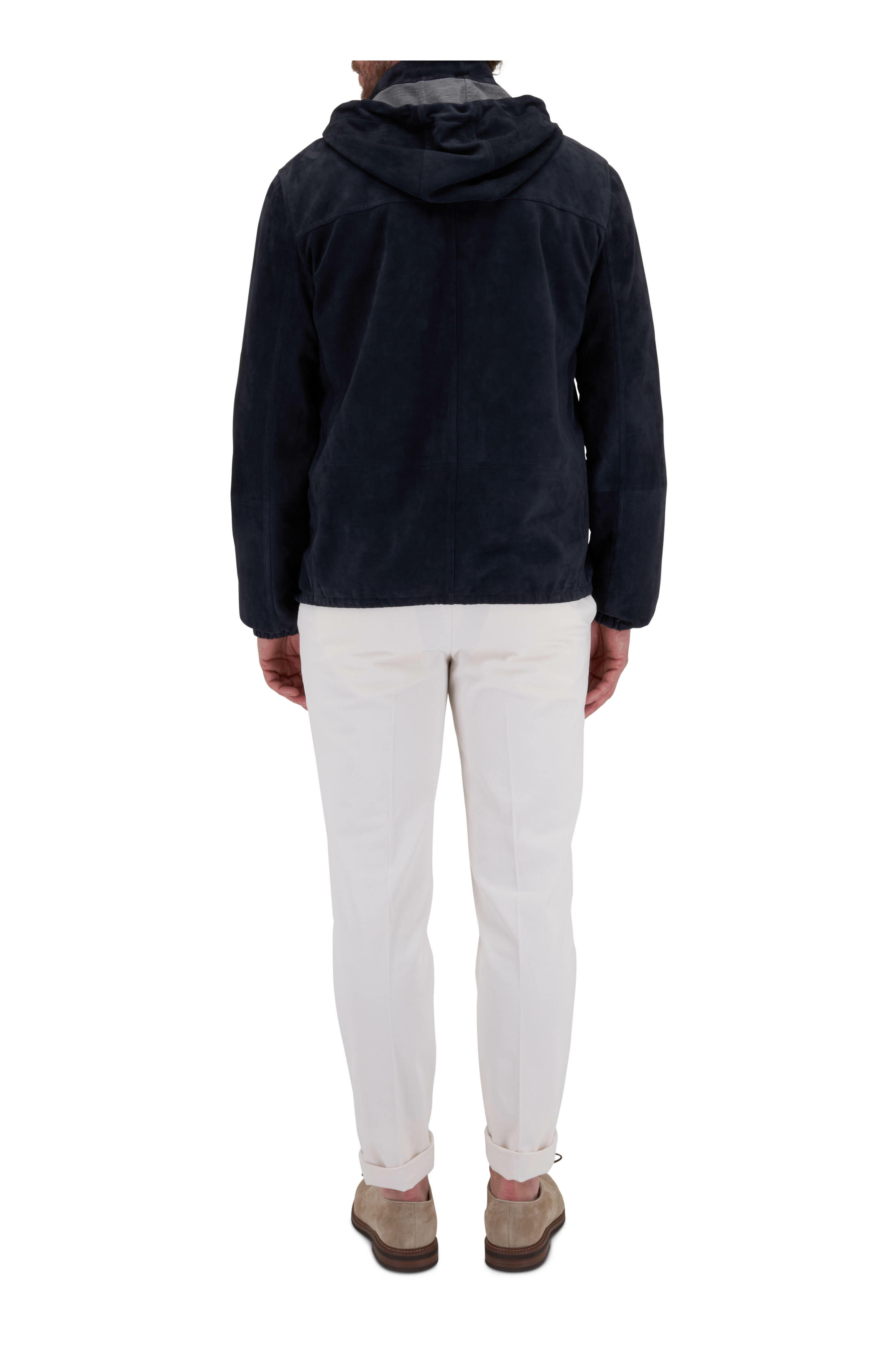 Belt loops. Zip fly; button closure. Back besom pockets; front slip pockets, ticket pocket. Made in Italy. 100% cotton. Machine wash.