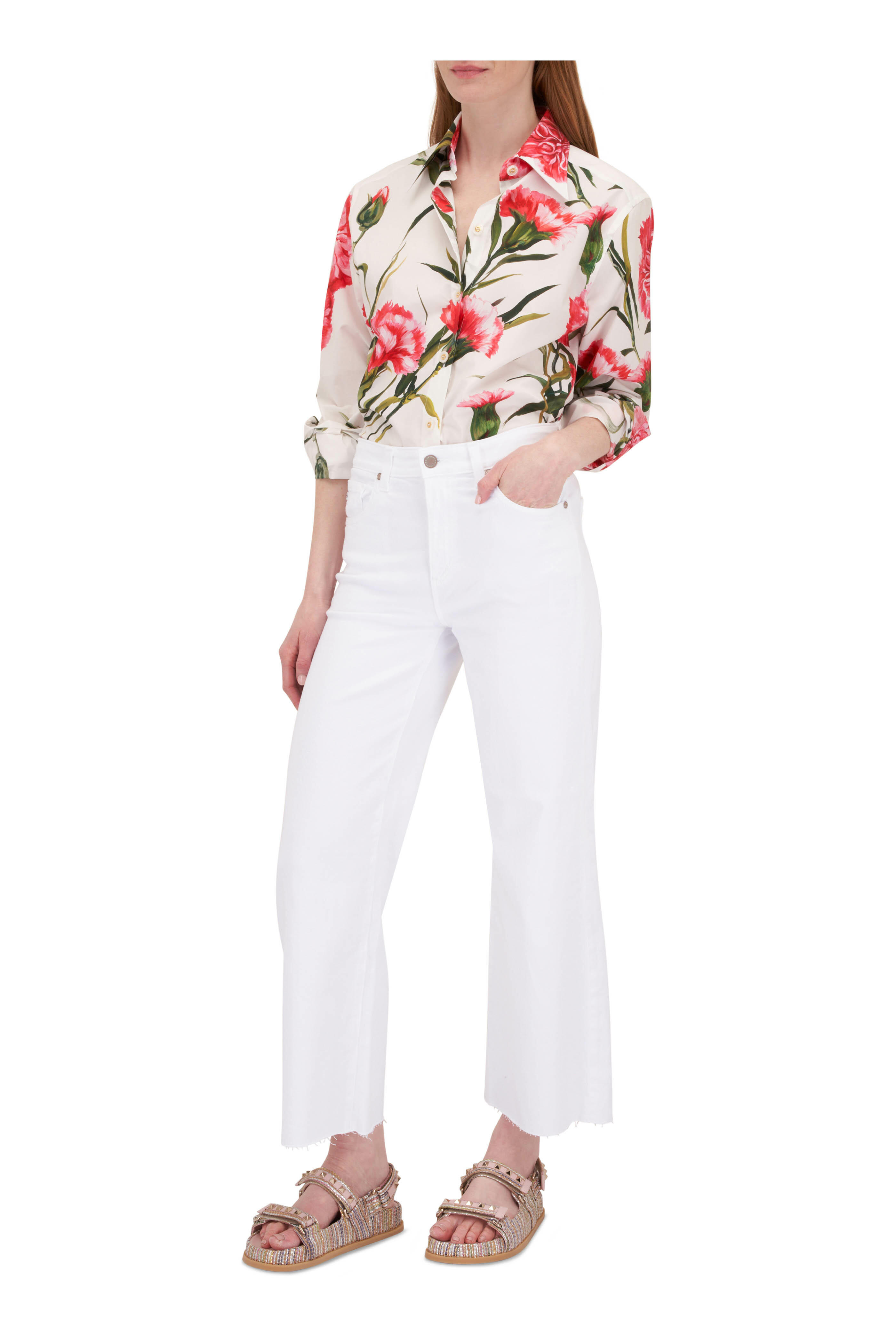 Pointed collar. Front button placket. Single button barrel cuffs. Branded button detailing. Shirttail hem. Made in Italy. 29" shoulder to hem. Oversized fit. 100% cotton. Dry clean.