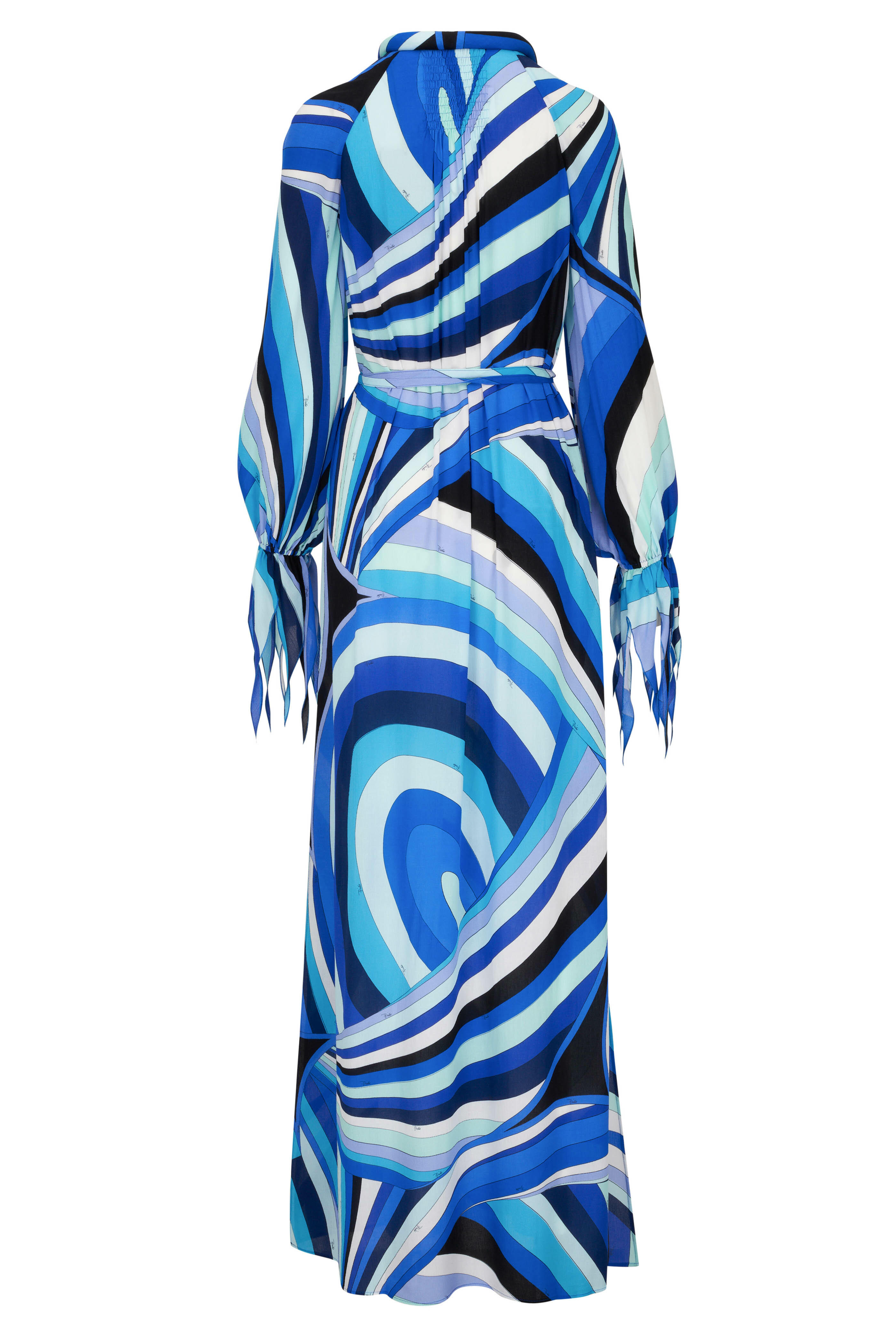 Rolled collar. Three button placket. Elasticized wrist; shredded ruffle cuff detail. Removable self-tie belt. Vented hem. Made in Italy. 63" shoulder to hem. 100% viscose. Dry clean.